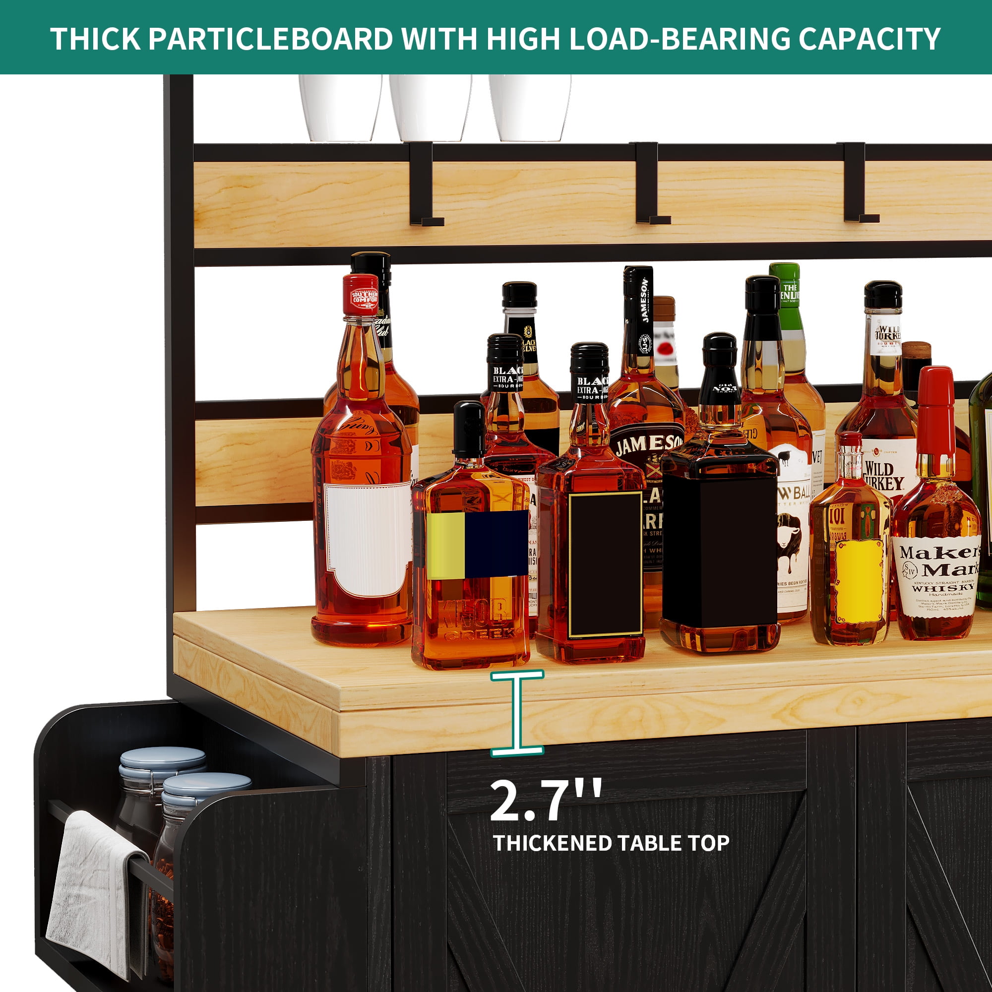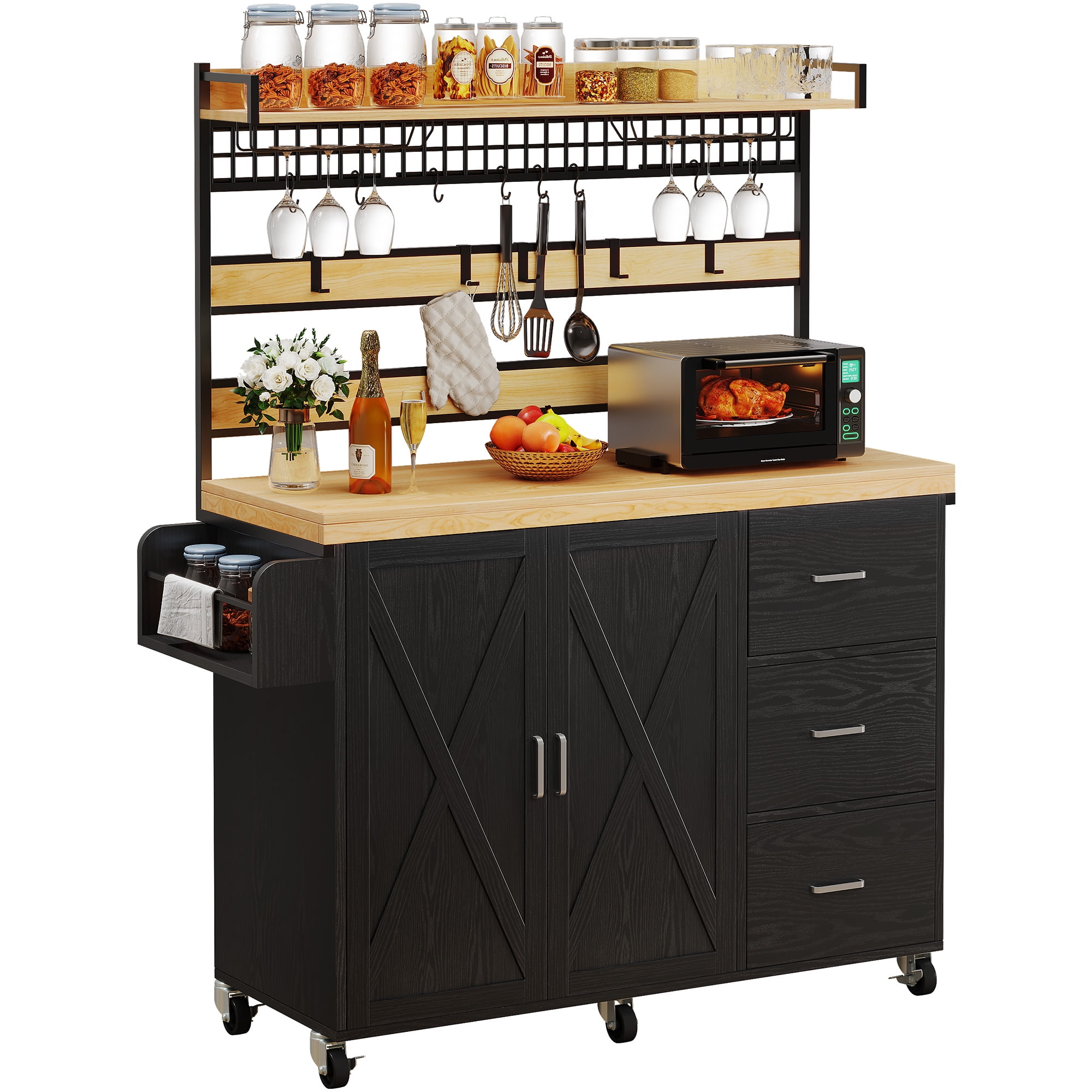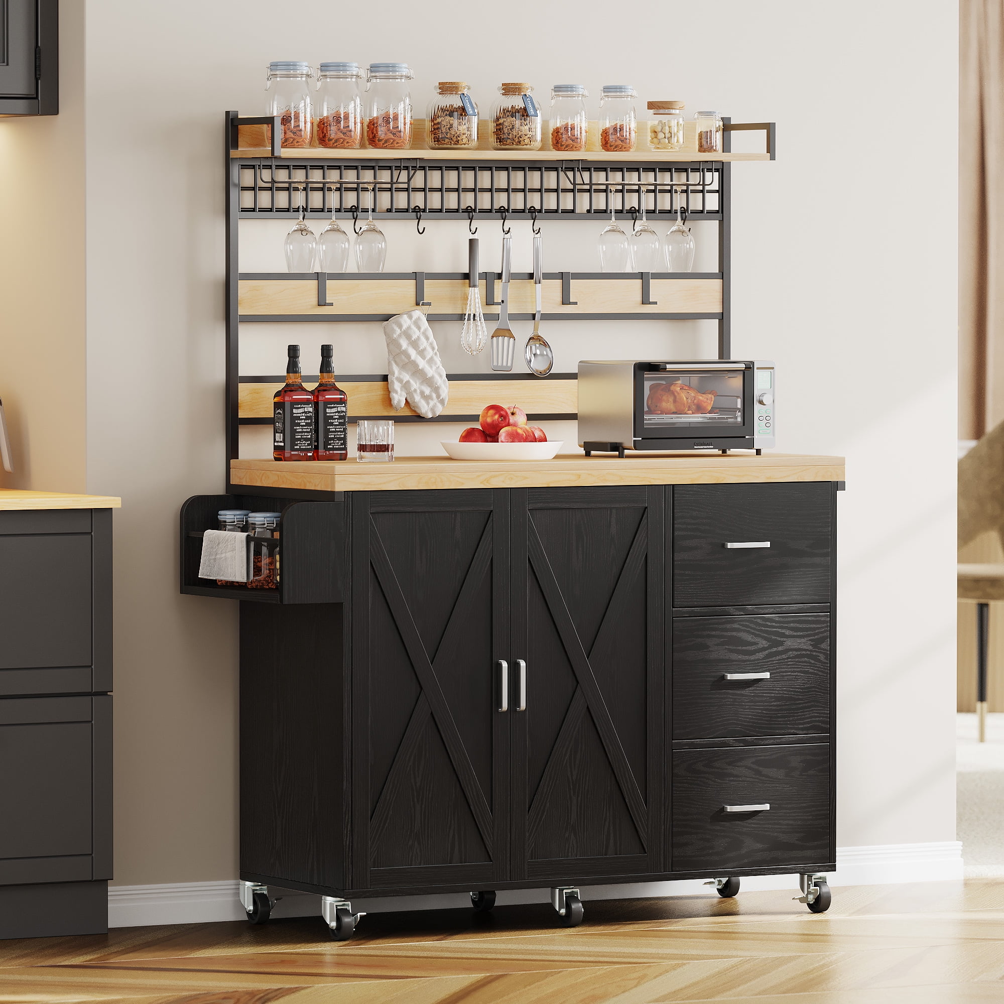 DEXRTUS 47″ Kitchen Bakers Rack with Storage Cabinet and 3 Drawers, Kitchen Storage Cart with 10 Hooks and Spice Rack, Black
