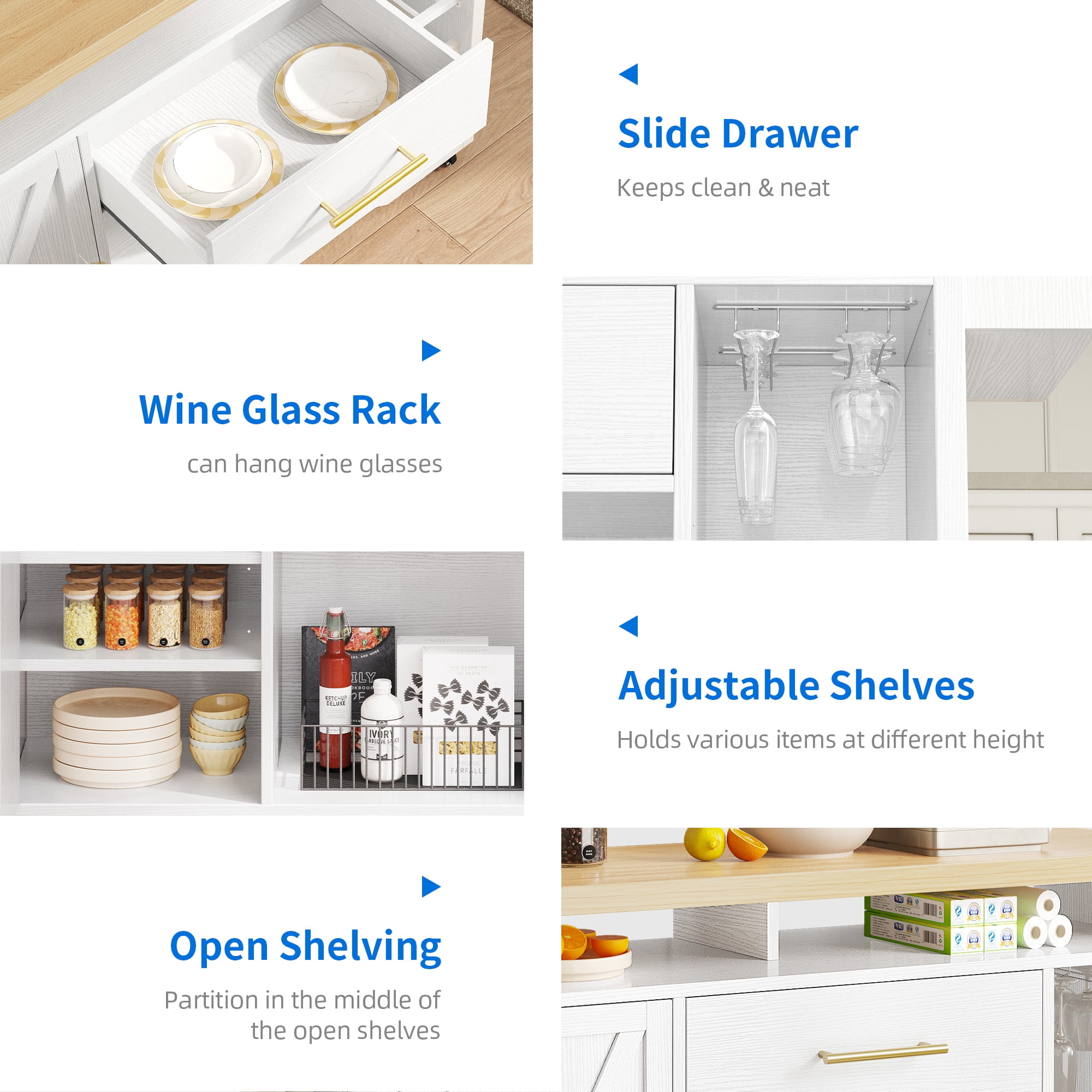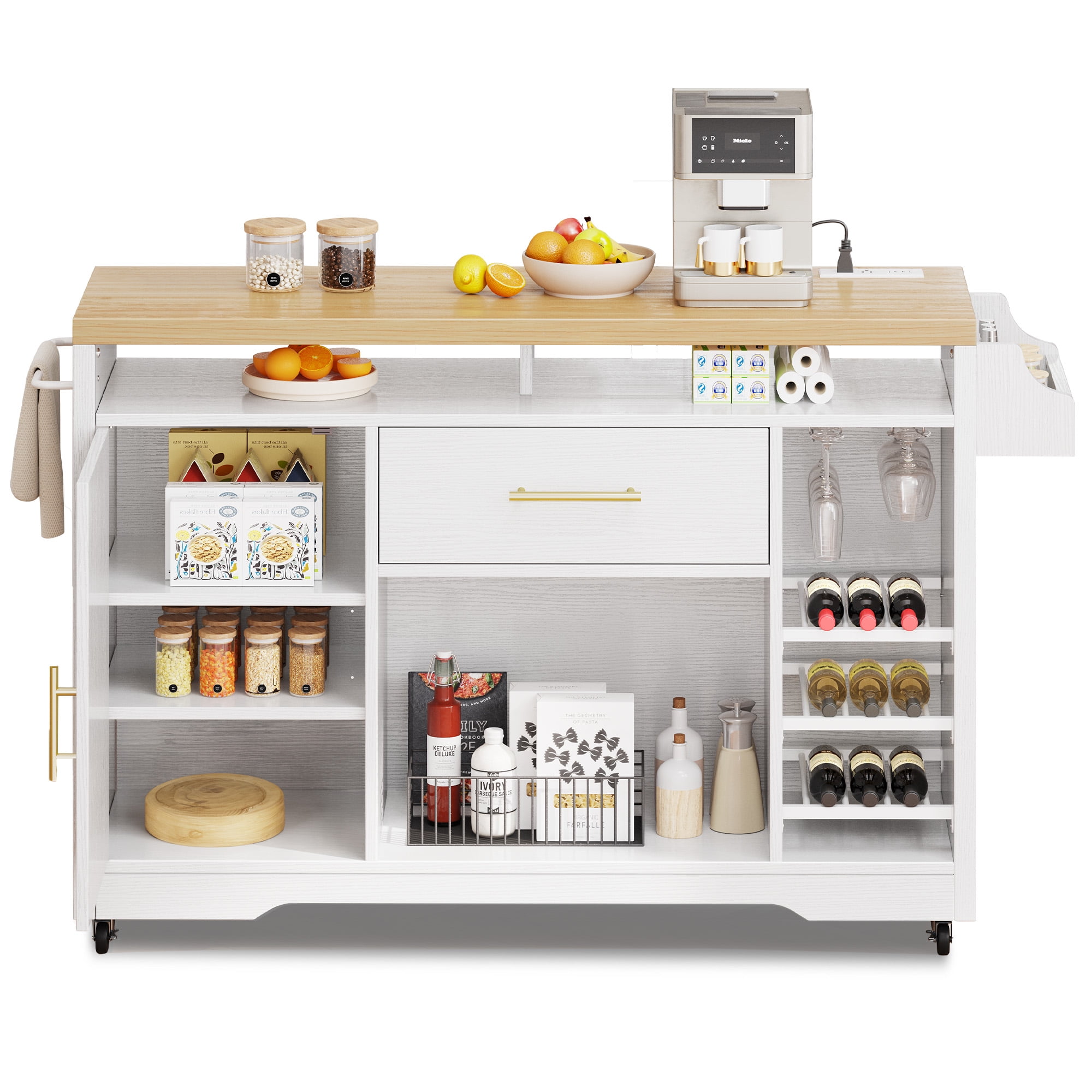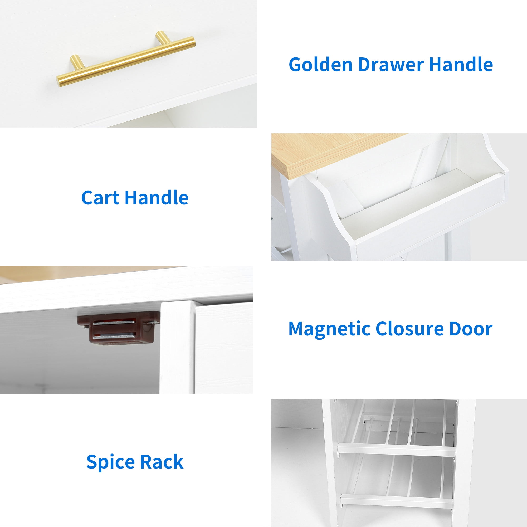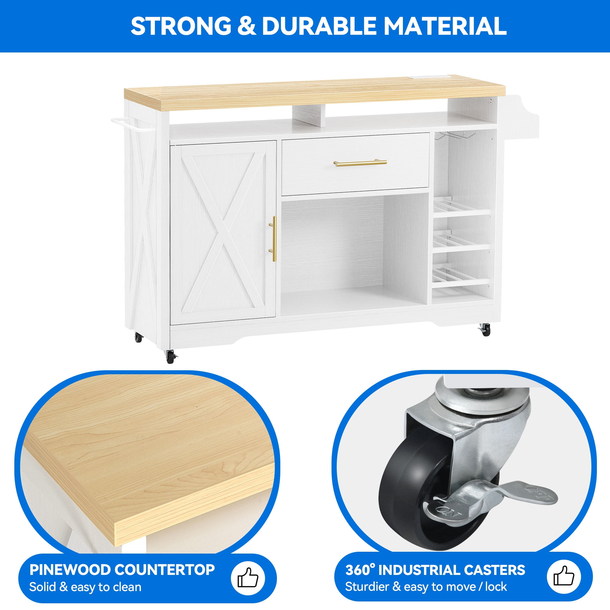 [Multifunctional kitchen island] Features a drawer, a spacious storage cabinet, towel rack, wine rack, goblet holder and spice rack, providing ample storage space for all kitchen essentials and dining supplies. The spacious countertop offers a convenient space for placing small appliances such as a microwave or toaster. [Convenient Charging Station] Equipped with 2 AC power outlets, 2 USB ports, and a 6.56-foot power cord, supplying power to up to 4 devices simultaneously. Charging your devices becomes effortless without the hassle of relocating them. [Exceptional Material with Magnetic closure] The thick solid wood top, supported by 4 sturdy legs and P2-grade MDF board, withstand up to 300lbs weight without wobbling. ensures both durability and stability. The magnetic closure system not only offers a quieter closing experience but also reduces damage during use compared to regular handles. [Easy to Clean & Maintainance] The 1.37″” thick pine wood top of this kitchen cart is waterproof and scratch-resistant, thanks to its smooth and food-safe surface. It facilitates easy cleaning of the countertop after food preparation. [Adjustable Shelving] The kitchen island cart features 3 adjustable shelves, allowing you to customize the height to accommodate kitchen utensils of different sizes, catering to your specific needs.