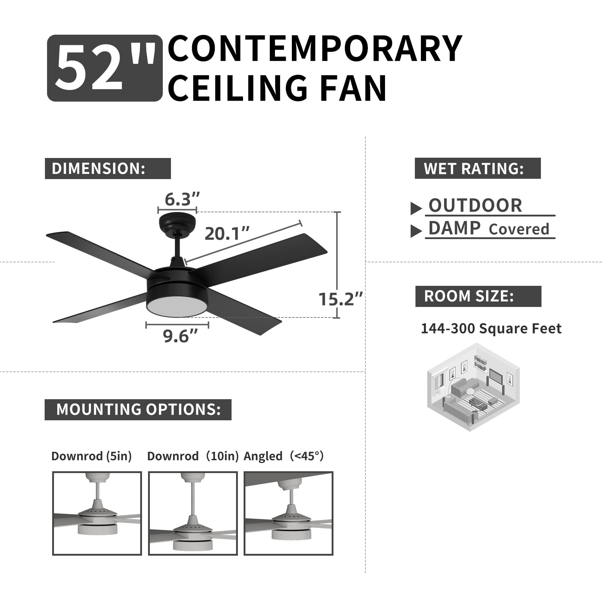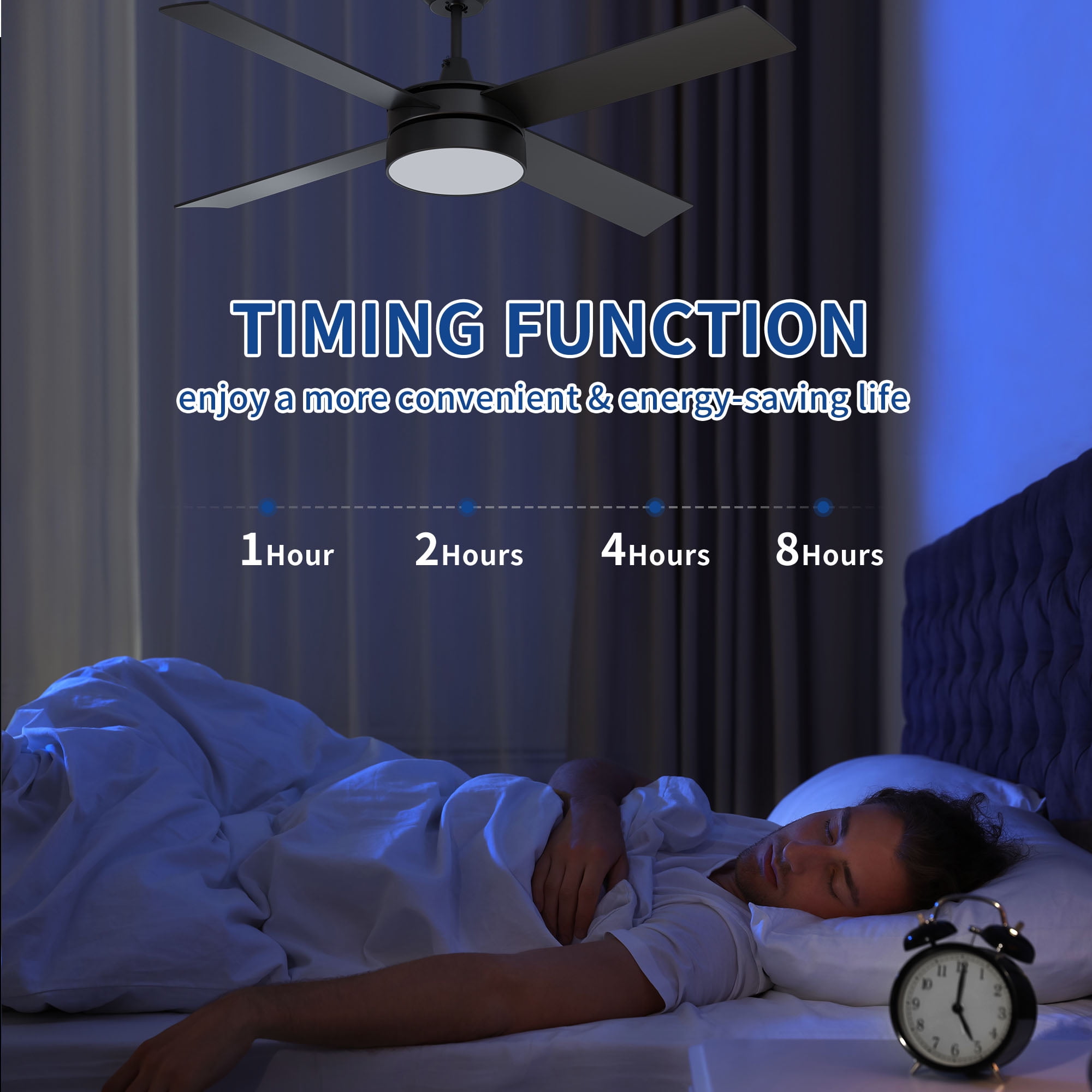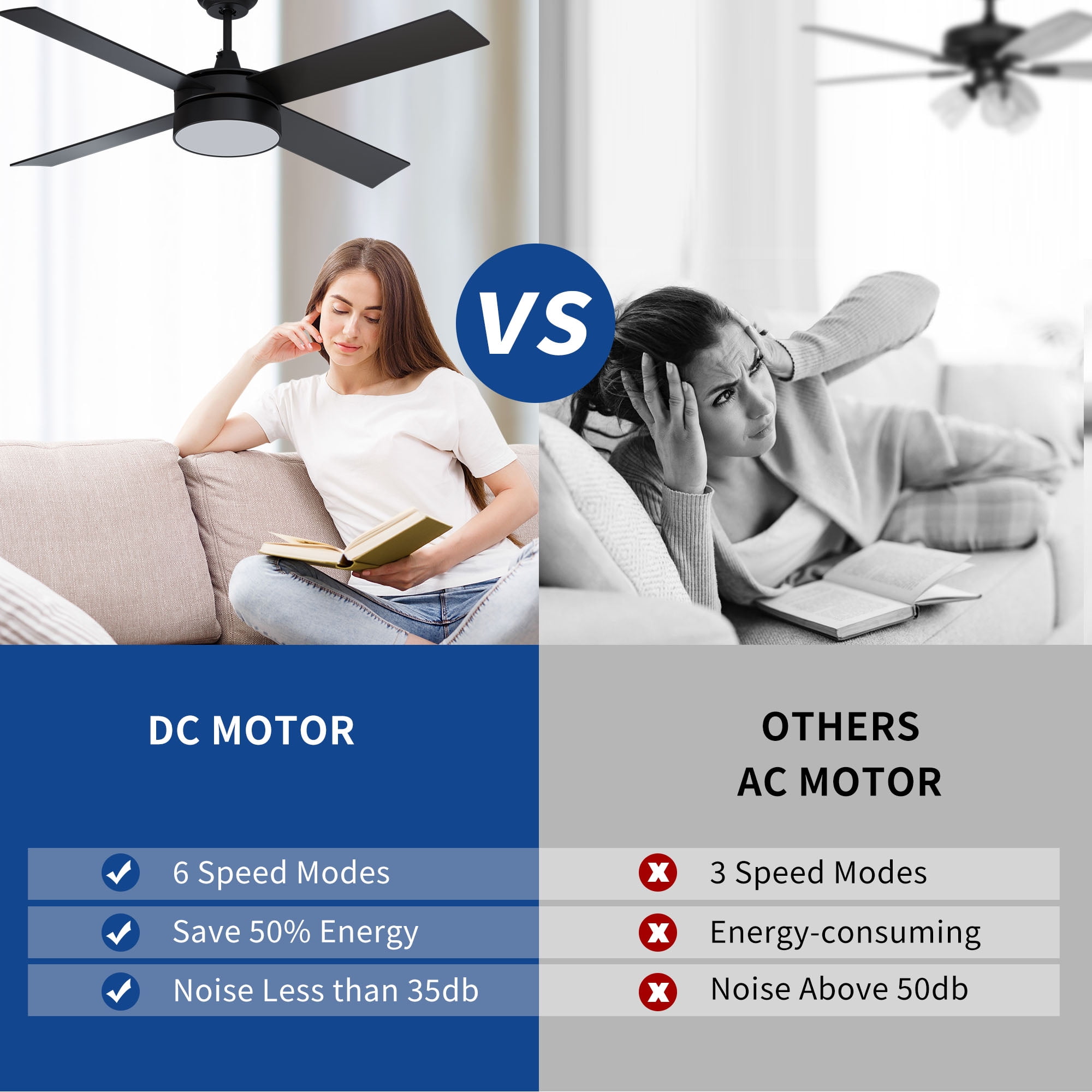 Dextrus 48″ Black Ceiling Fan with Light Remote 4 Blades Memory Function & Night Light Mode Trendy LED Ceiling Fan: ETL-certified modern fan light with a sleek design adds character The ABS fan blades provide outstanding water resistance for indoor or covered areas Adaptable Lighting: Seamlessly switch between warm white, cool white (2700K-4000K-6000K), and dim from 5% to 100% for your preferred ambiance The memory function retains your last setting, while the night light mode enhances sleep quality Peaceful & Versatile Motor: Enjoy tranquility with this energy-efficient AC motor, offering three quiet speed settings under 30 decibels Experience refreshing summer breezes or comfortable winter airflow with its reversible design Convenient Remote Control: Easily adjust light and fan speed without disruptive beeping The 2/8-hour timer function allows for hassle-free sleep, and the included wall-mount holder adds extra convenience Simple Installation: This fan light includes 5in and 10in hanging rods for downrod or angled mounting (up to 45°) With pre-installed wire clips, clear instructions, a balance kit, and all necessary accessories, assembly is straightforward