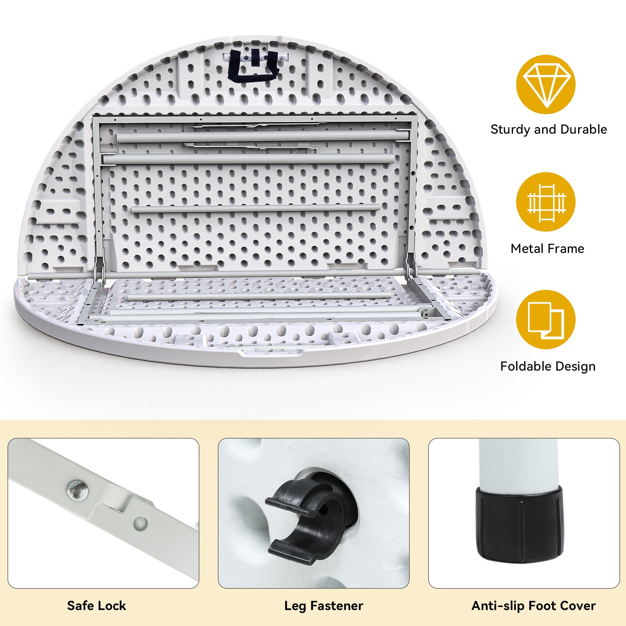 Product Description Versatile round folding table, perfect for outdoor and indoor use. Crafted with a sturdy metal frame and a 1.57″ thick HDPE tabletop, it ensures durability and resistance to wear. The table’s minimalist design harmonizes practicality and style, making it ideal for camping, picnics, parties, and events. It’s lightweight at 28.22 lbs and comes with a built-in handle for easy portability. The security lock and fixing buckles provide added stability. With its waterproof resin surface, cleaning is a breeze, allowing you to enjoy gatherings regardless of the weather. Measuring 71″ x 29″ x 29.13″ (L x W x H), it comfortably accommodates up to 6 people for compact grilling, snacks, and dinnerware. Specifications Color: White Shape: Round Top Material Type: Hdpe,Resin Frame Materia: Plastic, Metal Item Weight: 28.22 pounds Product Dimensions:48 x 48 x 29.13 inches