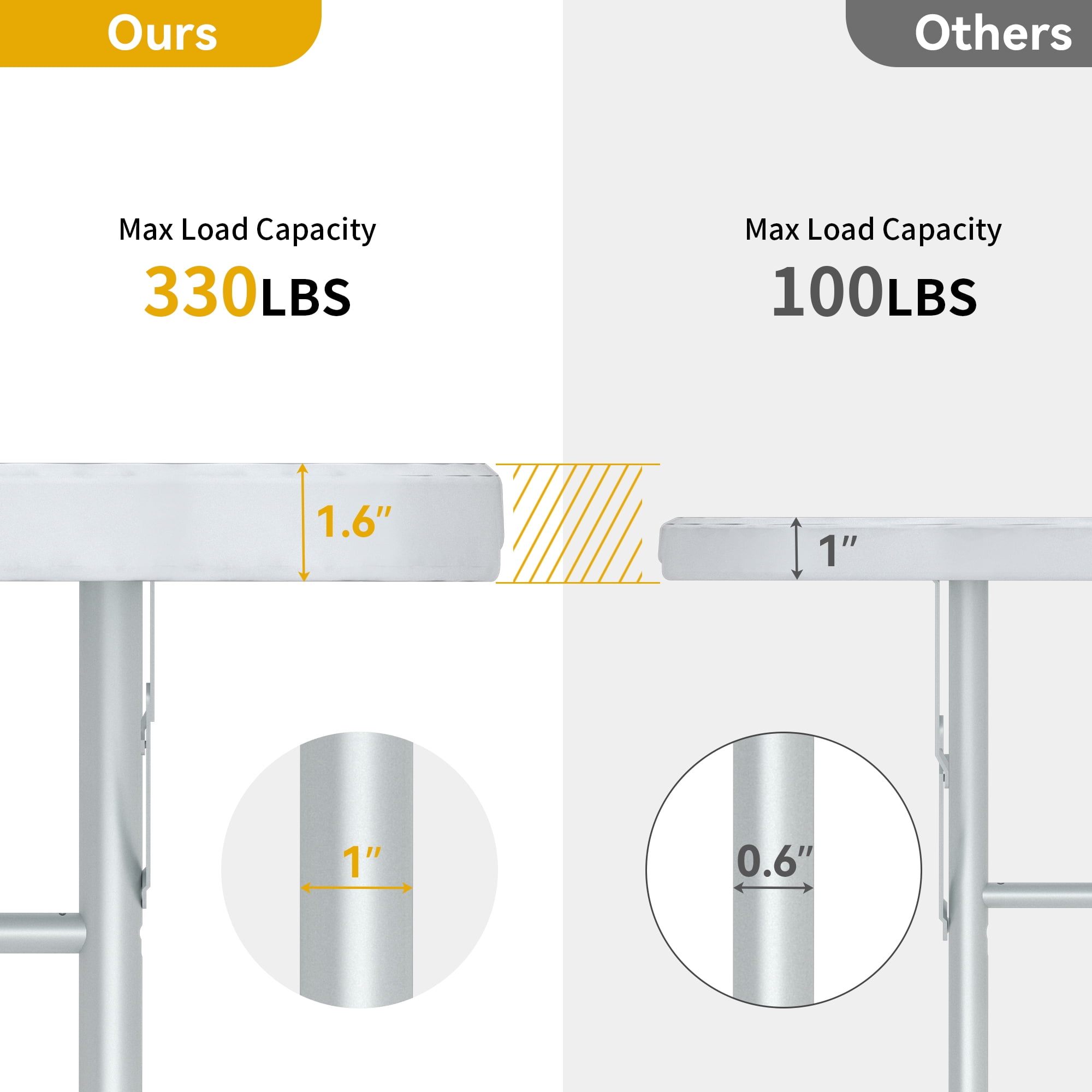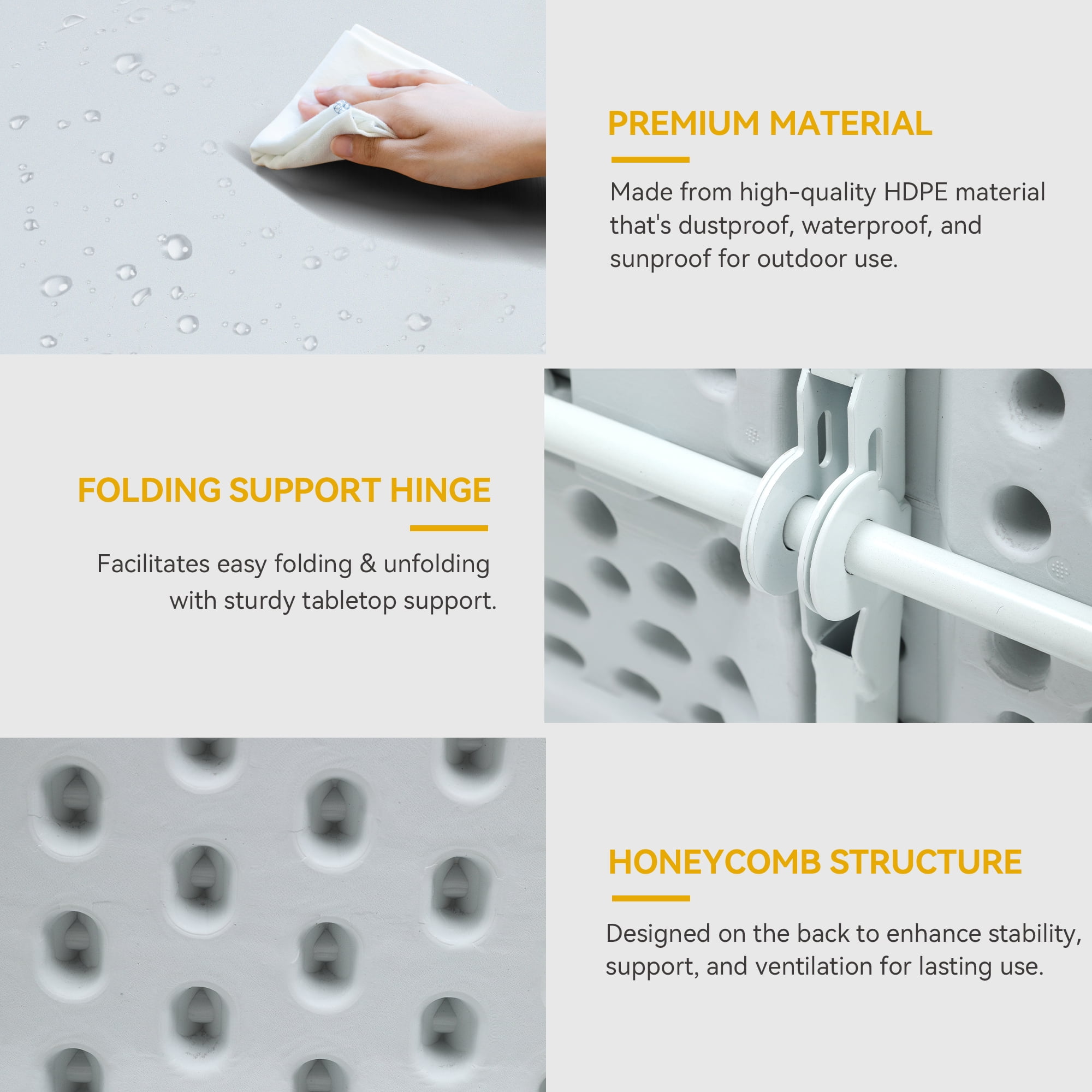 Convenient Storage and Portability: Set up this foldable table effortlessly in seconds and fold it up for compact storage when not in use. Weighing just 28.22 lbs, it’s lightweight and comes with a built-in carrying handle for easy mobility. Robust Construction: The sturdy metal frame of our folding table complements the 1.57″” thick high-density polyethylene (HDPE) tabletop, ensuring durability and resistance to wear and tear. It features a security lock and fixing buckles for enhanced stability. Multi-Purpose Design: Combining minimalist style with practical functionality, this table is a versatile solution for various occasions such as camping, picnics, parties, and events. It seamlessly fits into both indoor and outdoor areas, including patios, gardens, poolside areas, and lawns. Effortless Cleaning: The table’s surface is covered with a waterproof resin layer, making it weather resistant and easy to clean. Simply wipe it with a damp cloth, allowing you to enjoy gatherings with family, friends, and neighbors regardless of the weather conditions. Spacious and Accommodating: Measuring 71″” x 29″” x 29.13″” (L x W x H), this portable folding table offers ample space to comfortably accommodate up to 6 people. It’s perfect for compact grilling sessions, snacks, fruits, and dinnerware.