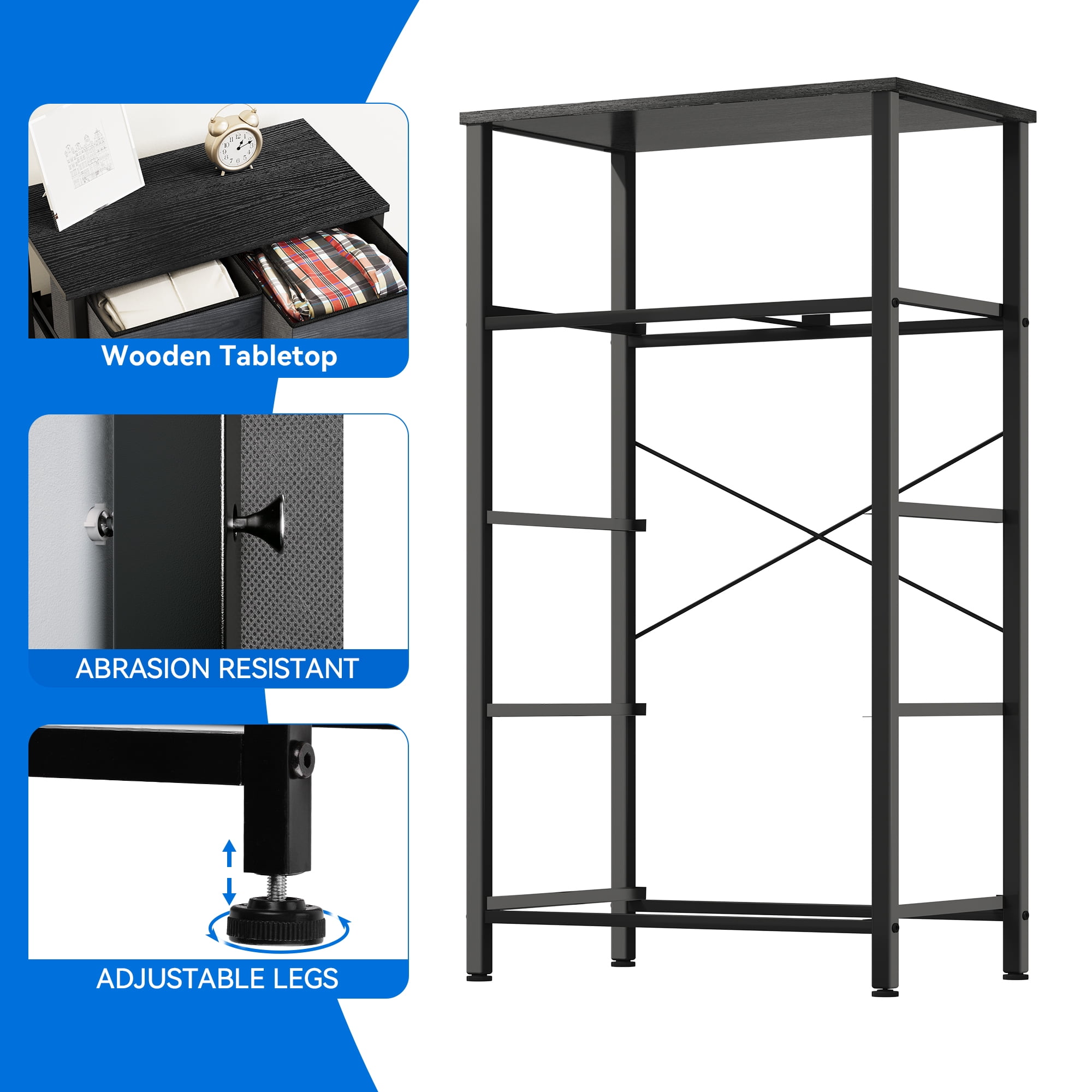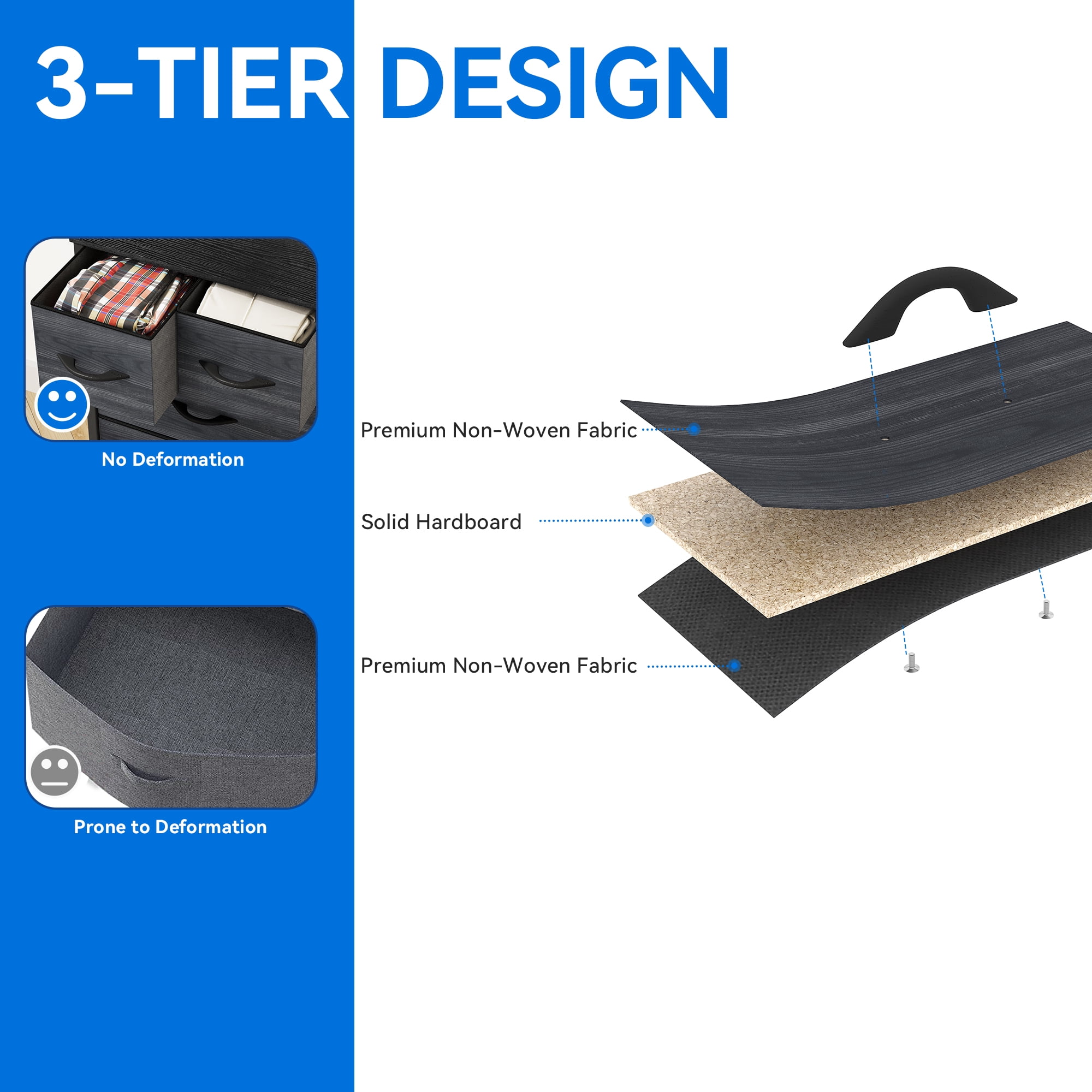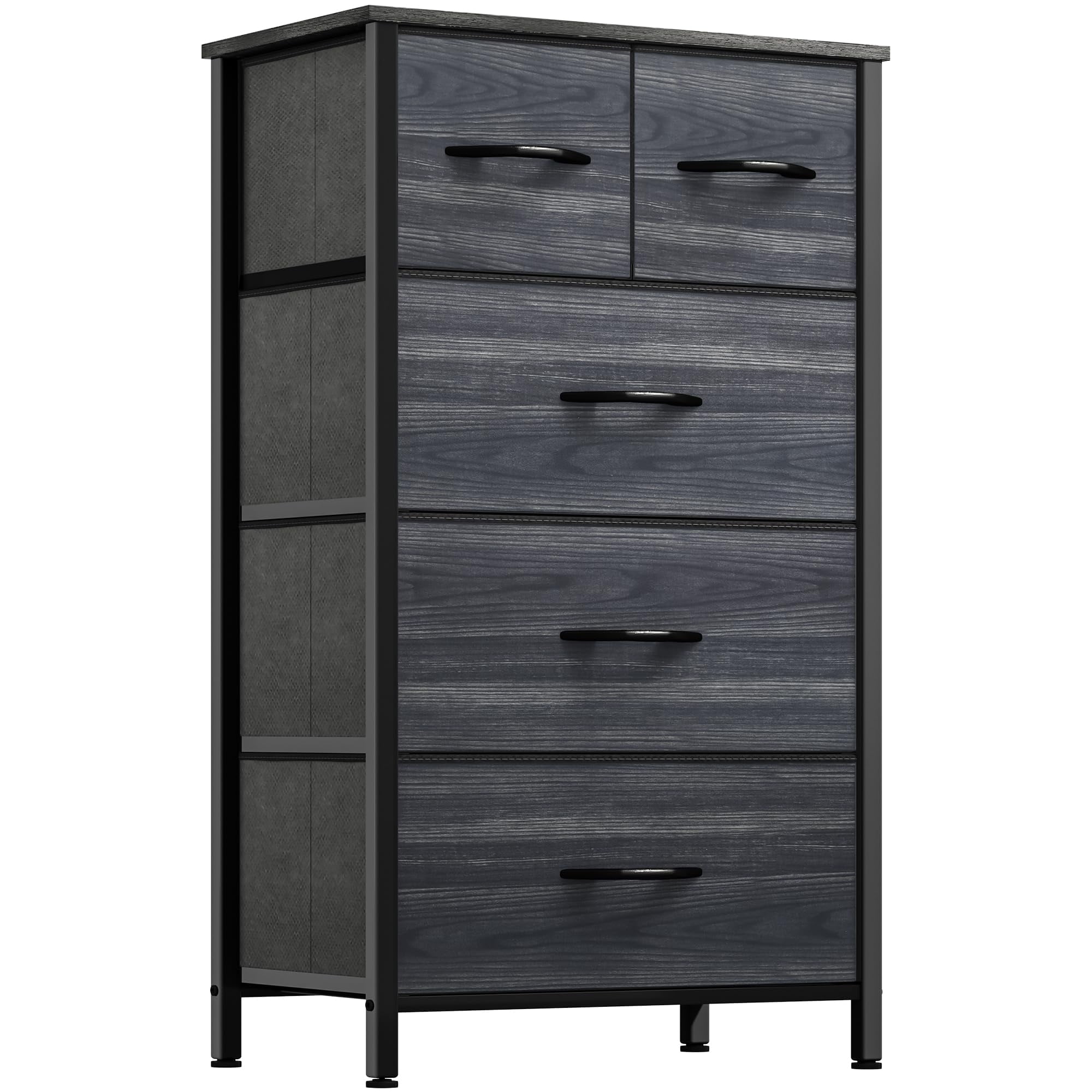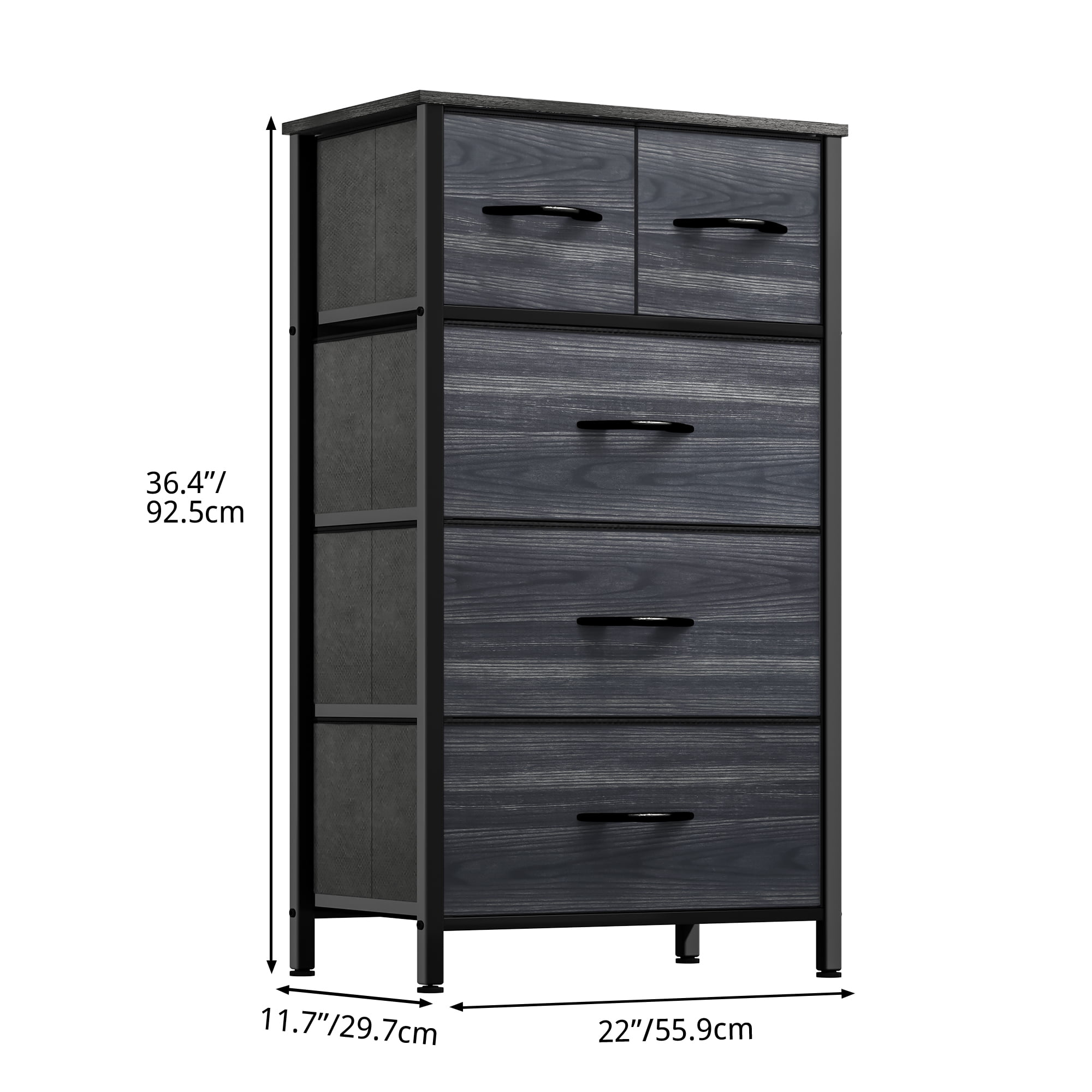 Versatile Storage Tower: This 5-drawer fabric dresser fits seamlessly into bedrooms, living rooms, hallways, entryways, closets, nurseries, or playrooms, offering practical and stylish storage for any room. Suitable for adults and teens. Spacious Storage Capacity: Ideal for organizing dresses, socks, pants, shirts, toys, and more. The sizeable MDF wooden top provides additional space for displaying framed photos, lamps, potted plants, or decorative items. Durable & Stable Construction: Built with a sturdy metal frame and a premium MDF wooden top for enhanced durability and long-term use. Includes 4 adjustable plastic legs to protect floors from scratches and ensure stability on uneven surfaces. Convenient & Portable Design: Features 5 removable and foldable deep drawers with easy-to-pull plastic handles. The high-quality non-woven synthetic fabric ensures easy cleaning and low maintenance. Safe & Easy to Use: Overall dimensions: 22″ L x 11.7″ W x 36.4″ H; Large drawer dimensions: 20.1″ L x 11″ W x 8″ H, Small drawer dimensions: 10″ L x 11″ W x 8″ H. Easy assembly with included instructions. For added safety, it is recommended to anchor the dresser to the wall to prevent tipping.