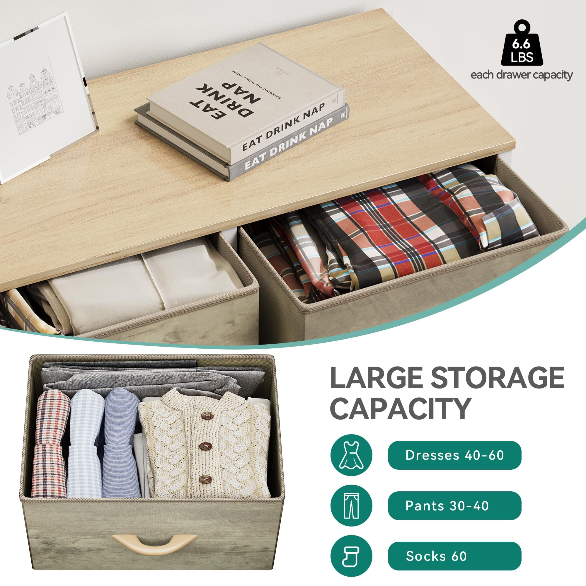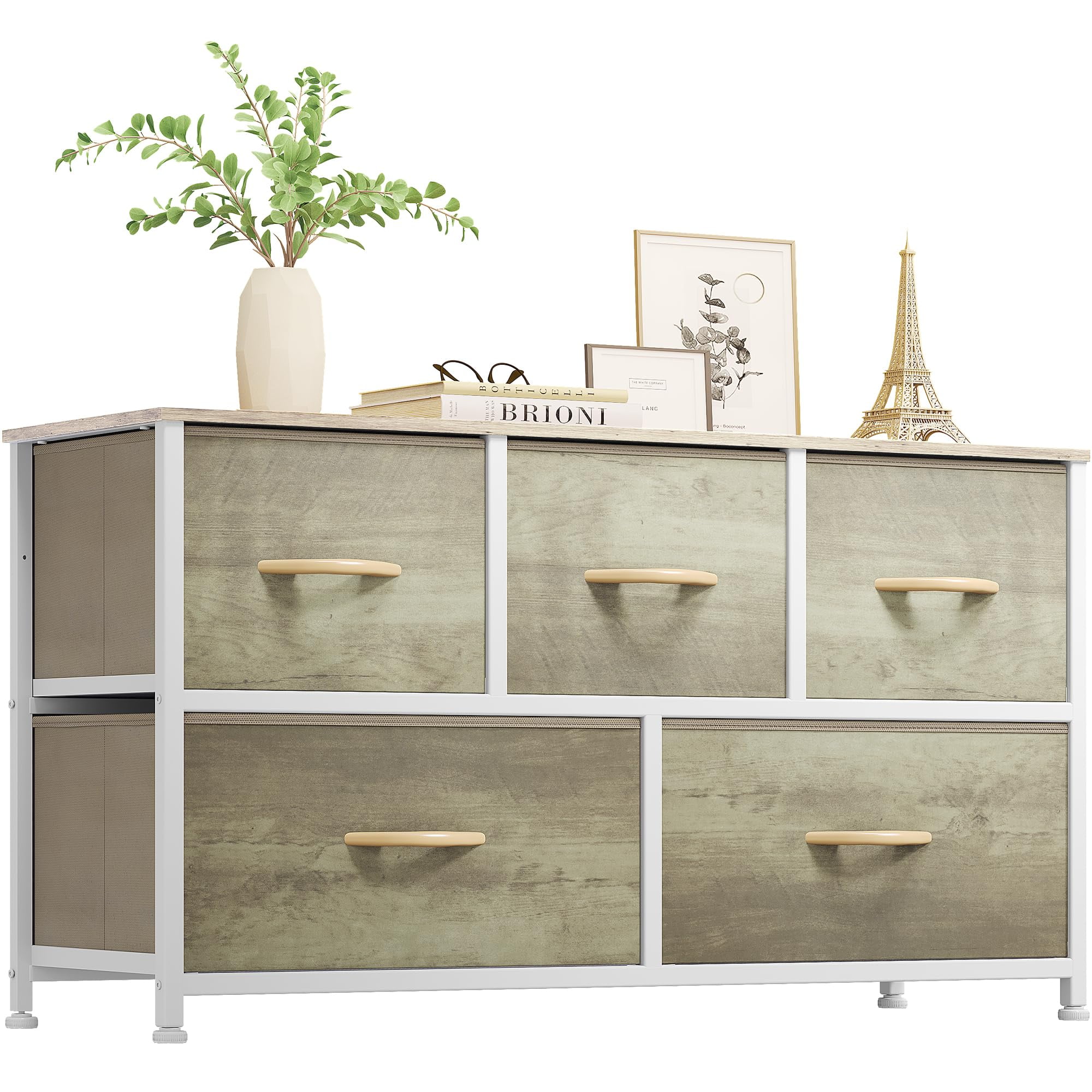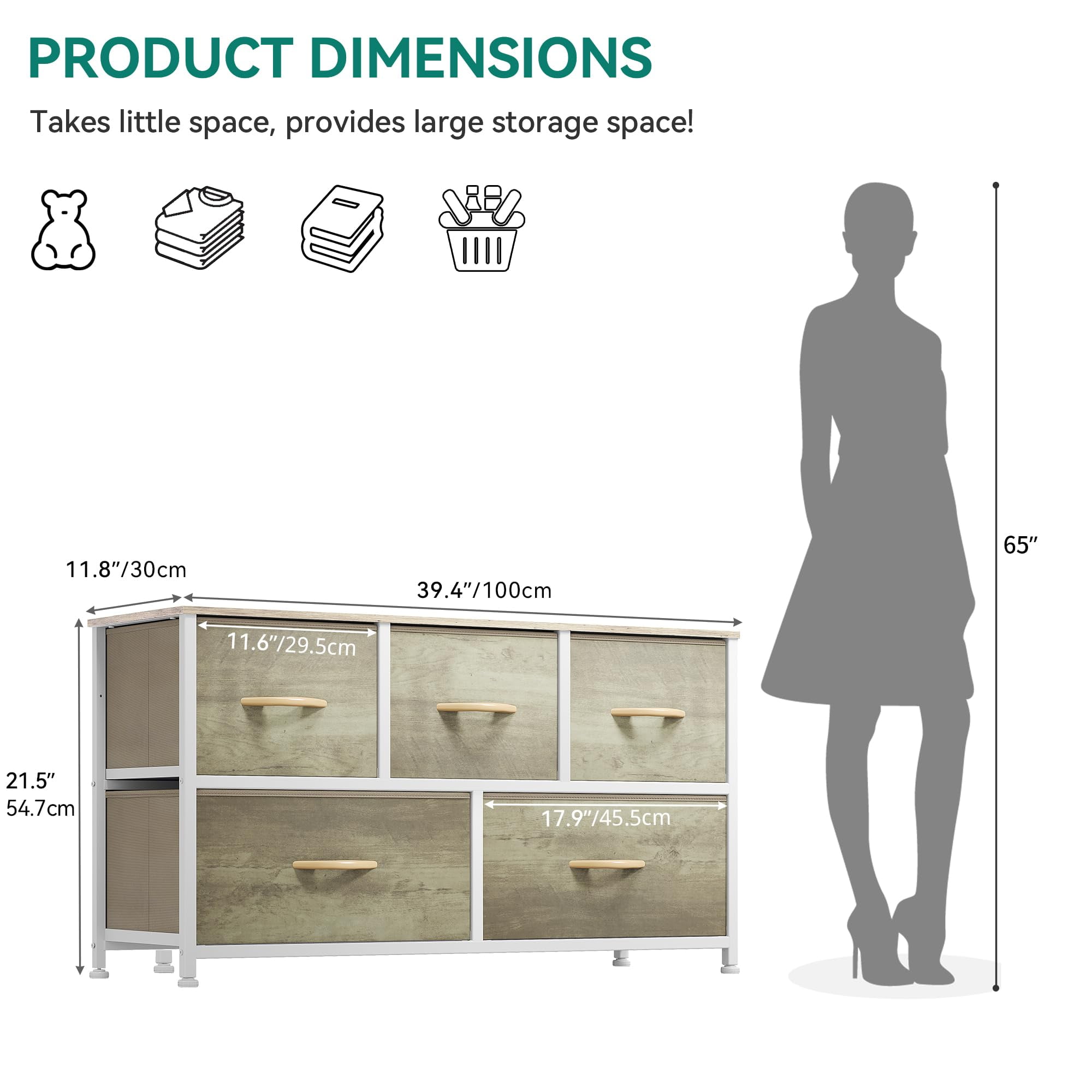 VERSATILE DRAWER TOWER- Dextrus fabric dresser is a clean expression that fits right into your bedroom, living room, hallway, entryway, closetROOMY STORAGE SPACE- The wide chest of drawers can stash dresses, socks, pants, shirts, toys, etc; Sizeable top grants all the surface area you need to display framed photos, lamps, and potted plants.STURDY DRESSER FOR BEDROOM- Premium MDF wooden top and reliable metal frame lend immense support & extend shelf life; 4 adjustable plastic legs are for scratch protection and stability on uneven ground.5 DRAWER DRESSER- The dresser with 5drawers features 5 foldable deep drawers and easy-to-pull plastic handles; High quality non-woven synthetic fabric is easy to care.SAFE & EASY USE- The fabric storage tower measures 39.37″ L x 11.8″ W x 21.45″ H; Drawer Dimensions: 17.9″ L x 11.2″ W x 8.5″ H / 11.6″ L x 11.2″ W x 8.5″ H; It’s a breeze to assemble the storage unit with instructions included; Recommended to anchor the dresser to the wall for anti-tipping safety. VERSATILE DRAWER TOWER- Dextrus fabric dresser is a clean expression that fits right into your bedroom, living room, hallway, entryway, closet ROOMY STORAGE SPACE- The wide chest of drawers can stash dresses, socks, pants, shirts, toys, etc; Sizeable top grants all the surface area you need to display framed photos, lamps, and potted plants. STURDY DRESSER FOR BEDROOM- Premium MDF wooden top and reliable metal frame lend immense support & extend shelf life; 4 adjustable plastic legs are for scratch protection and stability on uneven ground. 5 DRAWER DRESSER- The dresser with 5drawers features 5 foldable deep drawers and easy-to-pull plastic handles; High quality non-woven synthetic fabric is easy to care. SAFE & EASY USE- The fabric storage tower measures 39.37″ L x 11.8″ W x 21.45″ H; Drawer Dimensions: 17.9″ L x 11.2″ W x 8.5″ H / 11.6″ L x 11.2″ W x 8.5″ H; It’s a breeze to assemble the storage unit with instructions included; Recommended to anchor the dresser to the wall for anti-tipping safety.