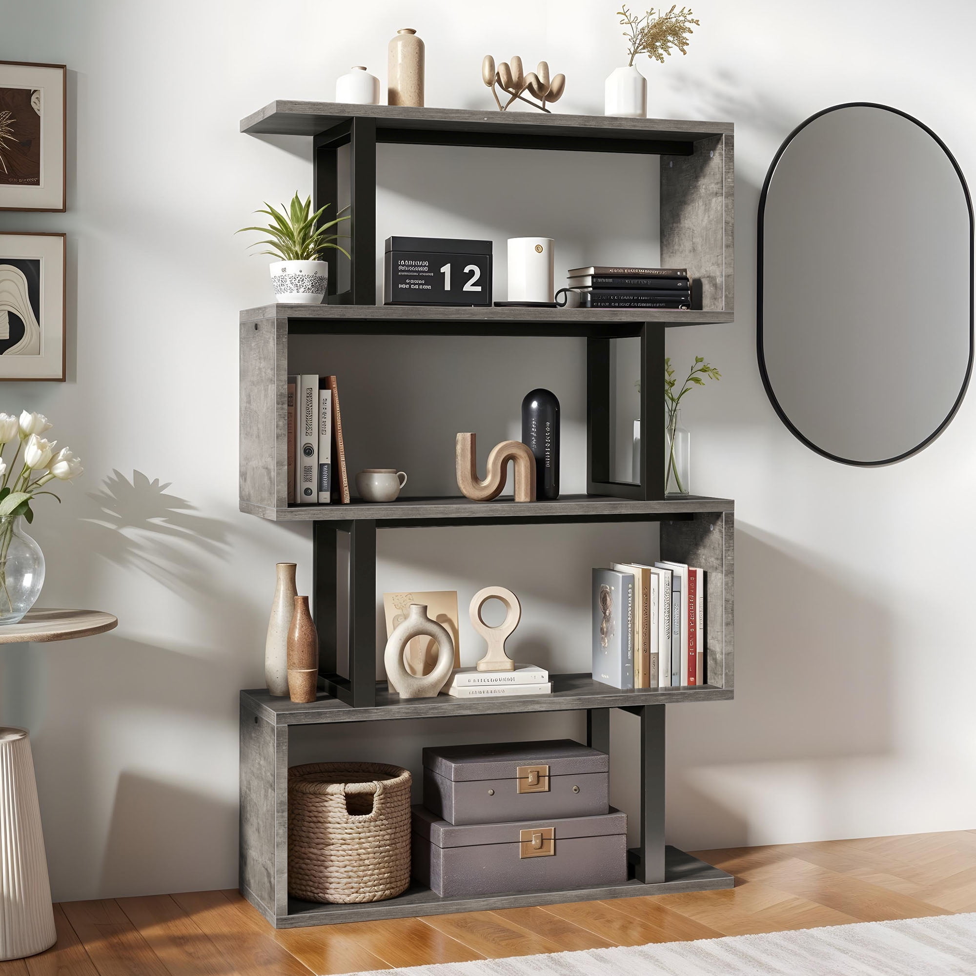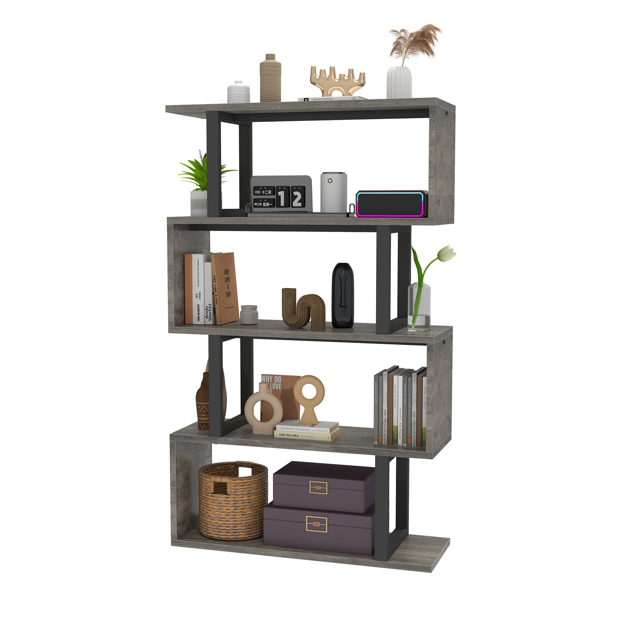 Dextrus 5 Tier Bookcase, S shape Geometric Bookshelf Wood Z-Shelf Modern Free Standing Bookshelf Storage Organizer for Living Room Bedroom Home Office, Gray Wash