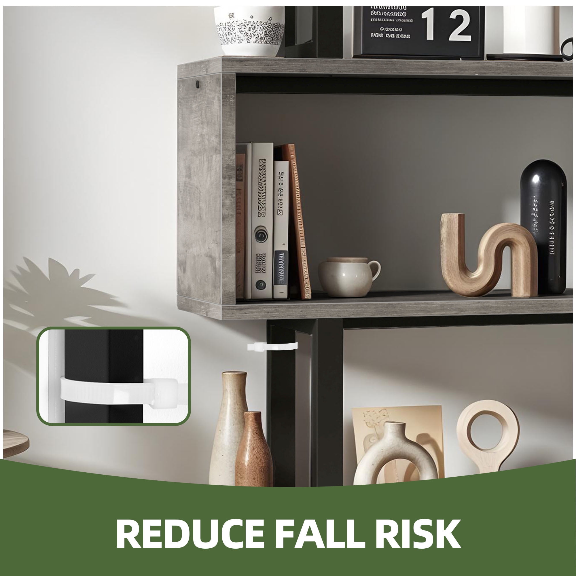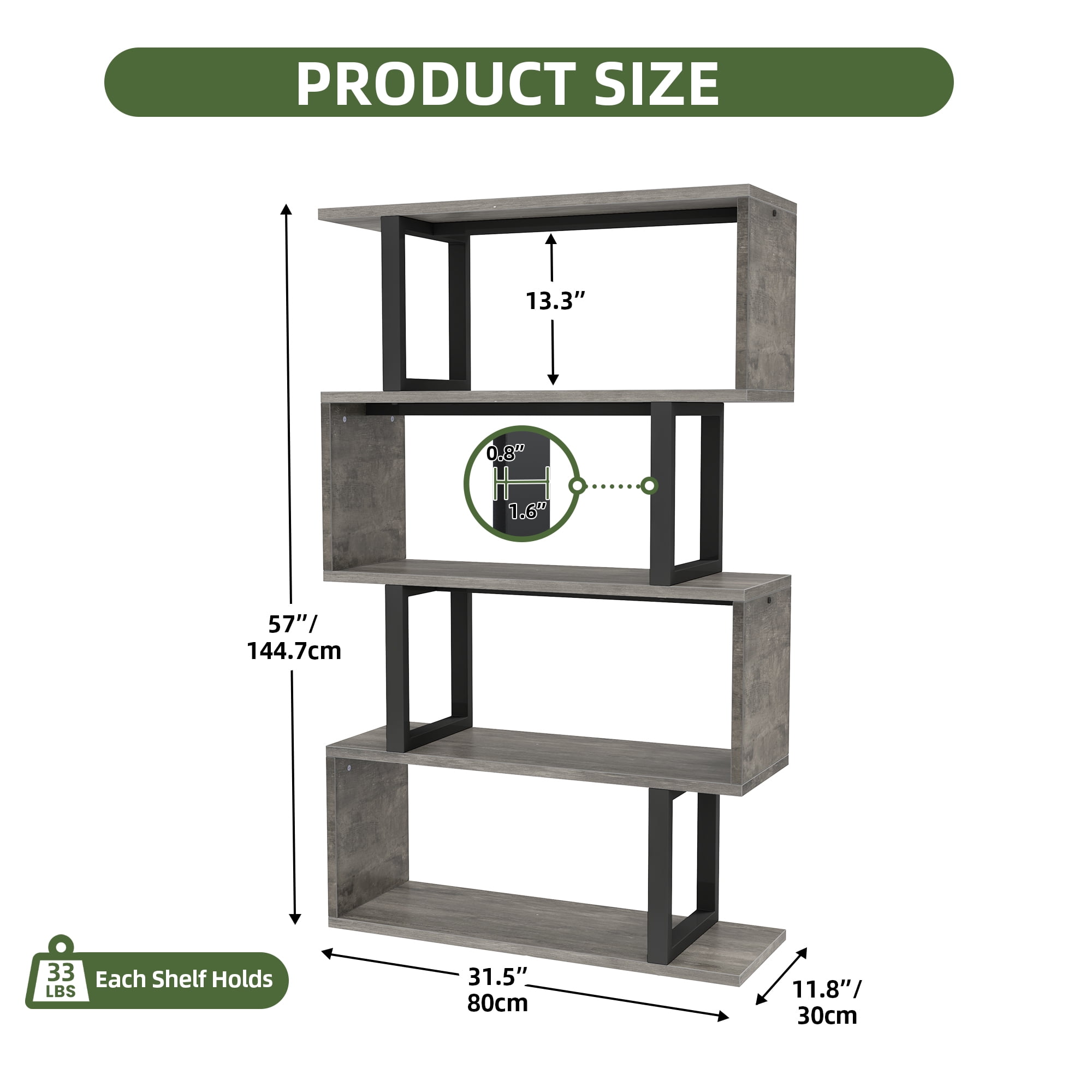 Unique S-shape design makes this bookshelf a work of art 5-tier storage space satisfies various needs Made from superior waterproof particle board and powder coating metal frame for enhancing lifespan Equipped with anti-fall kit for family safety and product stability The cross bar at the bottom of each shelf improves bearing capacity The non-slip leg pads protect the floor against scratches and keep the bookshelf stable on uneven floors Used as a bookshelf to arrange books, used as a display rack to show off beloved collections, or used as an office rack for efficient organization Used as a bookshelf to arrange books, used as a display rack to show off beloved collections, or used as an office rack for efficient organization