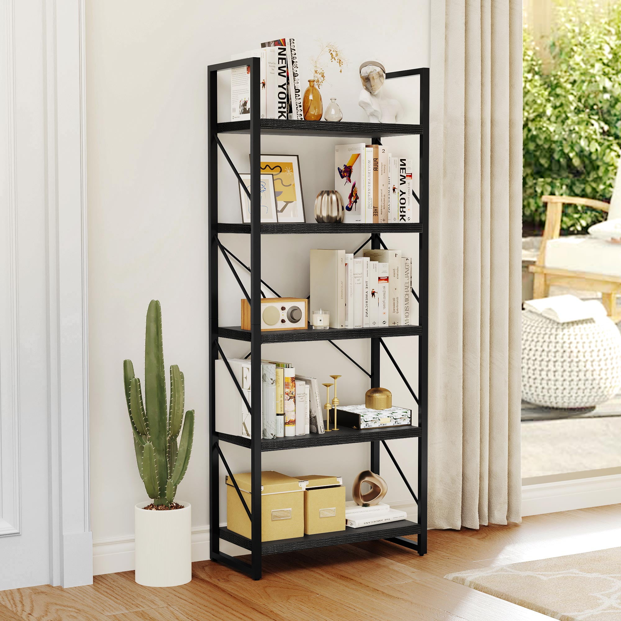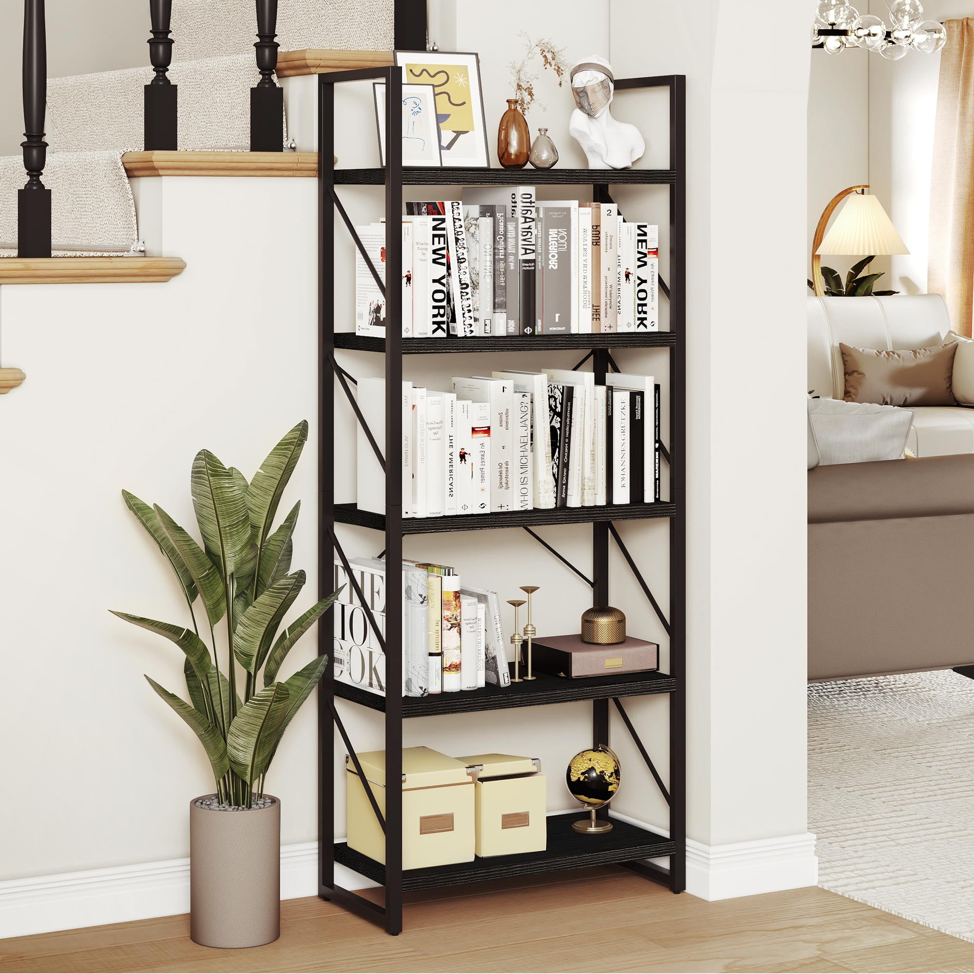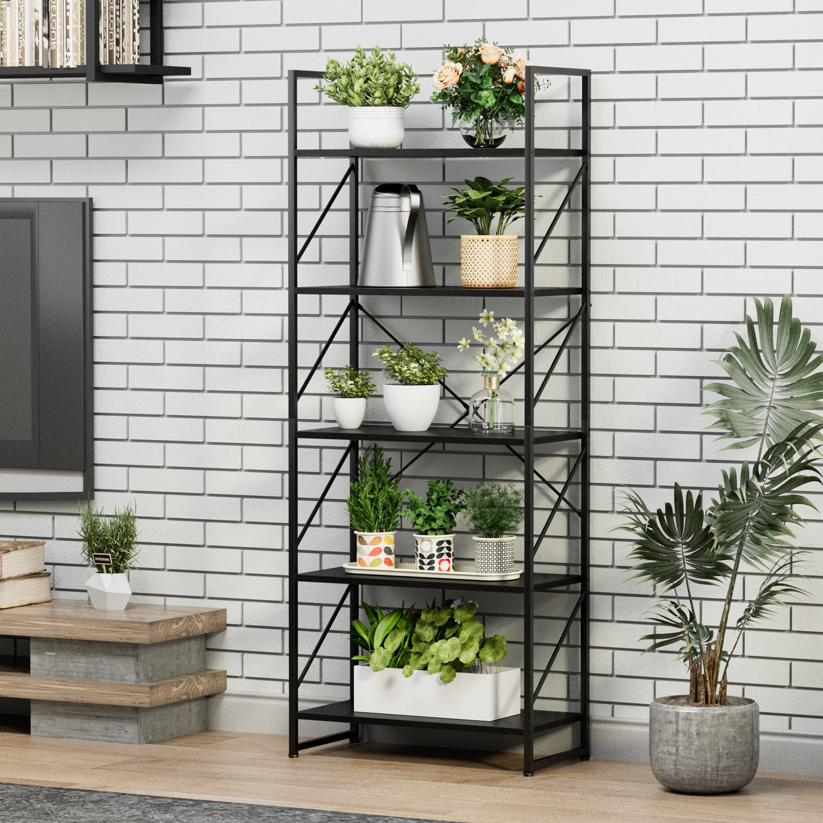 Spacious and Accessible Storage: The 5-Tier Shelf features five open shelves that provide ample space for storing and displaying your favorite books, curios, framed photos, and more. The practical design ensures easy access to your belongings, allowing you to organize your home office or any other room aesthetically. Modern and Versatile: With its classic modern look, this bookshelf not only serves as a storage solution but also doubles as a plant shelf or display shelf. Its multifunctional design makes it suitable for various rooms such as the bedroom, living room, kitchen, office, hallway, and more. It effortlessly blends in with any decor style. Scratch-Proof and Durable: The smooth particle board of the bookshelf is coated with a scratch-proof and waterproof melamine finish. This ensures a long-lasting appearance and protects the shelf from everyday wear and tear. The combination of the melamine finish and matte steel frame enhances the durability and stability of the shelf. Enhanced Stability: Our designer team has strengthened the stability of the bookshelf to prevent wobbling. The addition of X-bracing support provides better sturdiness, while the adjustable feet ensure stability even on uneven floors. The oblique-line side design prevents books from falling out, and two anti-tipping devices are included to secure the shelf to the wall, ensuring the safety of your family. Easy Assembly: The 5-Tier bookShelf is designed for easy assembly. All the necessary accessories are included, and you can quickly put it together with the help of an easy-to-understand illustrated manual. Enjoy the convenience of a stylish and functional shelf without the hassle of complicated assembly.