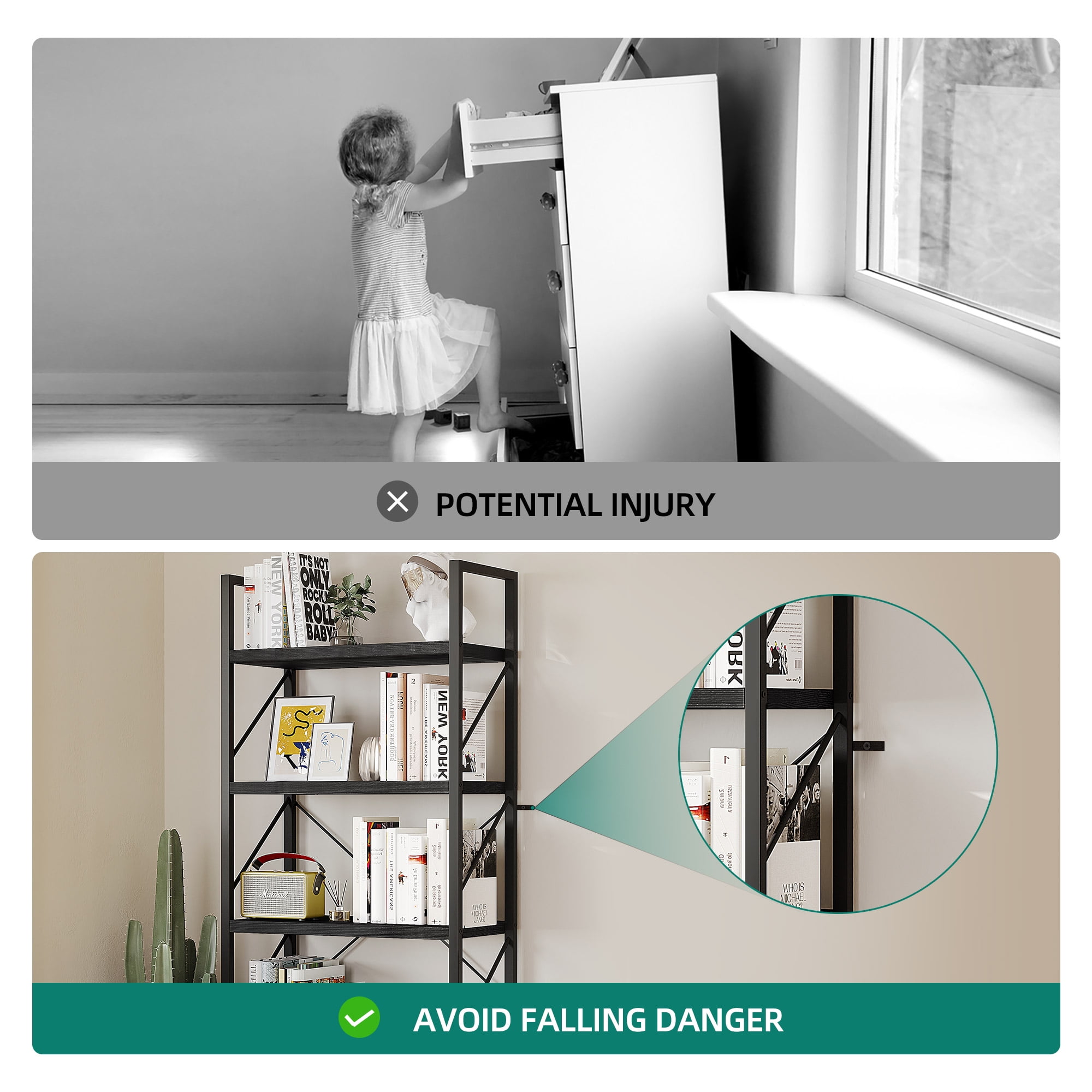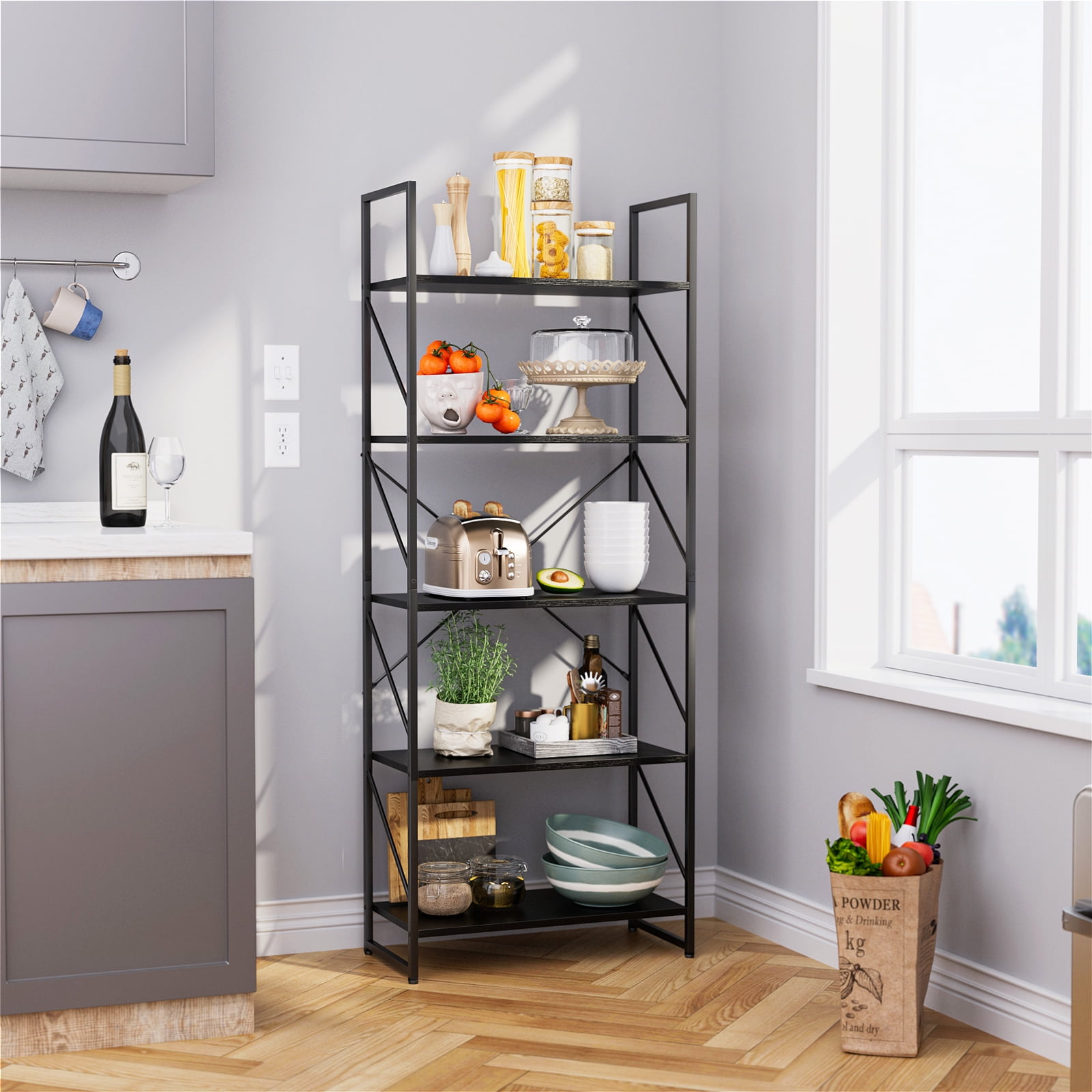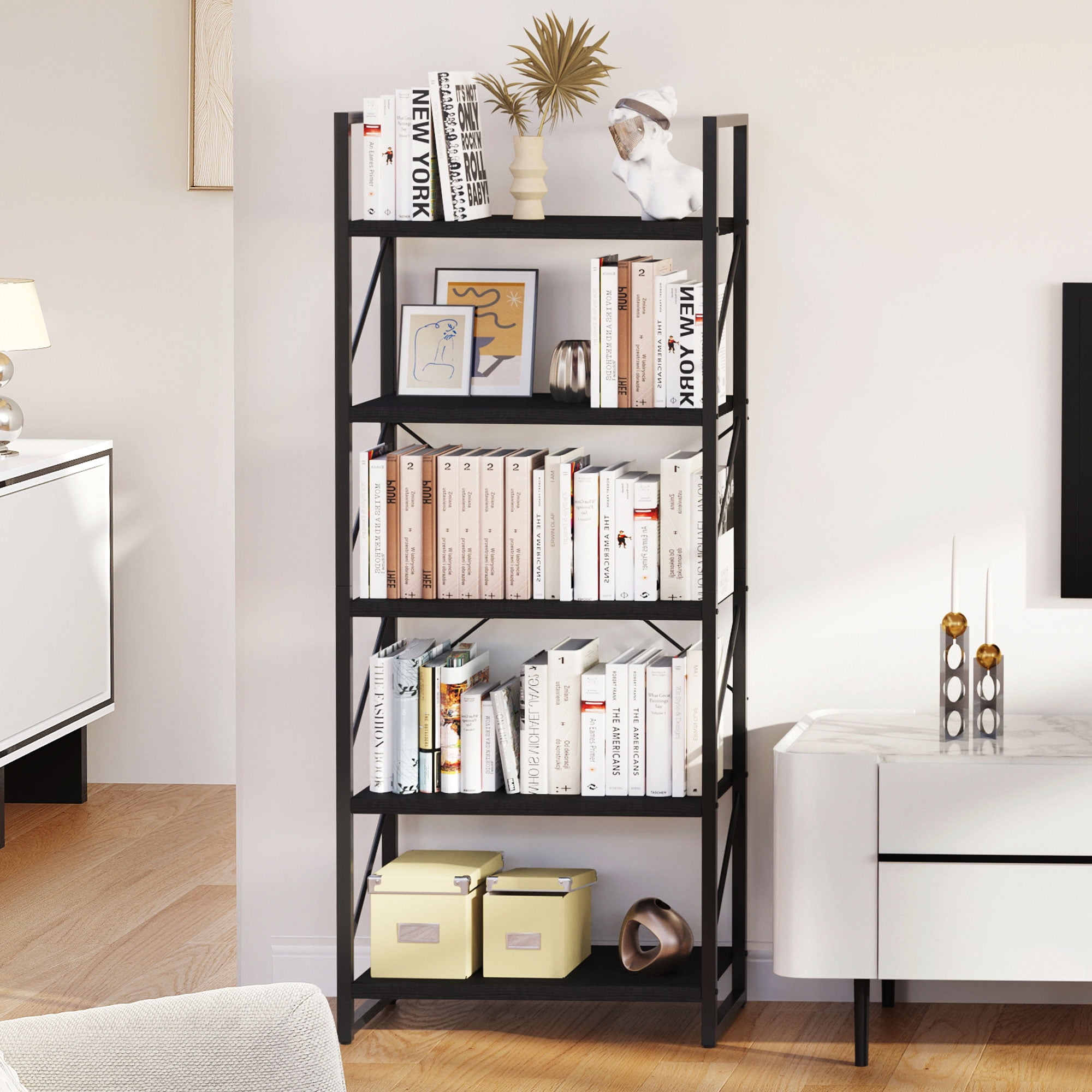 Spacious and Accessible Storage: The 5-Tier Shelf features five open shelves that provide ample space for storing and displaying your favorite books, curios, framed photos, and more. The practical design ensures easy access to your belongings, allowing you to organize your home office or any other room aesthetically. Modern and Versatile: With its classic modern look, this bookshelf not only serves as a storage solution but also doubles as a plant shelf or display shelf. Its multifunctional design makes it suitable for various rooms such as the bedroom, living room, kitchen, office, hallway, and more. It effortlessly blends in with any decor style. Scratch-Proof and Durable: The smooth particle board of the bookshelf is coated with a scratch-proof and waterproof melamine finish. This ensures a long-lasting appearance and protects the shelf from everyday wear and tear. The combination of the melamine finish and matte steel frame enhances the durability and stability of the shelf. Enhanced Stability: Our designer team has strengthened the stability of the bookshelf to prevent wobbling. The addition of X-bracing support provides better sturdiness, while the adjustable feet ensure stability even on uneven floors. The oblique-line side design prevents books from falling out, and two anti-tipping devices are included to secure the shelf to the wall, ensuring the safety of your family. Easy Assembly: The 5-Tier bookShelf is designed for easy assembly. All the necessary accessories are included, and you can quickly put it together with the help of an easy-to-understand illustrated manual. Enjoy the convenience of a stylish and functional shelf without the hassle of complicated assembly.