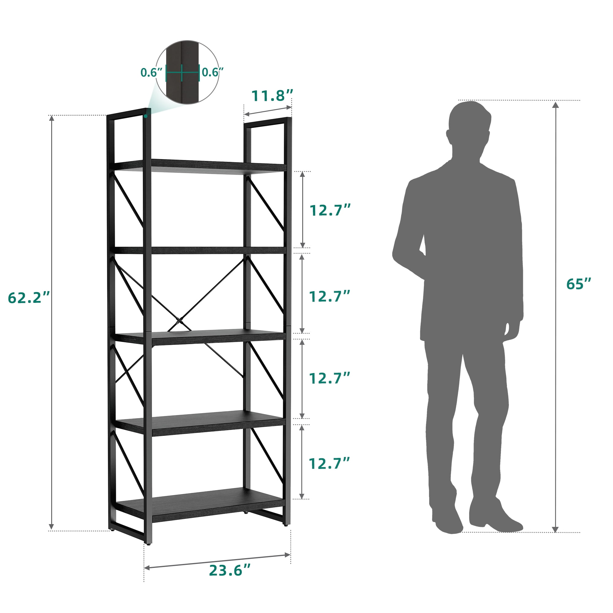 5-Tier Bookshelf is a modern and functional storage organizer that adds a touch of elegance to any room. With its sturdy “X” design and durable particle board construction, it provides stability and reliability. This open display shelf offers ample space for showcasing your favorite books, decorative items, and more. Whether in the bedroom, living room, or home office, this 5-tier bookshelf is a stylish and practical addition to your space. Its sleek design and multiple storage shelves make it easy to organize and access your belongings with ease. Specification: Material: Particle Board; Steel Frame Dimensions: 11.8″D x 23.6″W x 62.2″H Room Type: Office, Kitchen, Living Room, Bedroom, Study Room Installation Type : Freestanding Package Contents: 1 x Bookshelf 1 x Packet of Fittings 1 x Instruction Manual