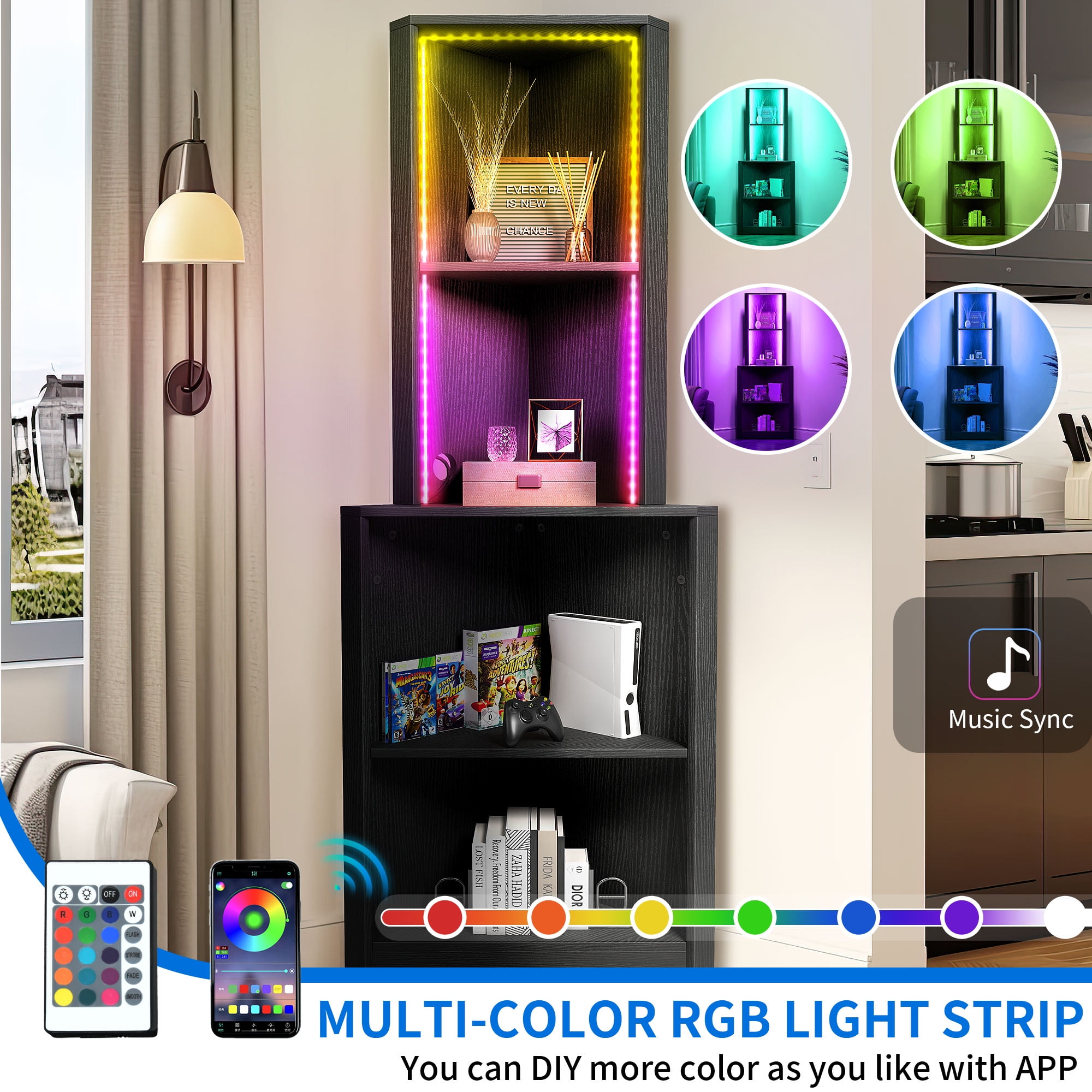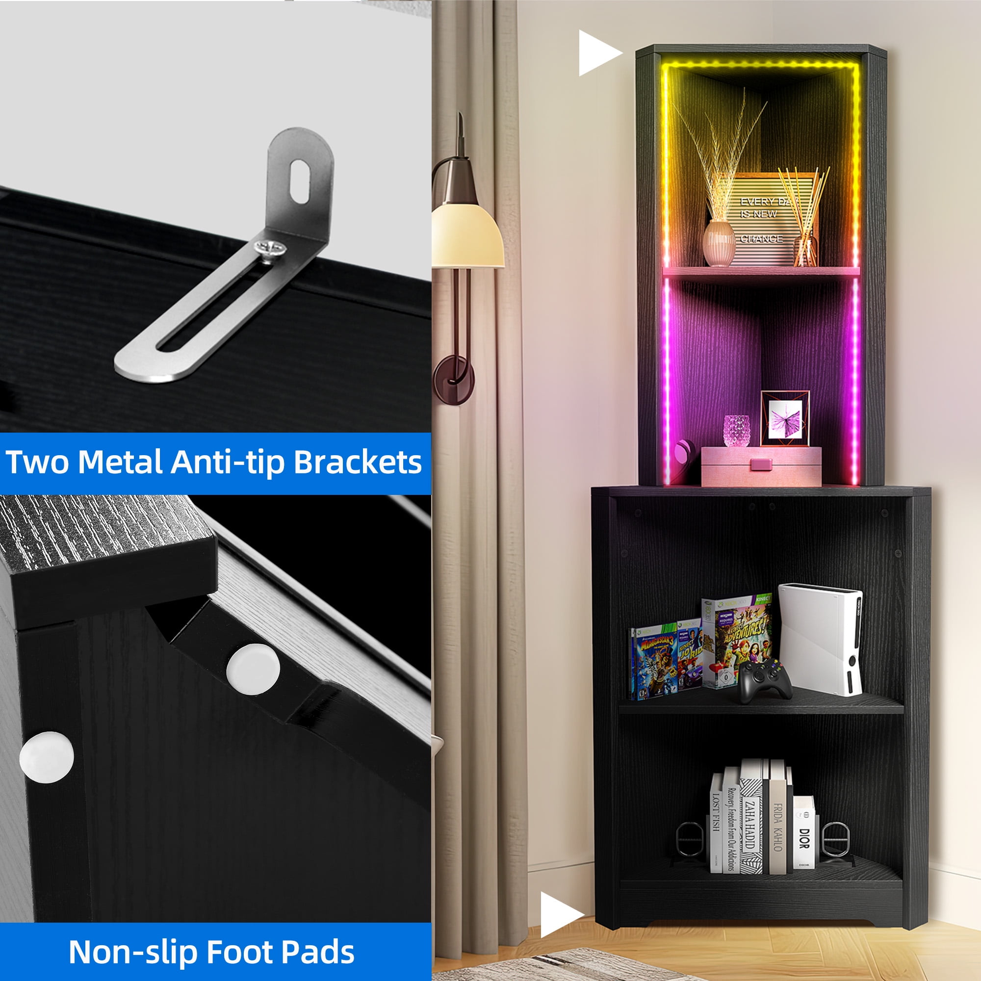 Dynamic LED Lighting: Our corner shelf features a stunning multi-color RGB LED light strip that can be easily controlled via a phone app or remote. The vibrant light colors change and flash in sync with the rhythm of your music, creating a captivating atmosphere in any room. Utilize Unused Corners: Maximize your space with our space-saving corner shelf. It effectively transforms unused corners into valuable storage areas, allowing you to declutter and organize your living room, bedroom, balcony, office, and more. Enhanced Stability and Safety: We prioritize your safety and have equipped our corner shelving unit with an anti-tip kit and a 90° right angle design. These features ensure secure attachment to the wall, providing enhanced stability and peace of mind. Additionally, non-slip foot pads prevent any scratches on your floor. Ample Storage Capacity: With five-tier shelves, our corner shelf offers ample storage space for your books, plants, and knick-knacks. Display and showcase your cherished items while keeping your space tidy, clutter-free, and visually appealing. Easy and Hassle-Free Assembly: We understand the importance of convenience, which is why our corner shelf comes with clear instructions and complete accessories for easy assembly. Should you require any assistance, our dedicated support team is available to provide prompt help and guidance.