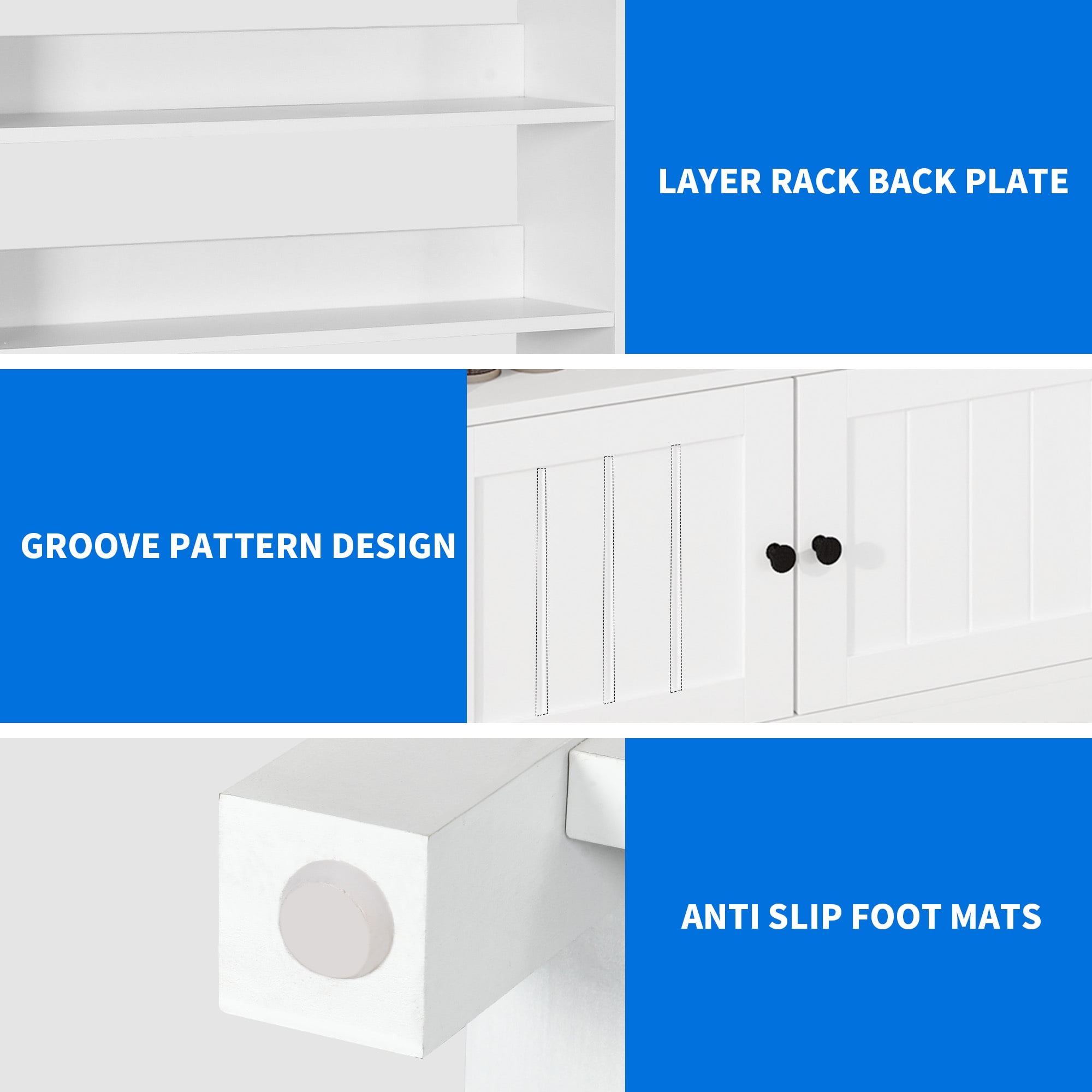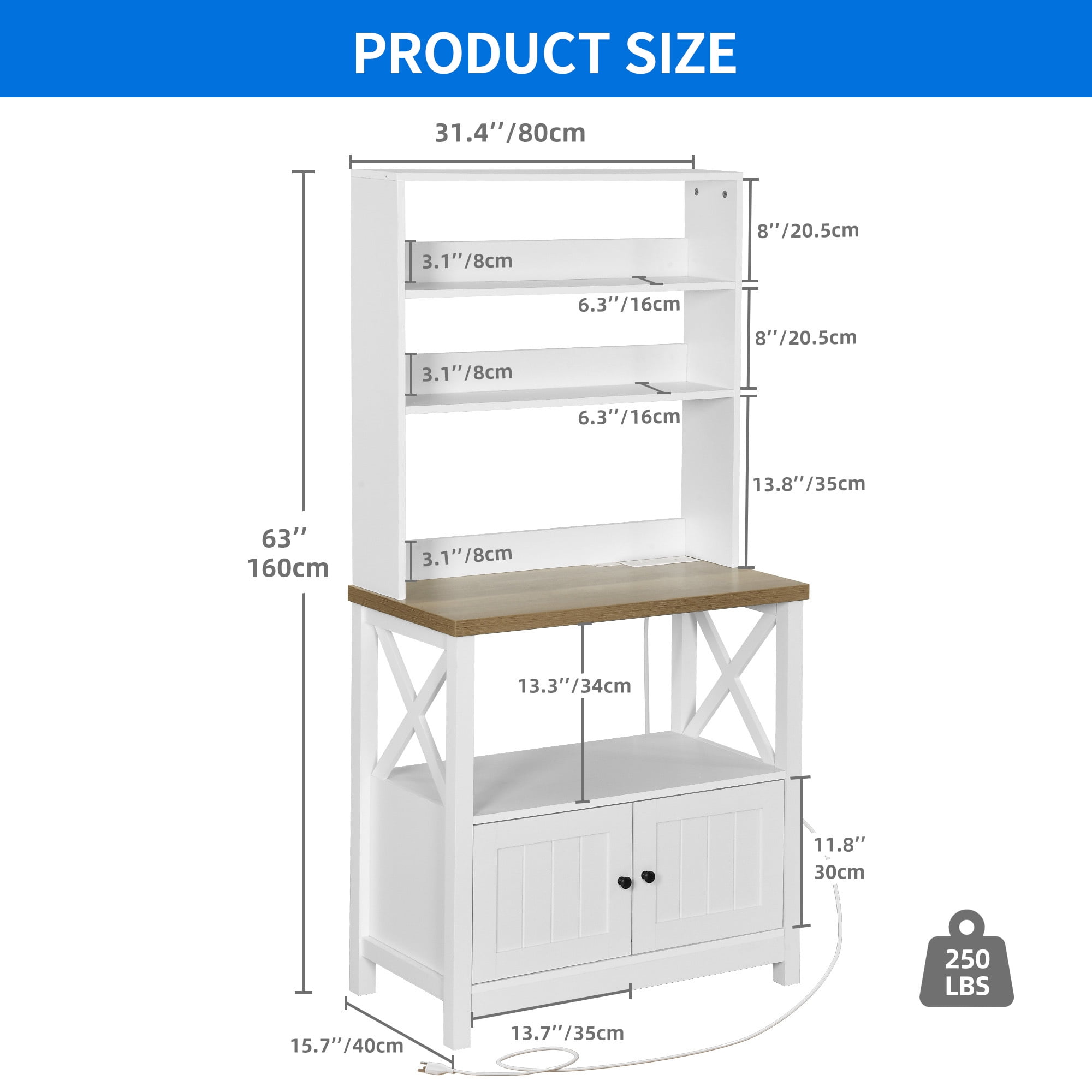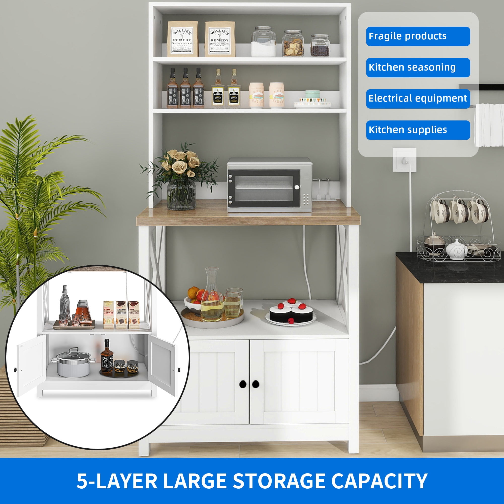 [Bakers Rack with Power Outlets] Equipped with 2 AC power outlets and and 2 USB ports to provide power for up to 4 devices simultaneously. Easily charge your devices without the hassle of relocating. [5 Tier Spacious Shelf with Cabinet] The DEXTRUS kitchen baker’s rack features a array of 5 open shelves, offering an ample space to house sorts of Kitchen essentials. Such as vegetables, microwave, and coffee machine allowing for effortless access and tidyness of kitchen. Additionally, the storage cabinet protect your items from dust and dampness. [Long Lasting Performance]: Crafted with durable 1.2” thick MDF board, the main tabletop is sturdy enough to hold up to 150lbs and easy to clean, great for storing kitchen appliances and preparing food. Complete with a strong X frame at side for enhanced stability and stylish. [Easy Assemble] No need to an expert on the assembly of this baker rack, as it comes with numbered parts and step-by-step instructions to easy install.