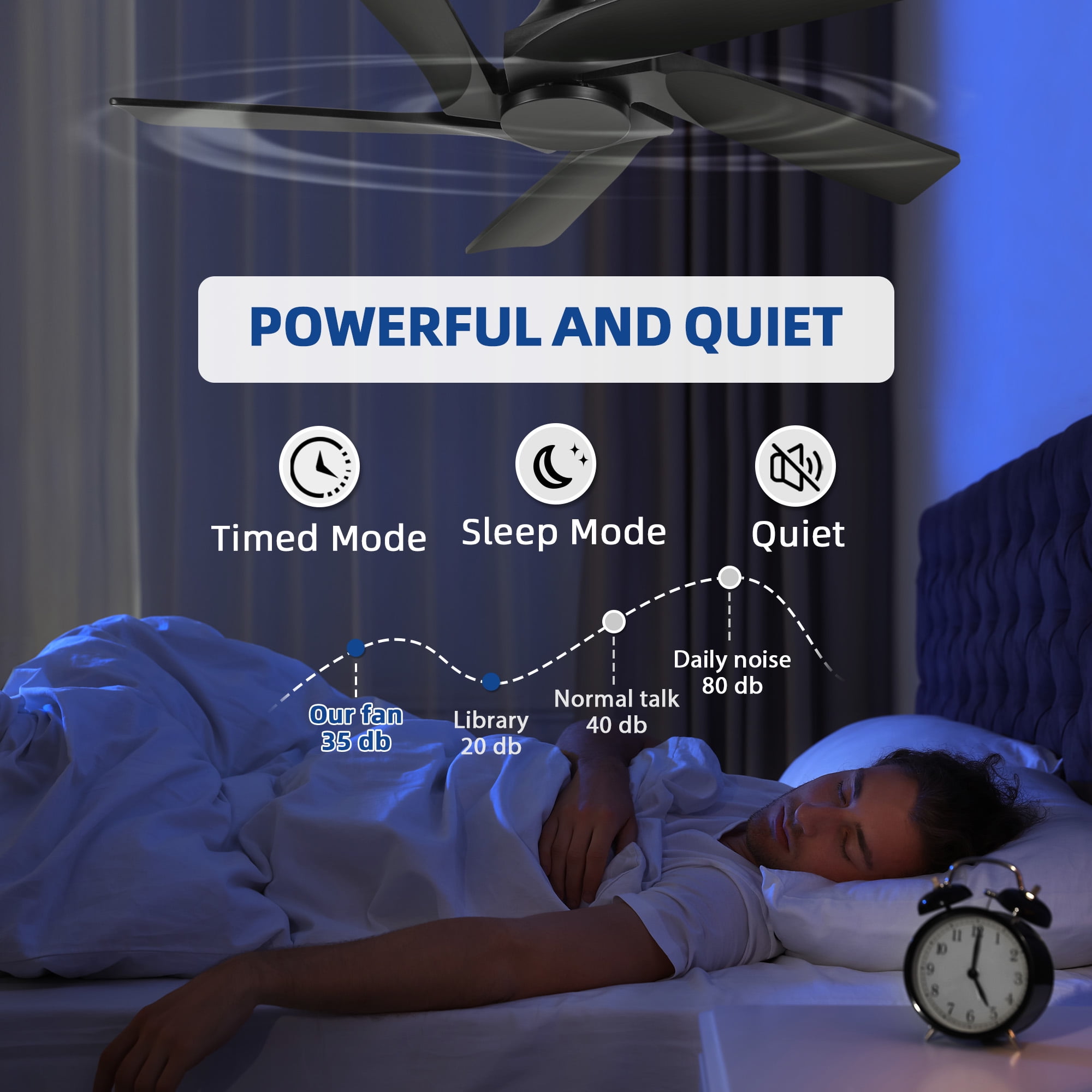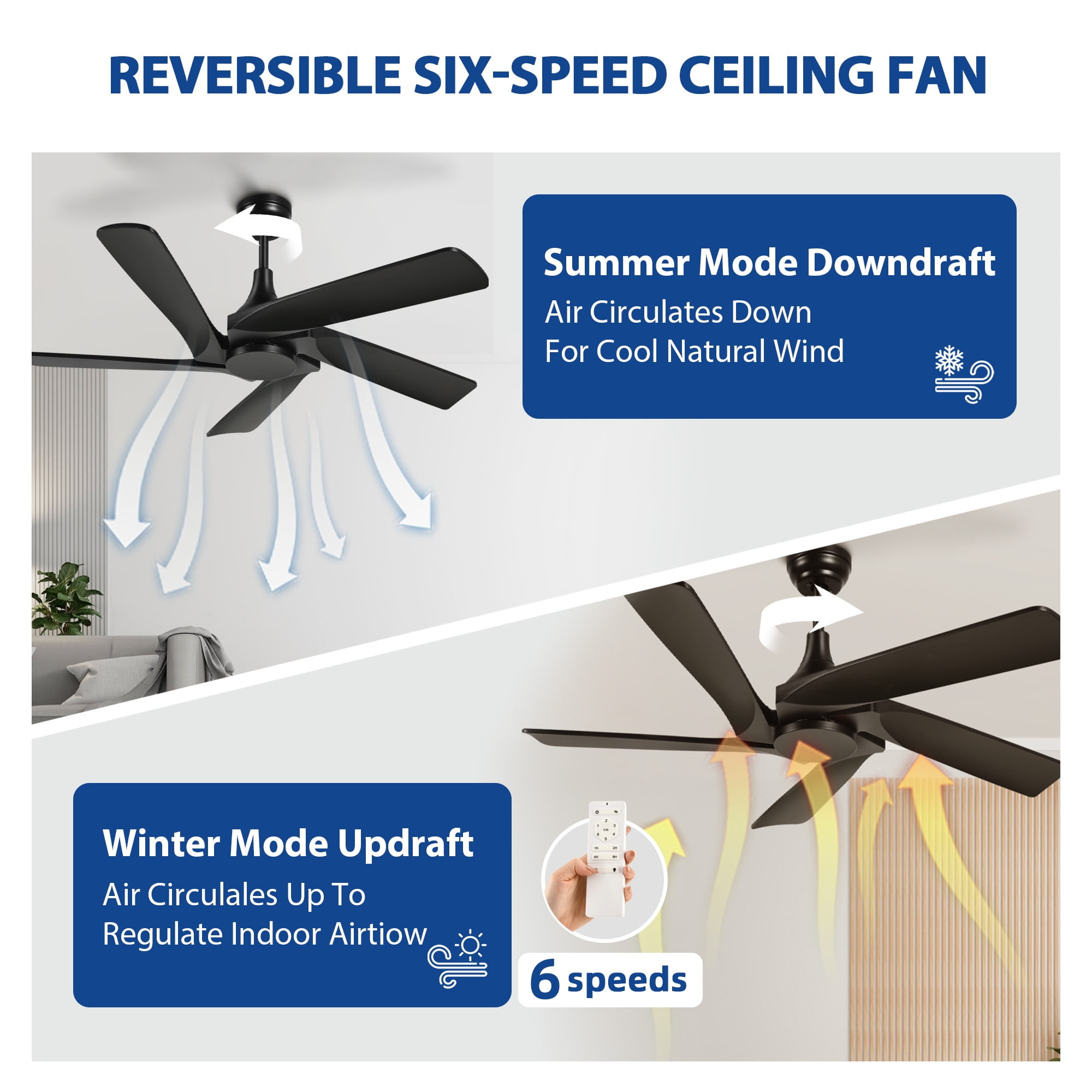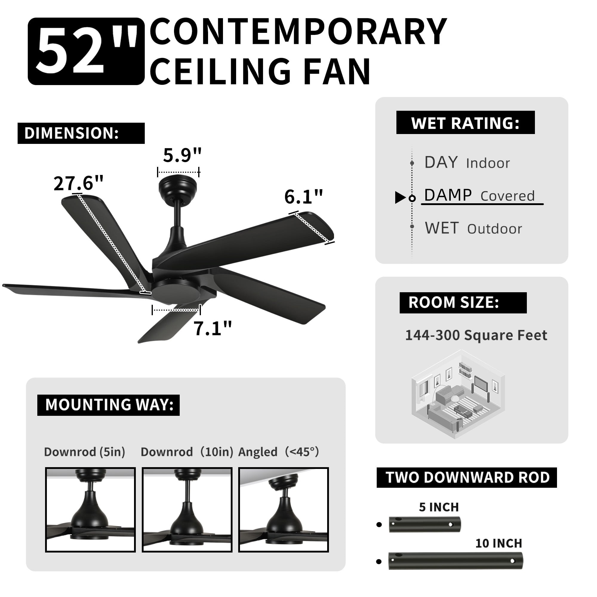 Smart Control and Serene Environment: Experience next-level convenience with this 52-inch ceiling fan featuring remote control access for an enhanced smart home experience. With the ability to select from 6 fan speeds and operate quietly at 30dB or below, this fan ensures a tranquil environment for relaxation, work, or study sessions. Additionally, a timer function allows you to effortlessly create a peaceful atmosphere tailored to your needs. Effortless Air Circulation: Delight in the robust airflow of this 6-speed large ceiling fan without lights, operating quietly below 35dB while delivering powerful ventilation. By consuming 50% less electricity, this fan not only fosters a serene ambiance but also offers versatility with a timer function (1H/2H/4H/8H), making it a perfect companion for creating a conducive atmosphere for rest, exercise, or focused work. Seasonal Adaptability and Energy Savings: Embrace the versatility of this modern ceiling fan equipped with 5 solid wood blades, allowing you to seamlessly switch between downward airflow for summer and upward airflow for winter. Enhancing air circulation and conserving energy, its energy-efficient DC motor ensures a comfortable living environment while adding a touch of elegance to your home décor with its uniquely designed blades. Efficient Memory Retention: Say goodbye to the hassle of readjusting your settings each time you use your outdoor black ceiling fan. Equipped with a handy memory function, this fan effortlessly recalls your preferred settings, offering a seamless and personalized experience every time you switch it on. Versatile Installation Options: Elevate your living spaces with this bedroom ceiling fan that includes 5-inch and 10-inch down rods, catering to various ceiling heights and offering flexible installation choices such as flush or angled/sloped setups. Whether adorning indoor areas like bedrooms, living rooms, kitchens, and dining rooms or enhancing outdoor spaces like covered patios, porches, and gazebos, this fan ensures optimal comfort and style wherever it’s placed.