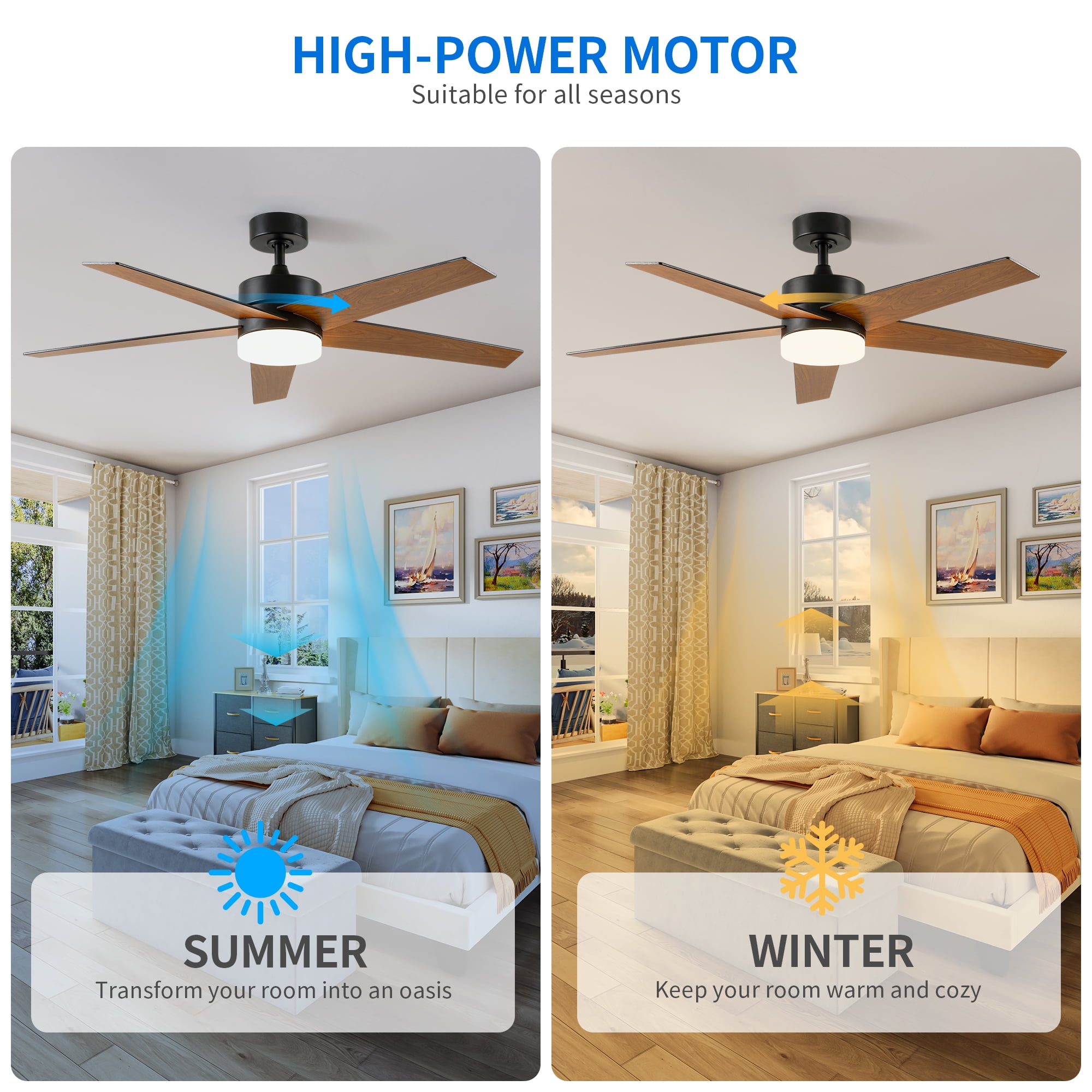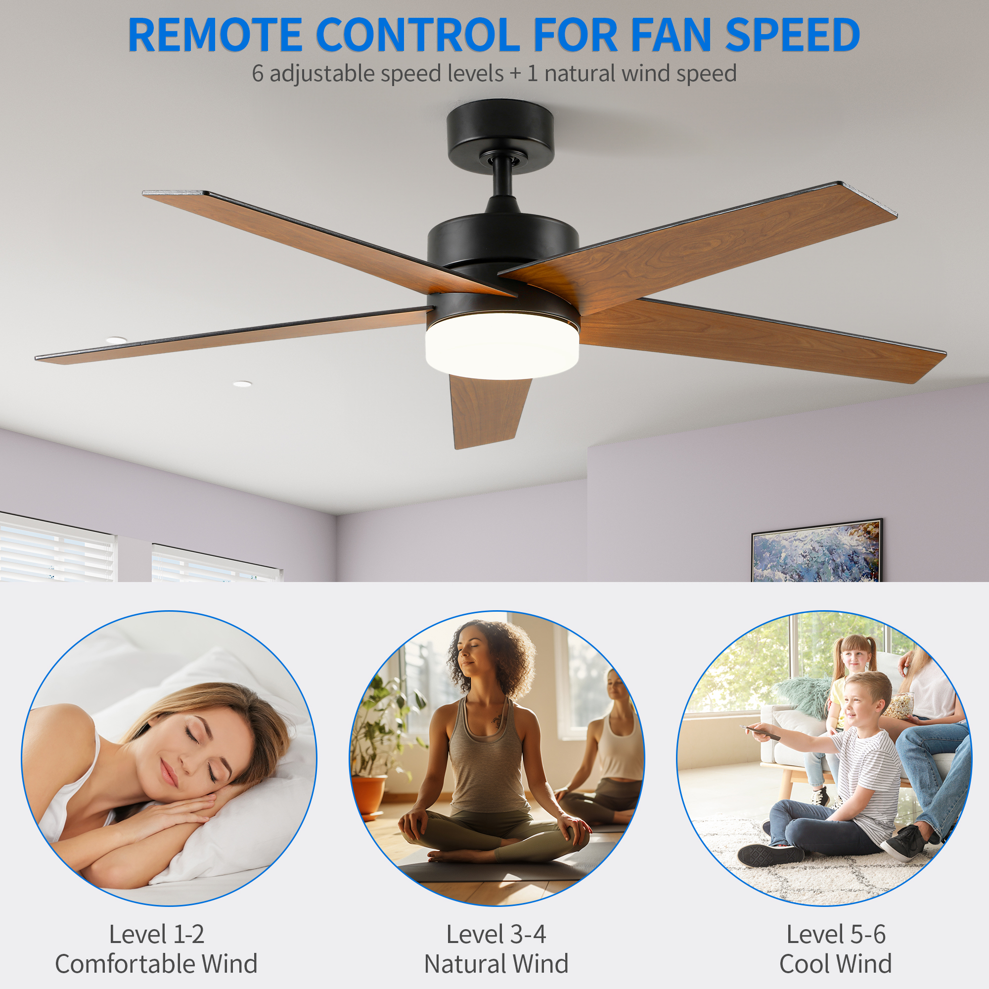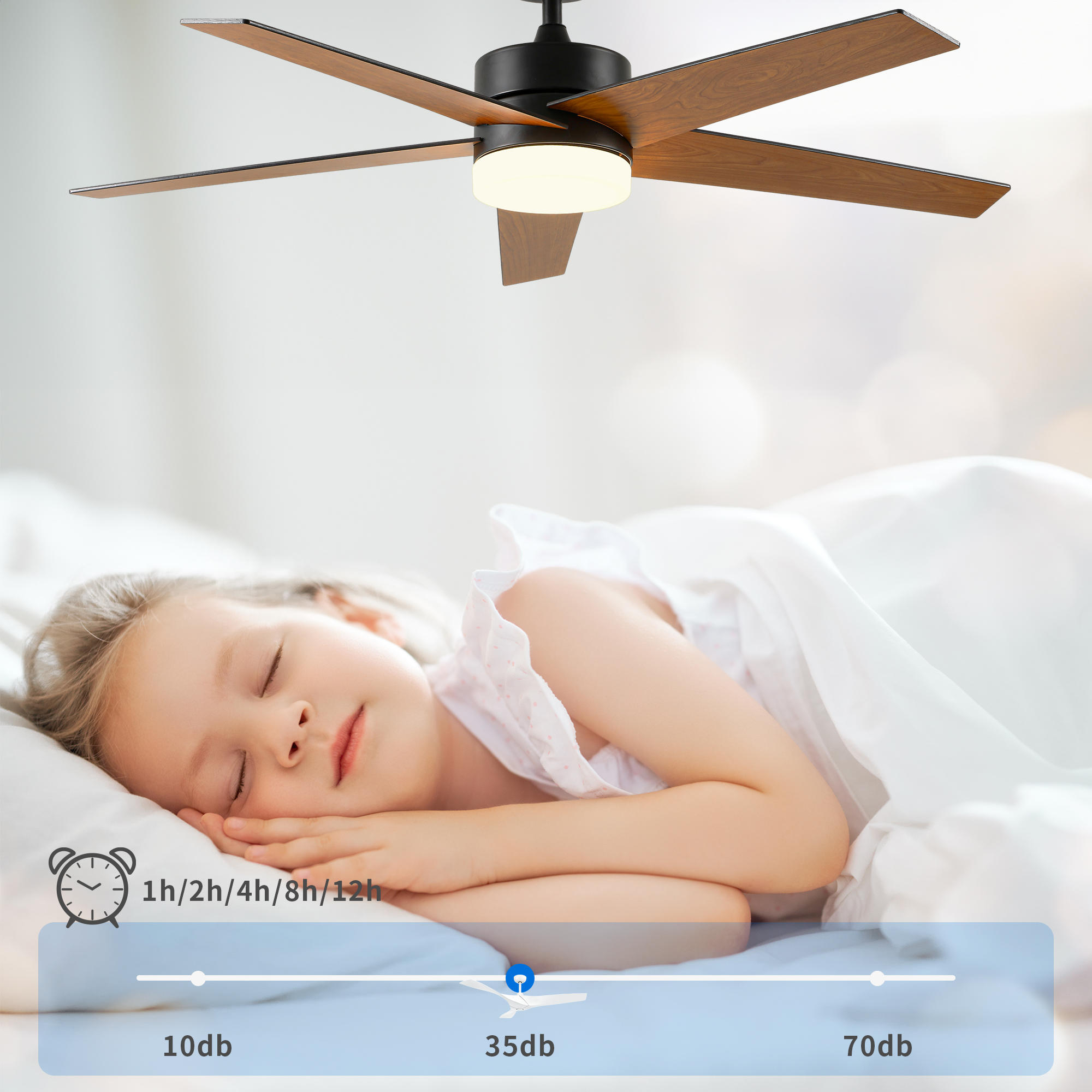 Stylish Ceiling Fan with Light: Enhance your decor with this stylish and versatile ceiling fan. Featuring a chic contemporary design and five-blade construction, it effortlessly complements any interior. With its powerful 35W DC motor, it provides the perfect lighting ambiance for any occasion, offering warm, cool, or focused illumination options. Smart Timer Functionality: Take advantage of four timer modes (1H, 2H, 4H, and 8H) for added convenience and energy efficiency. Program the fan to operate at specific times and enjoy automatic shut-off after a designated period. Customizable Comfort: Enjoy paramount comfort with six adjustable fan speeds and a reversible motor for optimal airflow control. During hot summer days, select clockwise rotation for a refreshing breeze, while in winter, choose counterclockwise rotation for gentle warmth distribution. Versatile Lighting Options: Illuminate your space with the built-in 18W LED light source, offering adjustable color temperatures (3000K – warm white, 4500K – natural white, and 6000K – cool white) to suit various occasions and settings. Effortless Installation, Silent Operation: Designed for hassle-free installation, this modern ceiling fan ensures a smooth setup process. Its sturdy construction and balanced fan blades guarantee quiet operation, providing a serene ambiance in your living room, bedroom, or office, free from distractions.