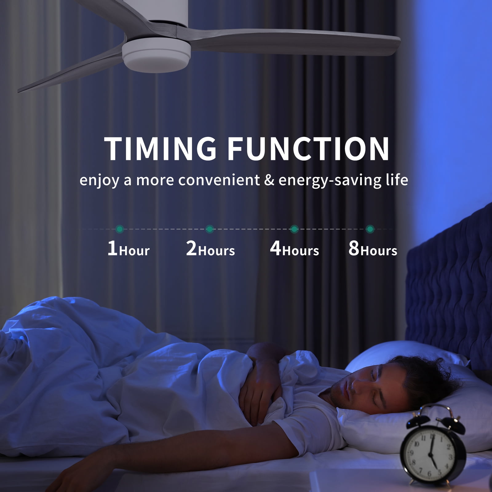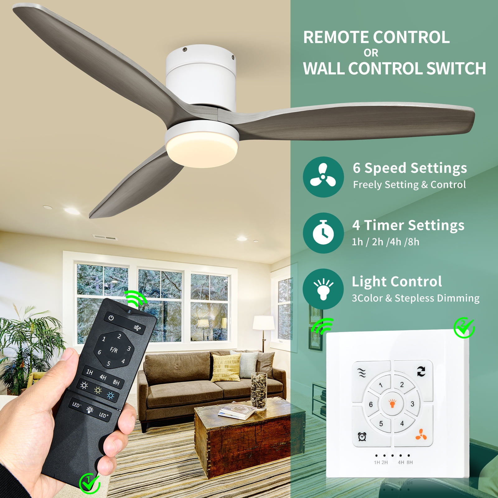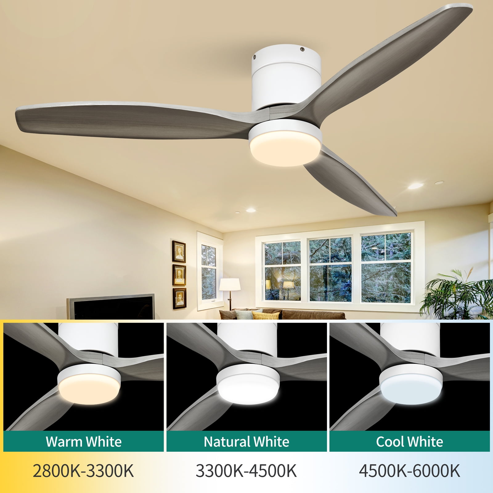 Modern & Stylish Ceiling Fan – The Dextrus 52-inch Ceiling Fan blends rustic wood grain blades with a sleek white and gray finish, adding a contemporary touch to bedrooms, living rooms, dining rooms, patios, and porches. Ideal for 144-300 sq. ft. spaces. Smart LED Lighting with Memory Function – Features an integrated LED light with adjustable warm, natural, and cool white settings. The acrylic lampshade provides clear, soft illumination, and the memory function recalls your last setting. Reversible Airflow for Year-Round Comfort – Enjoy cooling airflow in summer and warm air circulation in winter with the 6-speed reversible DC motor. Easily adjust the fan direction using the included remote control. Ultra-Quiet & Energy-Efficient Performance – The powerful DC motor operates silently below 35 dB, reducing energy consumption by up to 50%. Customize airflow with 6 speed settings and use the 1/2/4/8-hour timer for convenience. Convenient Remote Control – Adjust fan speed, light color, and timer settings from anywhere in the room with the included remote control (battery not included). Durable & Easy to Install – Built with a sturdy iron frame, real wood blades, and a DC power source for long-lasting performance. Flush mount design for a clean, modern look. Easy installation with pre-labeled parts.