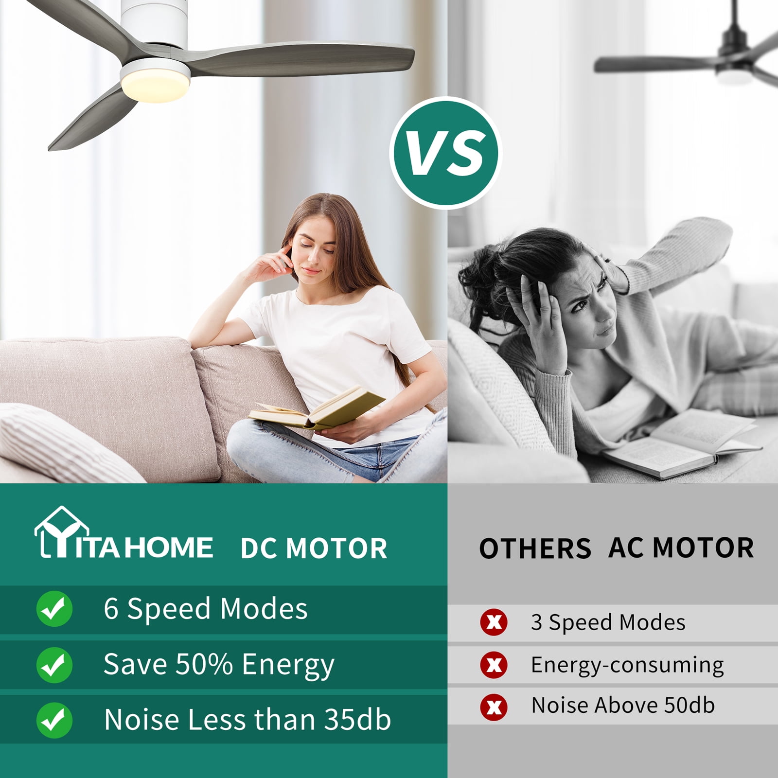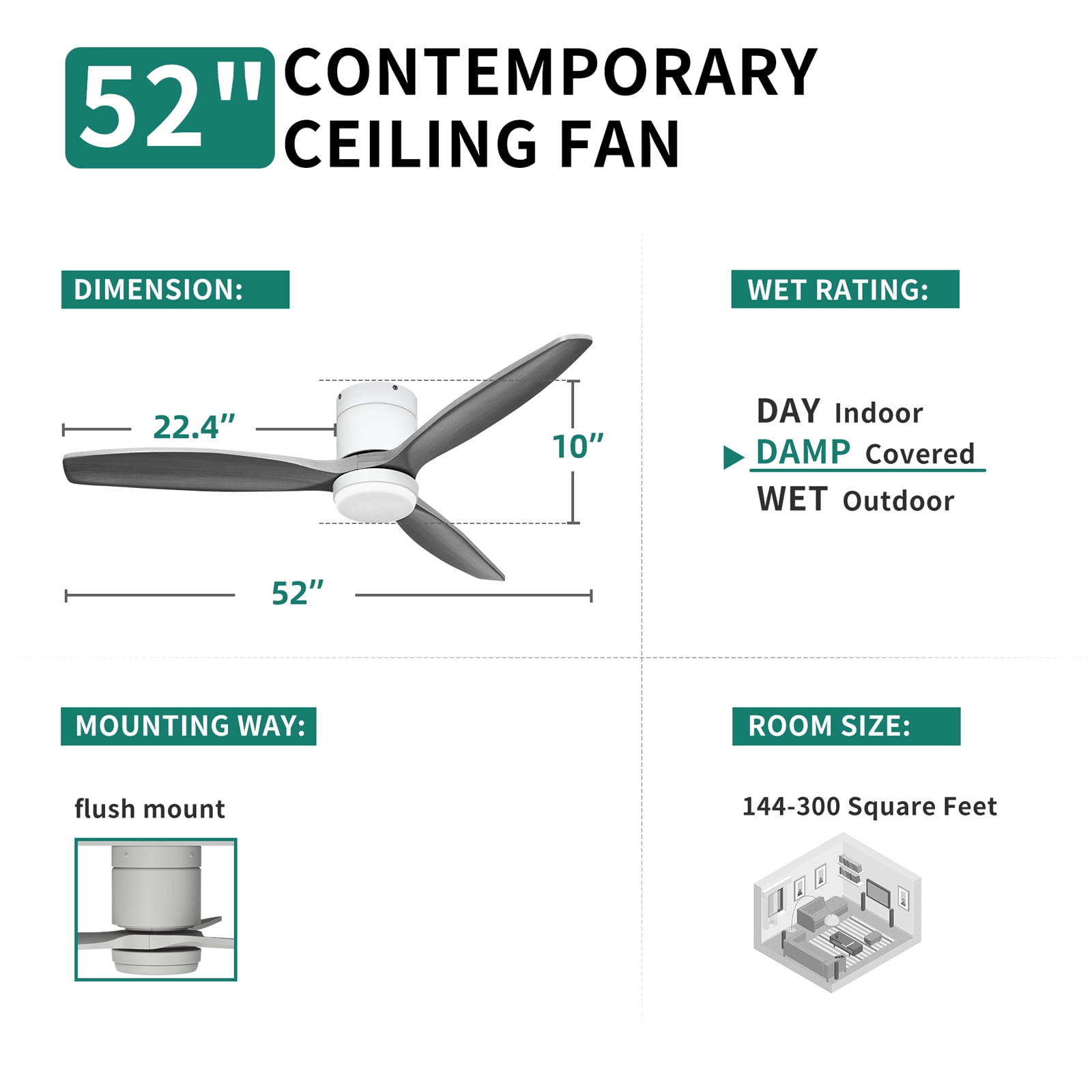 DEXTRUS 52in Low Profile LED Ceiling Fan with Remote, DC Motor, 6-Speed, White & Gray