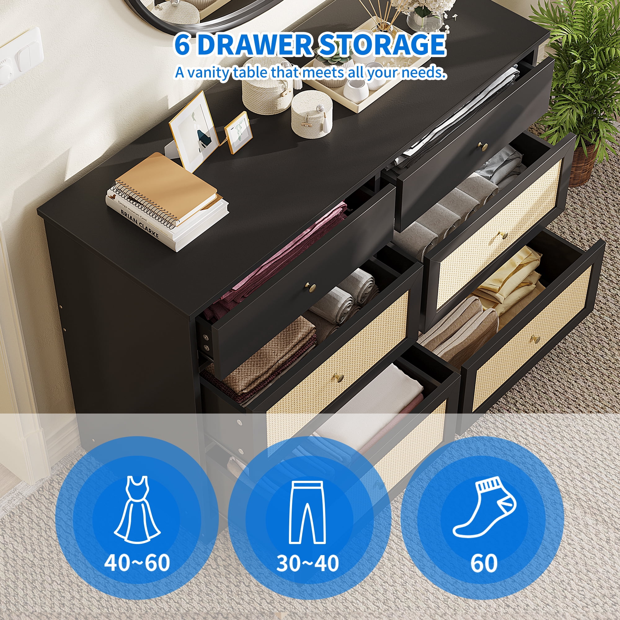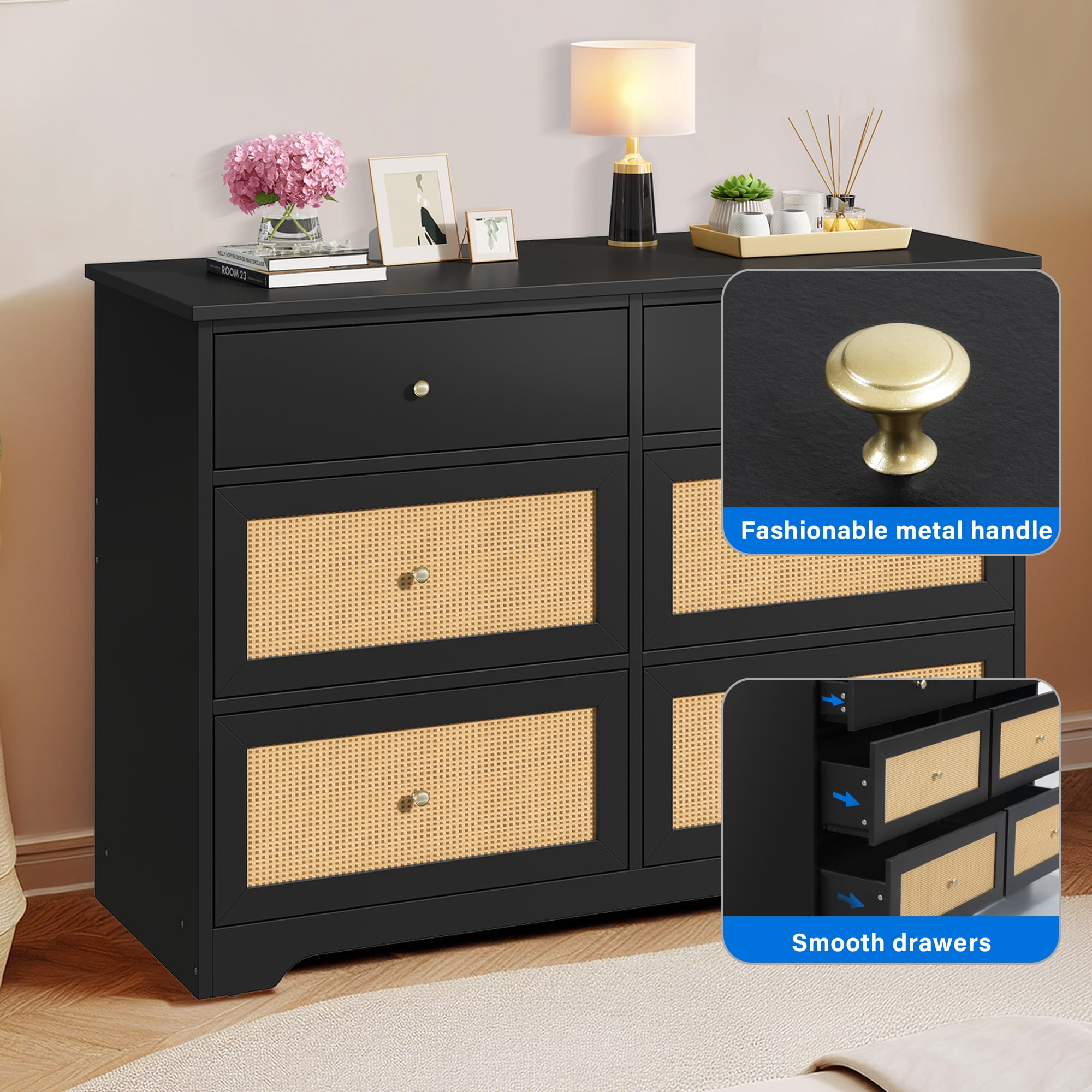 Dextrus 6 Drawer Dresser for , Rattan Double Dresser, Modern Chest of Drawers ,Wood Storage Cabinet for Living Room, Black