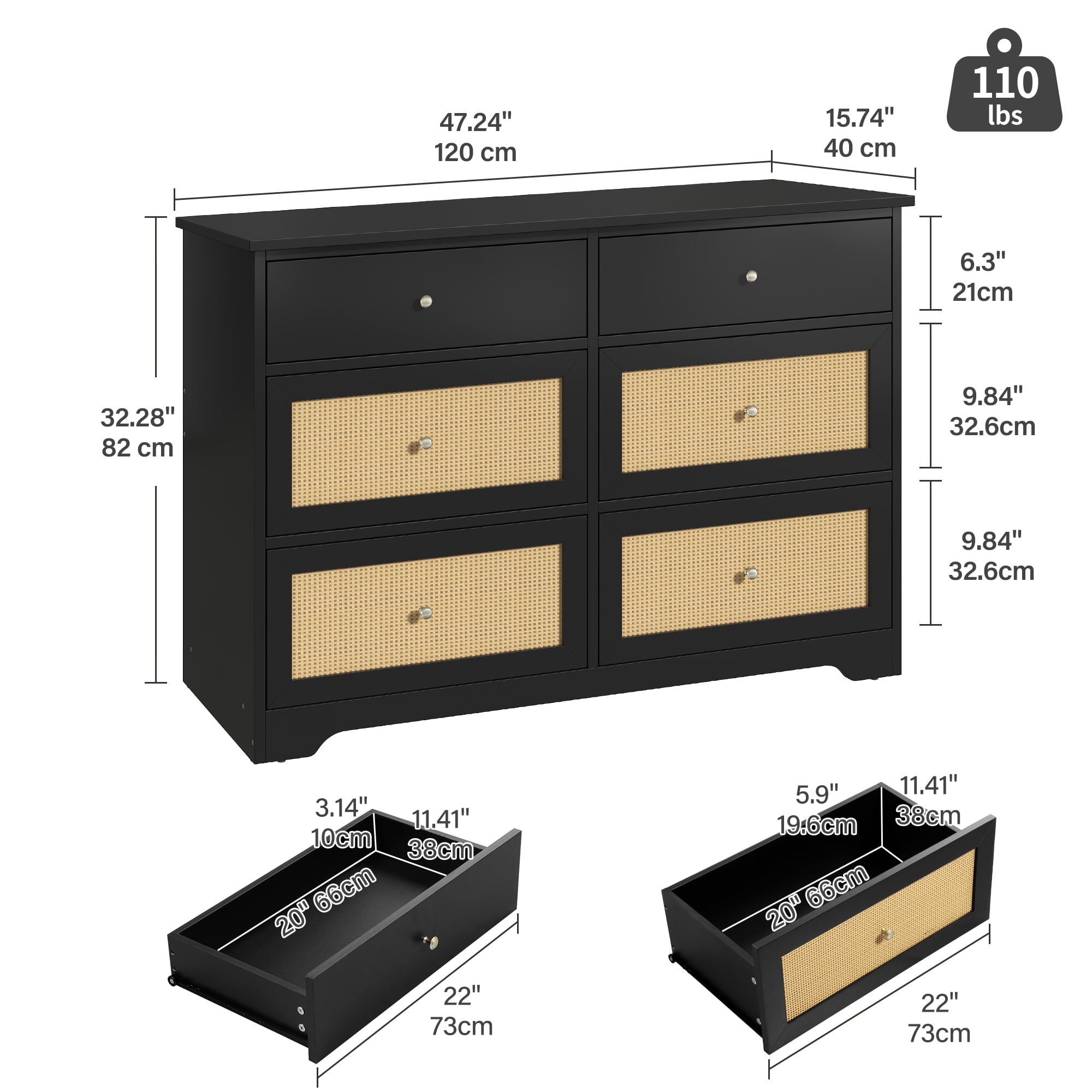 Stylish Mid-Century Design: With its woven rattan and metal handles, this drawer dresser adds a touch of mid-century charm to any home decor. Ample Storage Capacity: Featuring six large drawers, this dresser provides plenty of storage space for clothes, books, and other items, helping you keep your bedroom or living room organized and clutter-free. Versatile Functionality: Not just a dresser, this piece of furniture can also be used as a bedside table, TV stand (suitable for up to 50″” TVs), clothing organizer, entryway table, or accent storage cabinet. It’s a versatile addition to any room. Sturdy and Durable Construction: Made of high-quality MDF wood, this dresser is built to last. The sturdy wooden frame can hold a substantial amount of weight, ensuring its durability over time. Easy Assembly and Excellent Customer Service: With all the necessary hardware and clear instructions included, this dresser is easy to assemble. Additionally, our dedicated customer service team is ready to assist you and provide a satisfactory solution to any issues you may encounter.