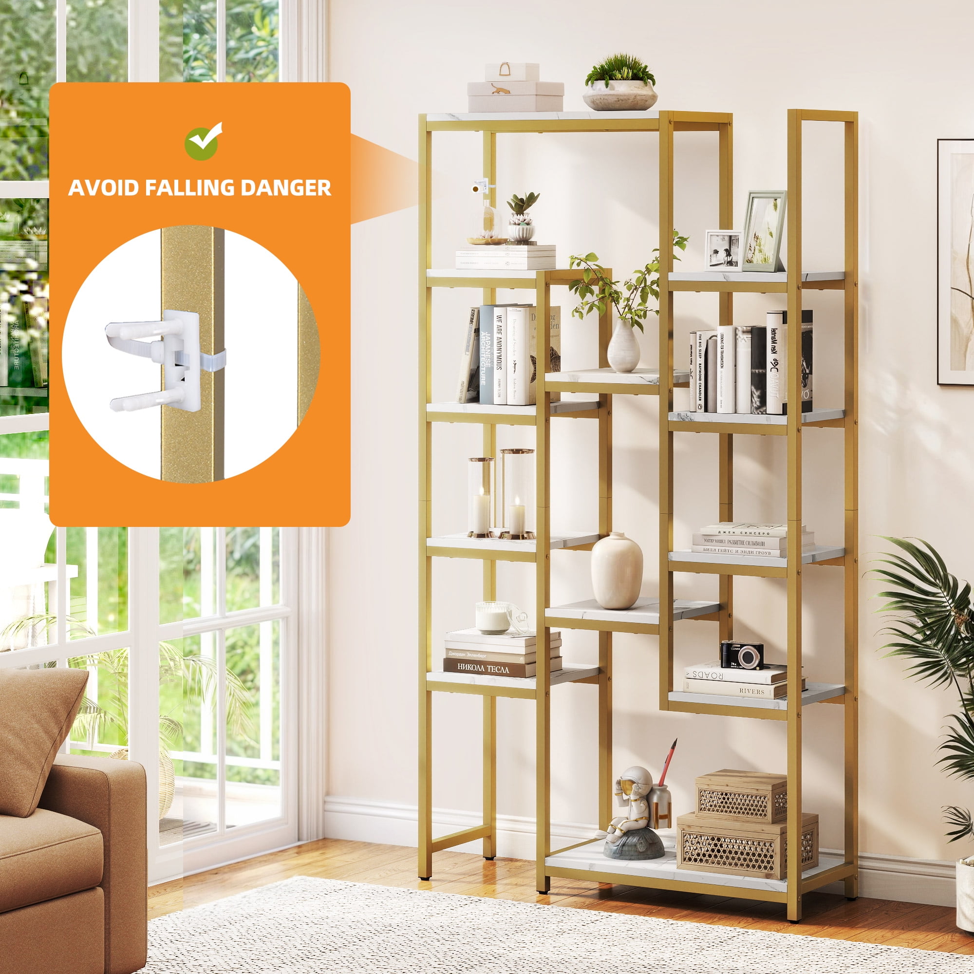 Large storage space: The bookshelf has 12 storage areas to help organize and display books, photos, and other items, keeping your home office tidy. Multi-purpose use: The bookshelf can also be used as a room divider in the living room or office to separate spaces. High-quality materials: Made of thick particle boards and a sturdy metal frame, the bookshelf is stable and can hold heavy items without wobbling. The faux marble finish is smooth, waterproof, and scratch-proof, ensuring durability. Improved stability & safety: Two anti-tipping devices are included to secure the bookshelf to the wall for added safety. The adjustable feet pads protect the floor from scratches. Easy assembly: The bookshelf comes with all necessary accessories and a user manual for easy assembly. Specification: Material: Particle Board; Metal Frame Color: Marble Board & Gold Frame Dimensions: 38.58″ x 11.81″ x 71.06″ (W x D x H) Package Contents: 1 x Bookshelf; 1 x Packet of Fittings; 1 x Instruction Manual