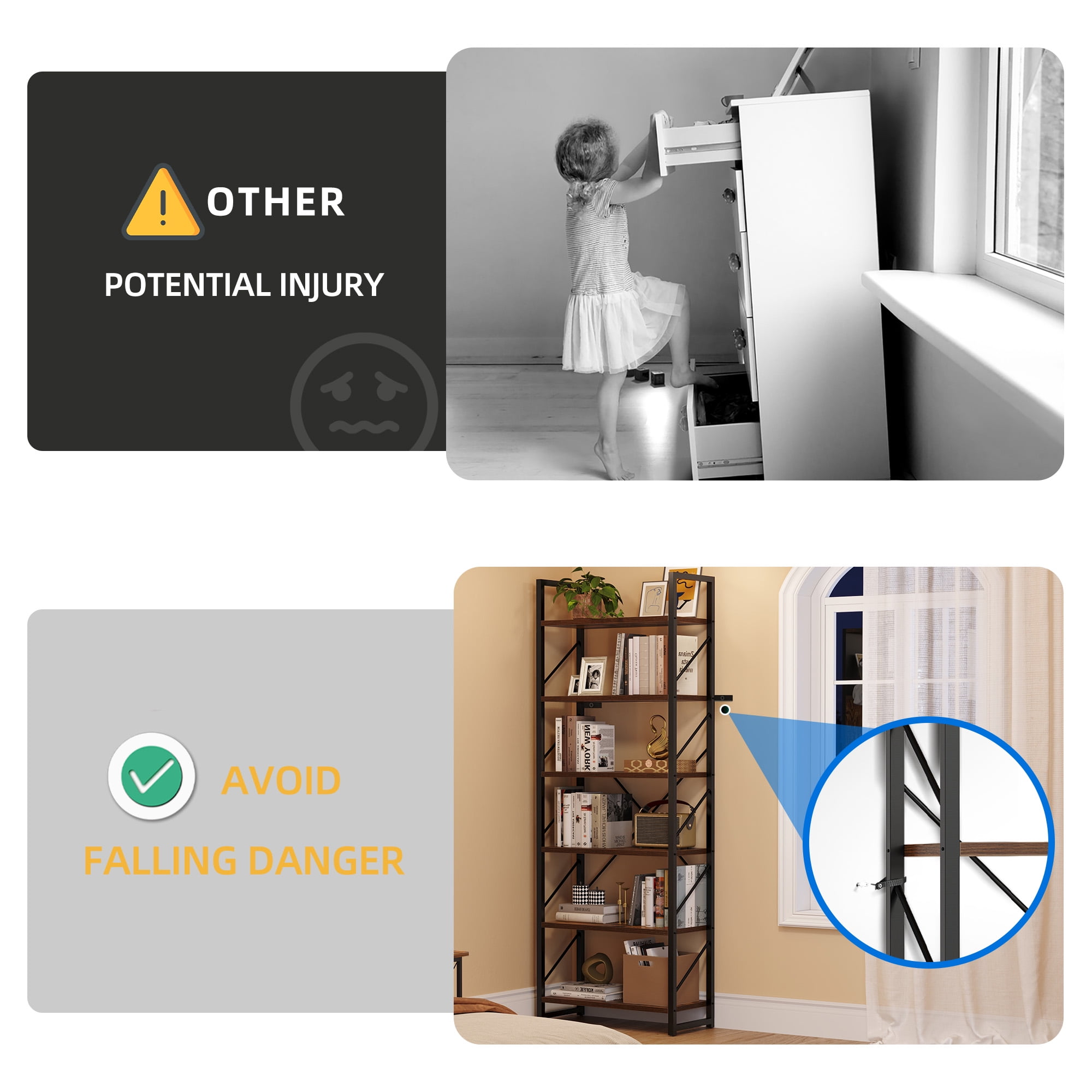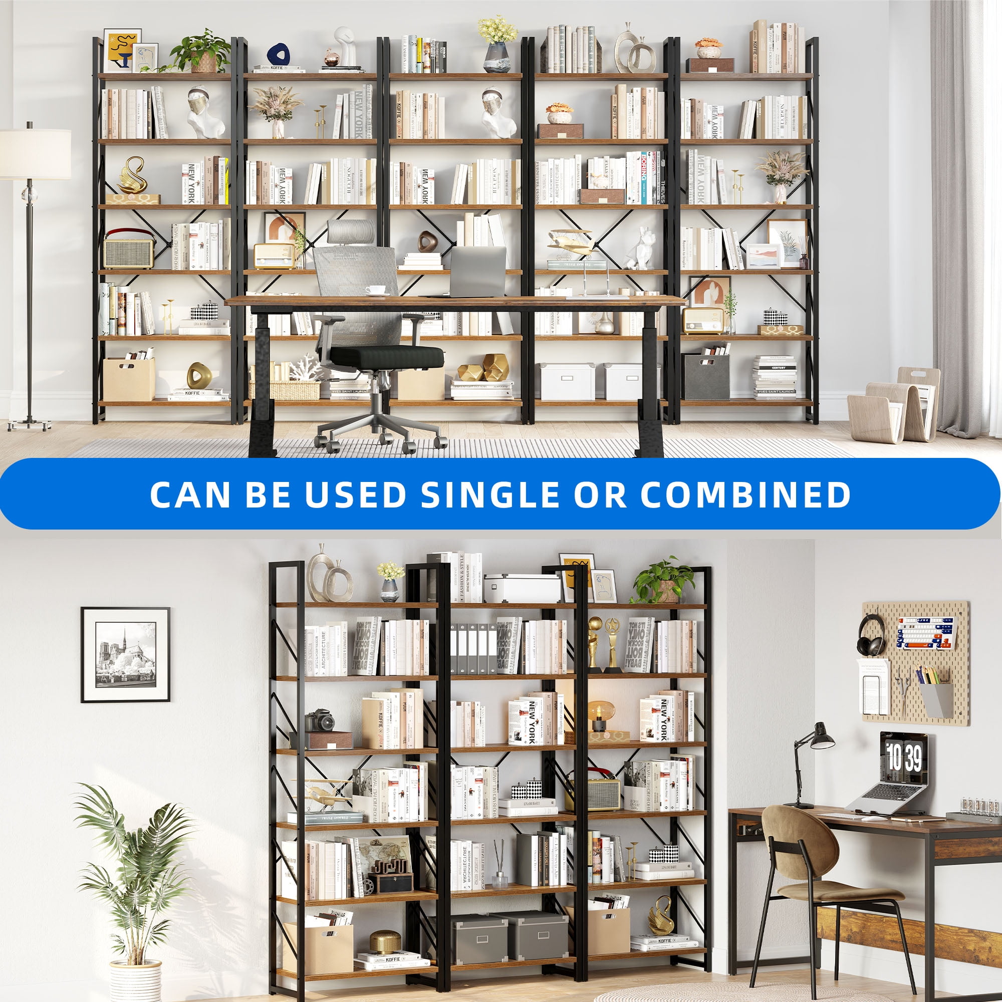 Spacious and Accessible Storage: The 6-Tier Shelf features 6 open shelves that provide ample space for storing and displaying your favorite books, curios, framed photos, and more. The practical design ensures easy access to your belongings, allowing you to organize your home office or any other room aesthetically. Modern and Versatile: With its classic modern look, this bookshelf not only serves as a storage solution but also doubles as a plant shelf or display shelf. Its multifunctional design makes it suitable for various rooms such as the bedroom, living room, kitchen, office, hallway, and more. It effortlessly blends in with any decor style. Scratch-Proof and Durable: The smooth particle board of the bookshelf is coated with a scratch-proof and waterproof melamine finish. This ensures a long-lasting appearance and protects the shelf from everyday wear and tear. The combination of the melamine finish and matte steel frame enhances the durability and stability of the shelf. Enhanced Stability: Our designer team has strengthened the stability of the bookshelf to prevent wobbling. The addition of X-bracing support provides better sturdiness, while the adjustable feet ensure stability even on uneven floors. The oblique-line side design prevents books from falling out, and two anti-tipping devices are included to secure the shelf to the wall, ensuring the safety of your family. Easy Assembly: The 6-Tier bookShelf is designed for easy assembly. All the necessary accessories are included, and you can quickly put it together with the help of an easy-to-understand illustrated manual. Enjoy the convenience of a stylish and functional shelf without the hassle of complicated assembly.