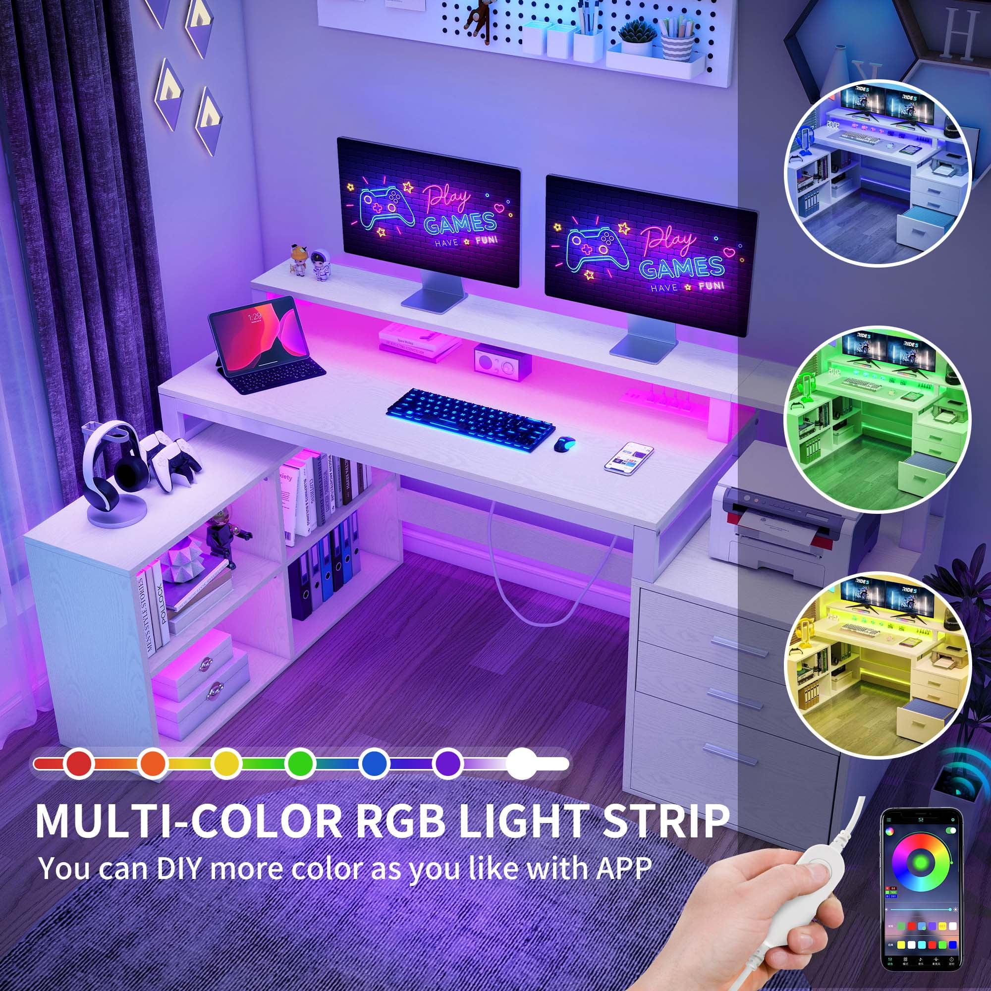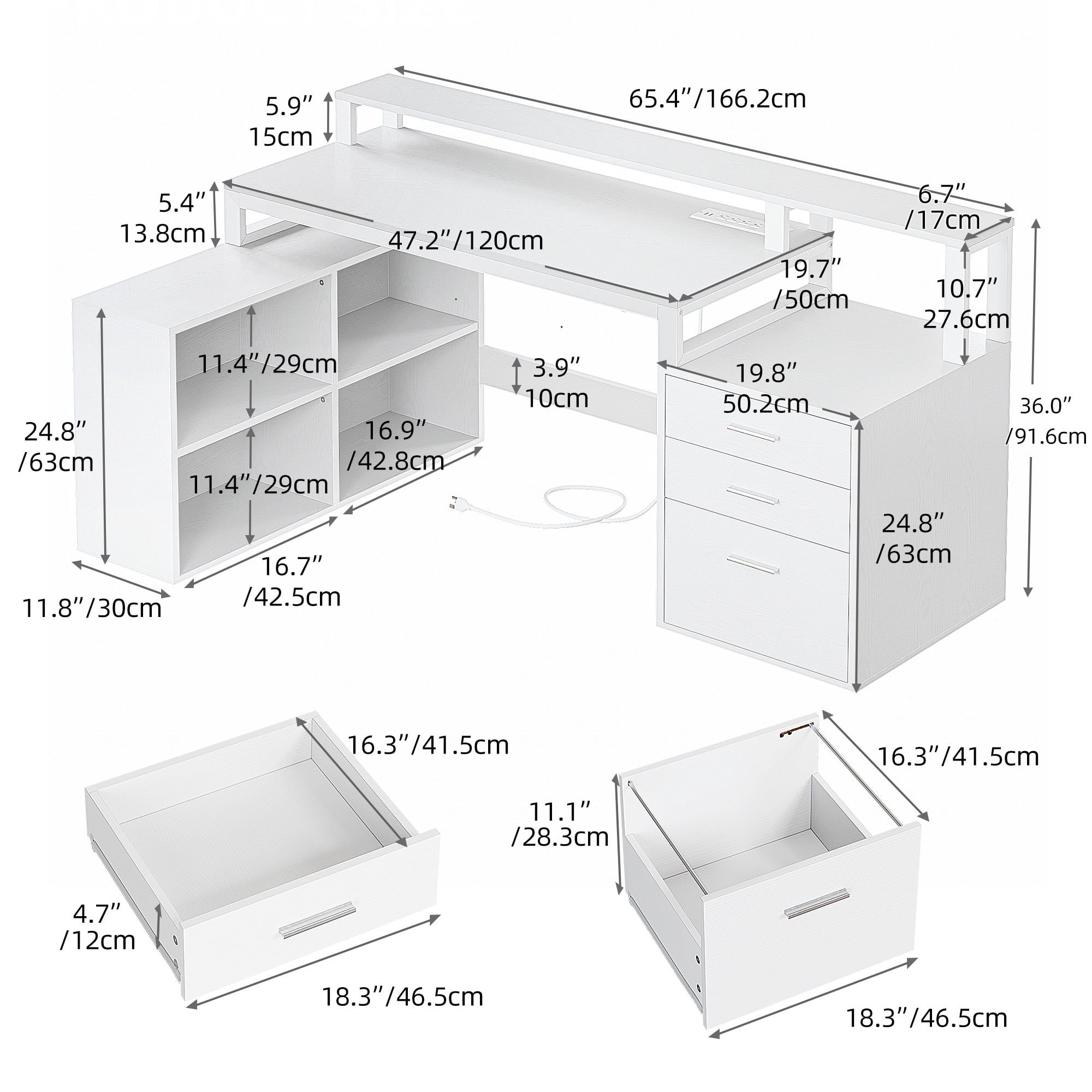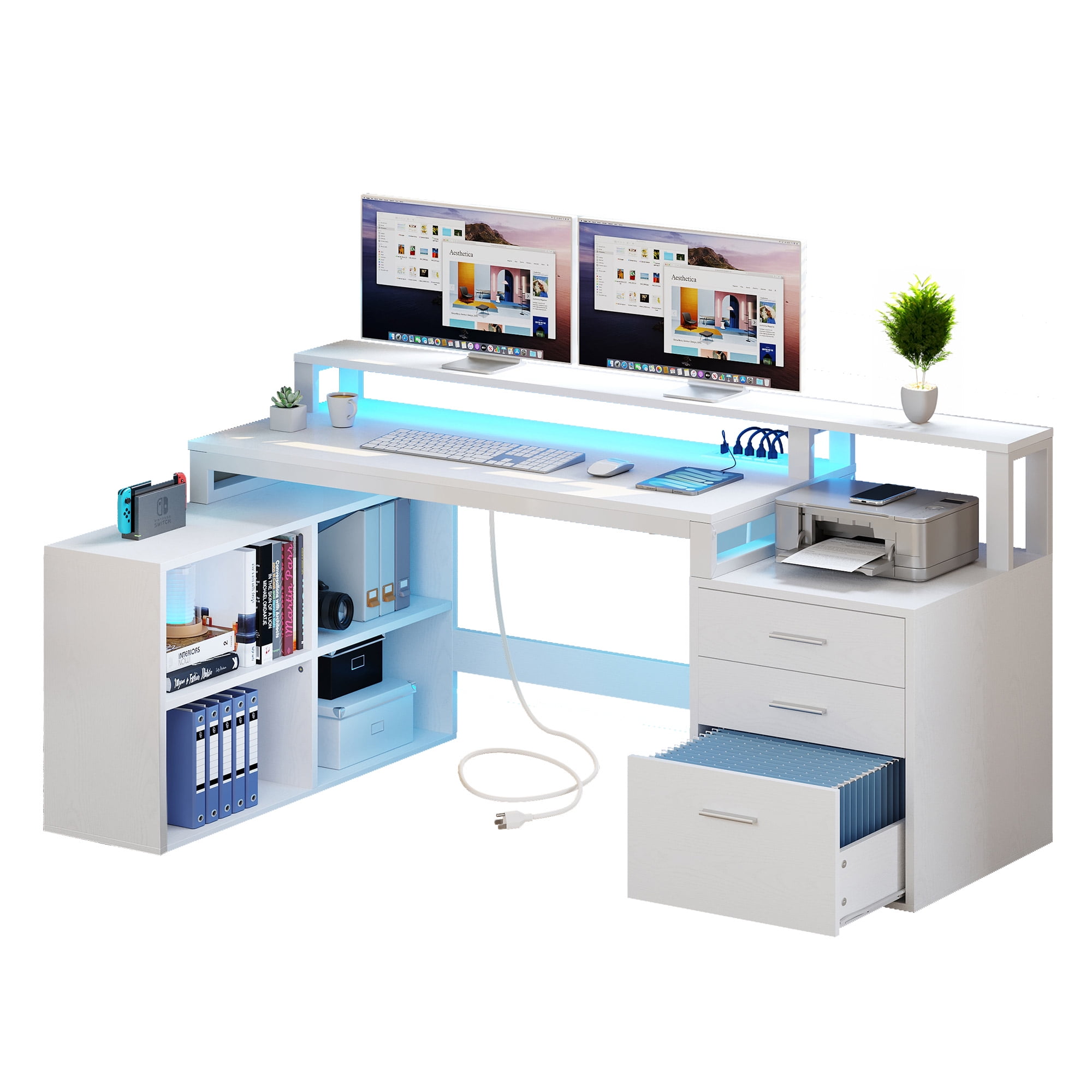 Enhance your productivity and maximize your corner space with our versatile L-shaped desk. Whether you need a computer desk, writing desk, or gaming desk, this design has got you covered. Stay connected and keep your devices charged with the convenient built-in charging station, featuring 2 USB ports and 4 standard outlets. Create a cozy and inviting atmosphere with the integrated LED lights, perfect for those late-night work sessions. The included monitor stand not only raises your monitor to eye level but also promotes good sitting posture. With ample storage space for all your office essentials, including hanging files, printers, and books, this desk combines functionality with style. Upgrade your workspace today and experience the difference.
