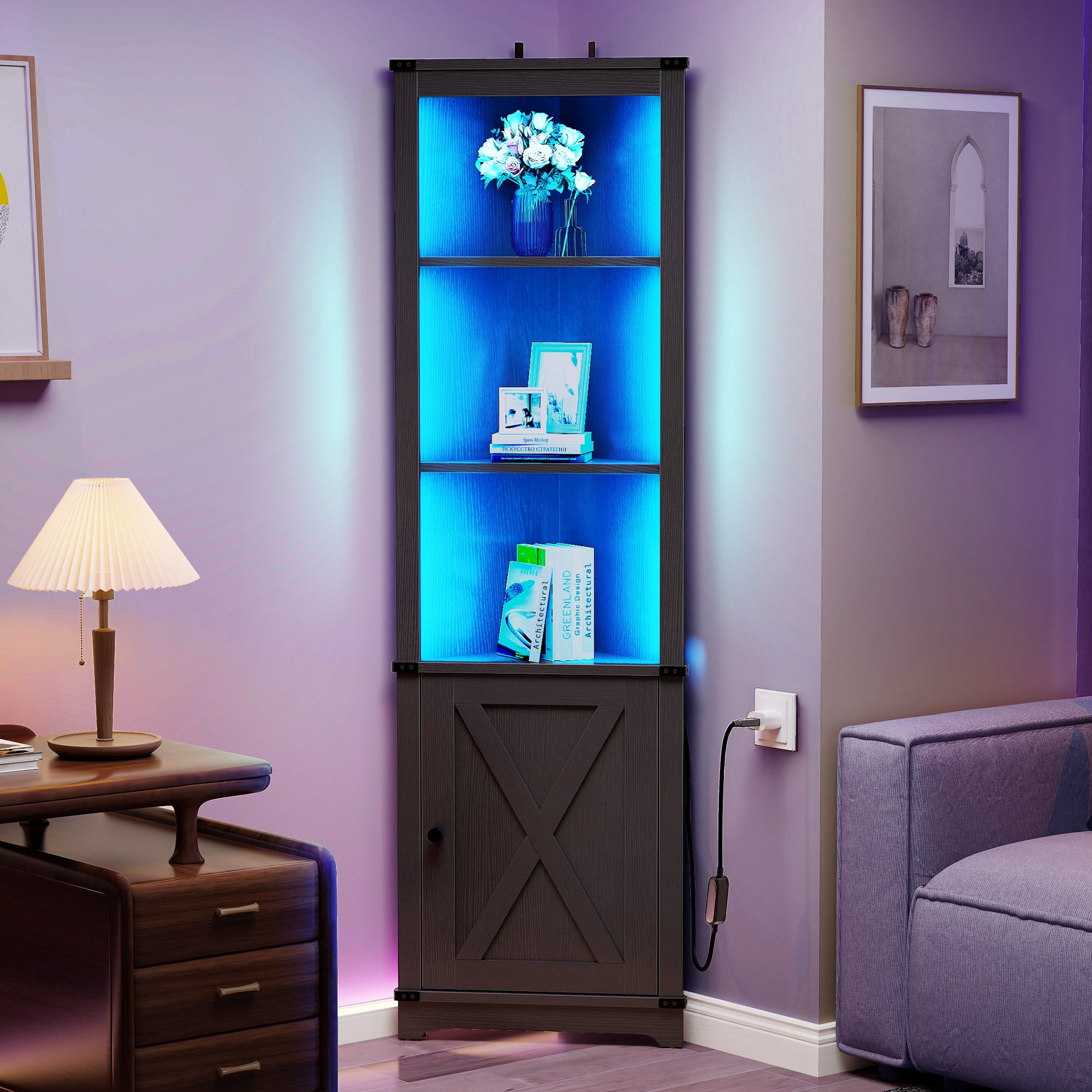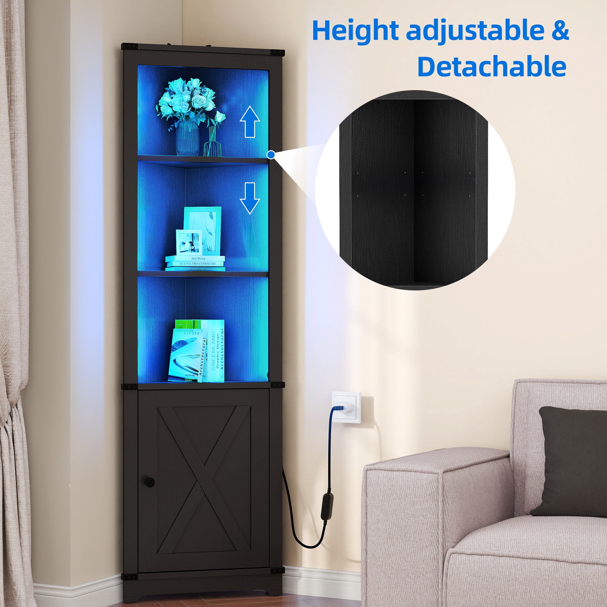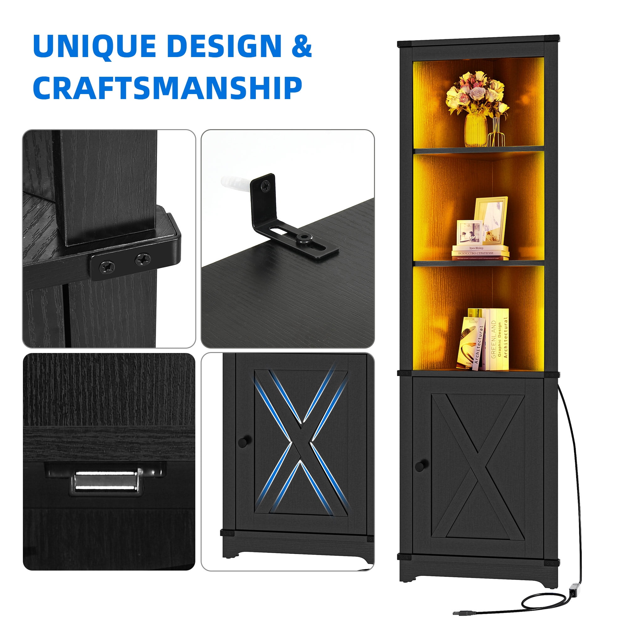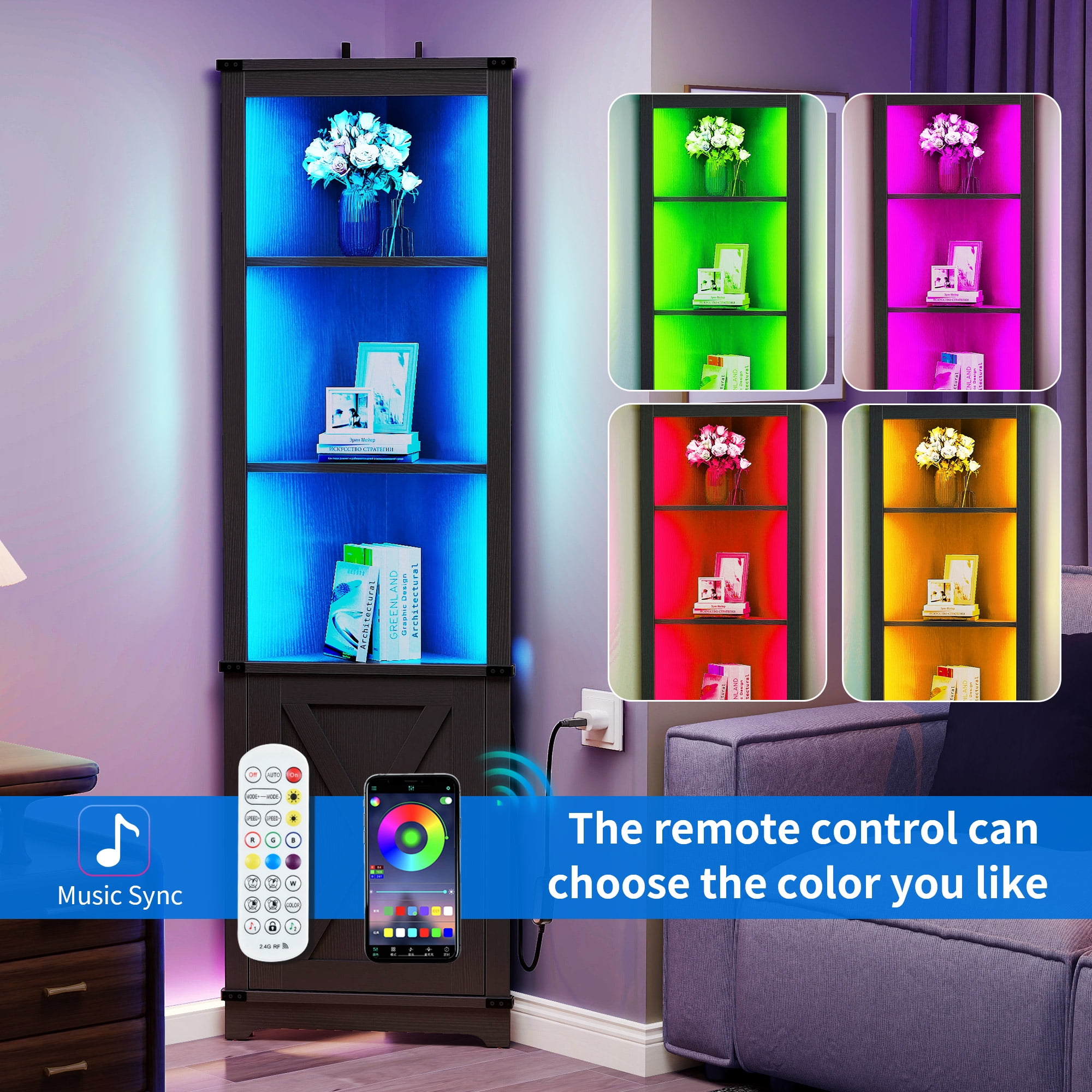Great quality and Stability: Crafted from high-quality MDF, this corner storage cabinet ensures stability and durability. It can bear heavy loads, making it suitable for use as a wine cabinet, corner bookshelf, or corner display rack, adding both functionality and style to your home. Efficient Space Utilization: Maximize your storage options with the space-saving design of this corner shelf. Its 90° right angle design allows it to fit seamlessly into any corner, transforming idle corners into valuable storage areas. Perfect for various rooms such as living rooms, bedrooms, offices, bathrooms, and more. Dynamic LED Lighting: Illuminate your space with the corner shelf’s LED light, offering 20 colors and 21 dynamic modes. Create the perfect ambiance with options like flash, storage, fade, and smooth, all easily controlled through a phone app or remote. Charming Farmhouse Style: Embrace the farmhouse aesthetic with the unique barn door design of the double-tier storage cabinet at the bottom of this corner shelf. It adds a touch of rustic charm and complements your home decor beautifully. Versatile Open Display: With its 3-tier open storage design, this corner cabinet provides ample space to showcase books, framed photos, wine bottles, glasses, and more. The detachable and adjustable shelf allows for flexible arrangement to accommodate items of different heights.