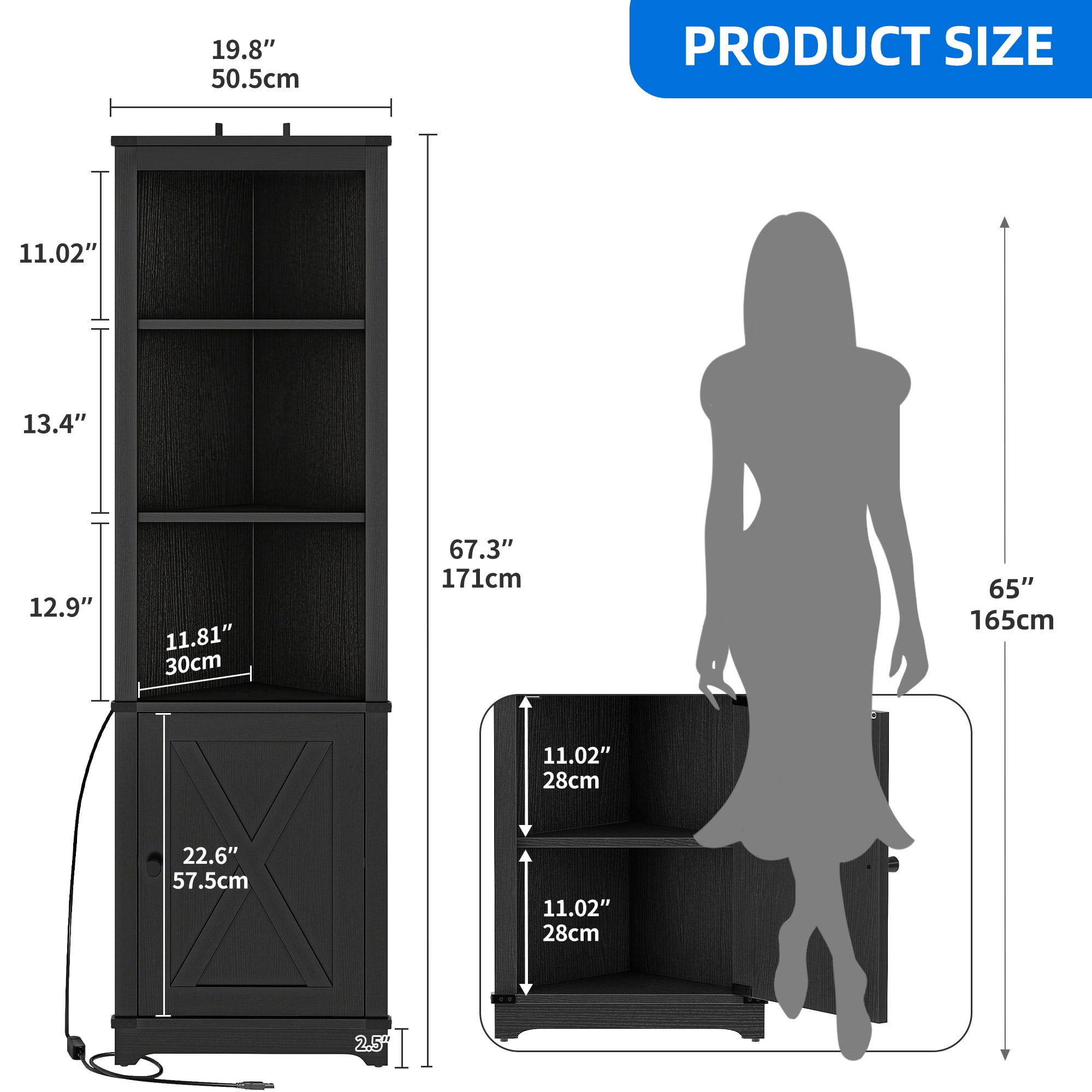 Upgrade your home with our charming Corner Storage Cabinet. It features 3 open shelves for displaying decor and a detachable, adjustable shelf for customized storage. The magnetic door keeps your items hidden, and an LED light offers 20 colors and 21 modes for the perfect ambiance. Use it as a bookshelf, wine cabinet, or in any room for versatile storage and style. Specifications: Product Dimensions: 11.81″D x 19.8″W x 67.3″H Mounting Type: Freestanding Room Type: Laundry Room, Bathroom, Kitchen, Bedroom, Living Room Door Style: Barn Door Design Number of Doors: 1 Package Contents: 1 x Corner Cabinet 1 x Accessory Kit 1 x Instructions Manual
