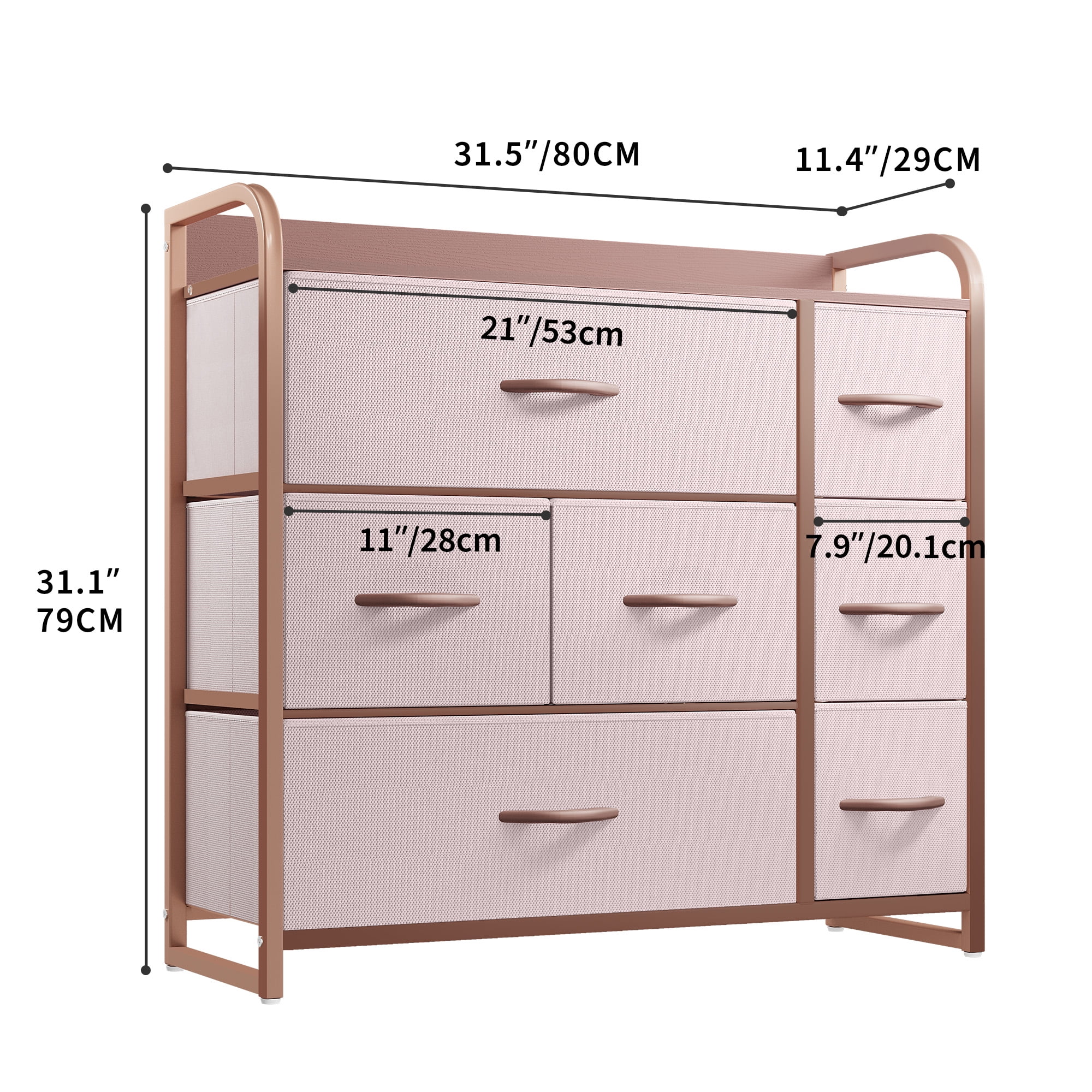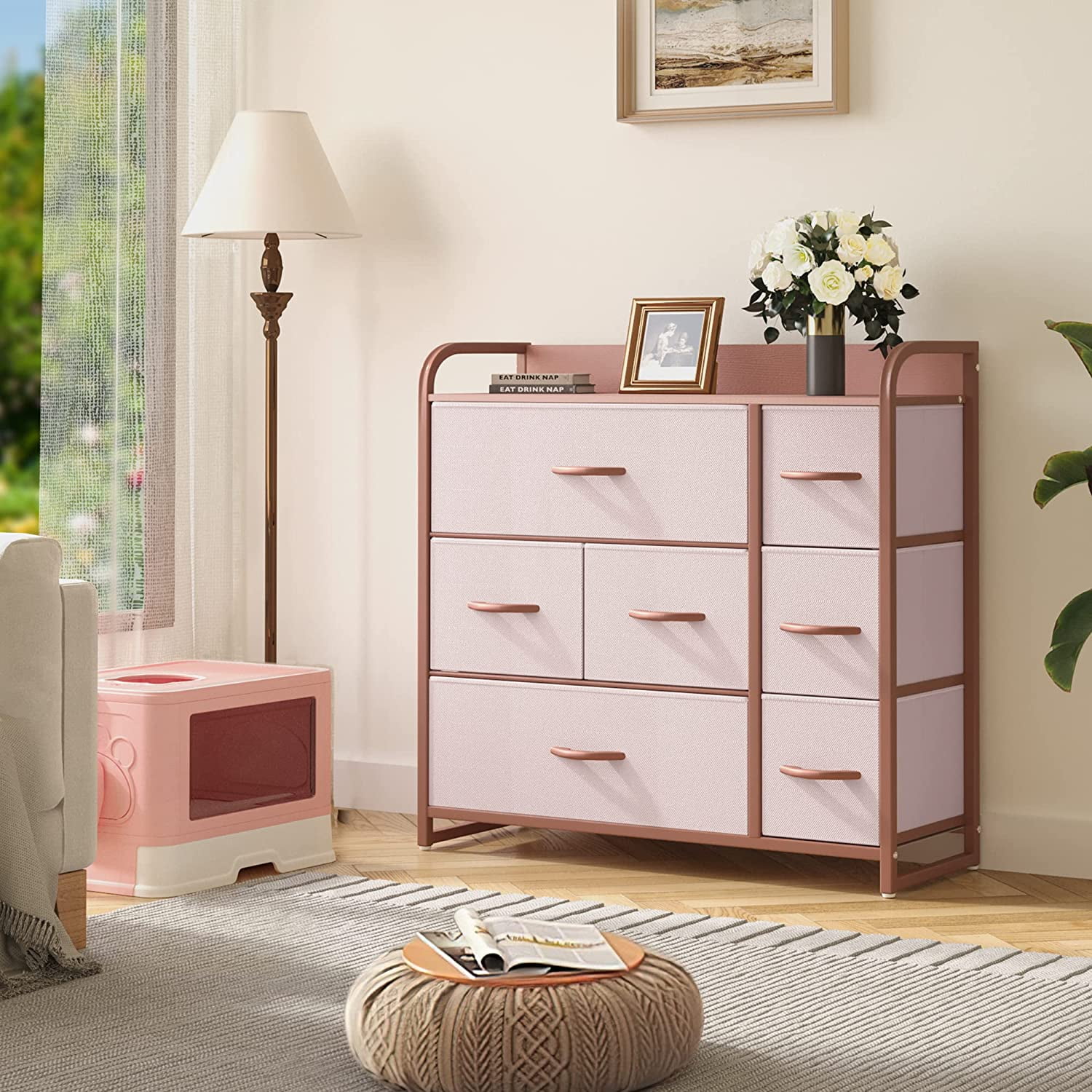 Dextrus creates modern, minimalist furniture designed for everyday use. This 7-drawer fabric dresser offers ample storage for clothes, accessories, and household essentials. It features a sturdy metal frame, a durable MDF wooden top, and soft, foldable fabric drawers for long-lasting use. Measuring 31.5″ L x 11.4″ W x 31.1″ H and weighing 24 pounds, its compact and lightweight design fits perfectly in bedrooms, living rooms, nurseries, or entryways. The pink color adds a touch of elegance to any room, while the easy-pull drawers make organizing simple. Suitable for adults and kids, this dresser is easy to assemble with included instructions. Whether you need extra storage for clothes or household items, the Dextrus 7-Drawer Fabric Dresser is a stylish and functional choice.