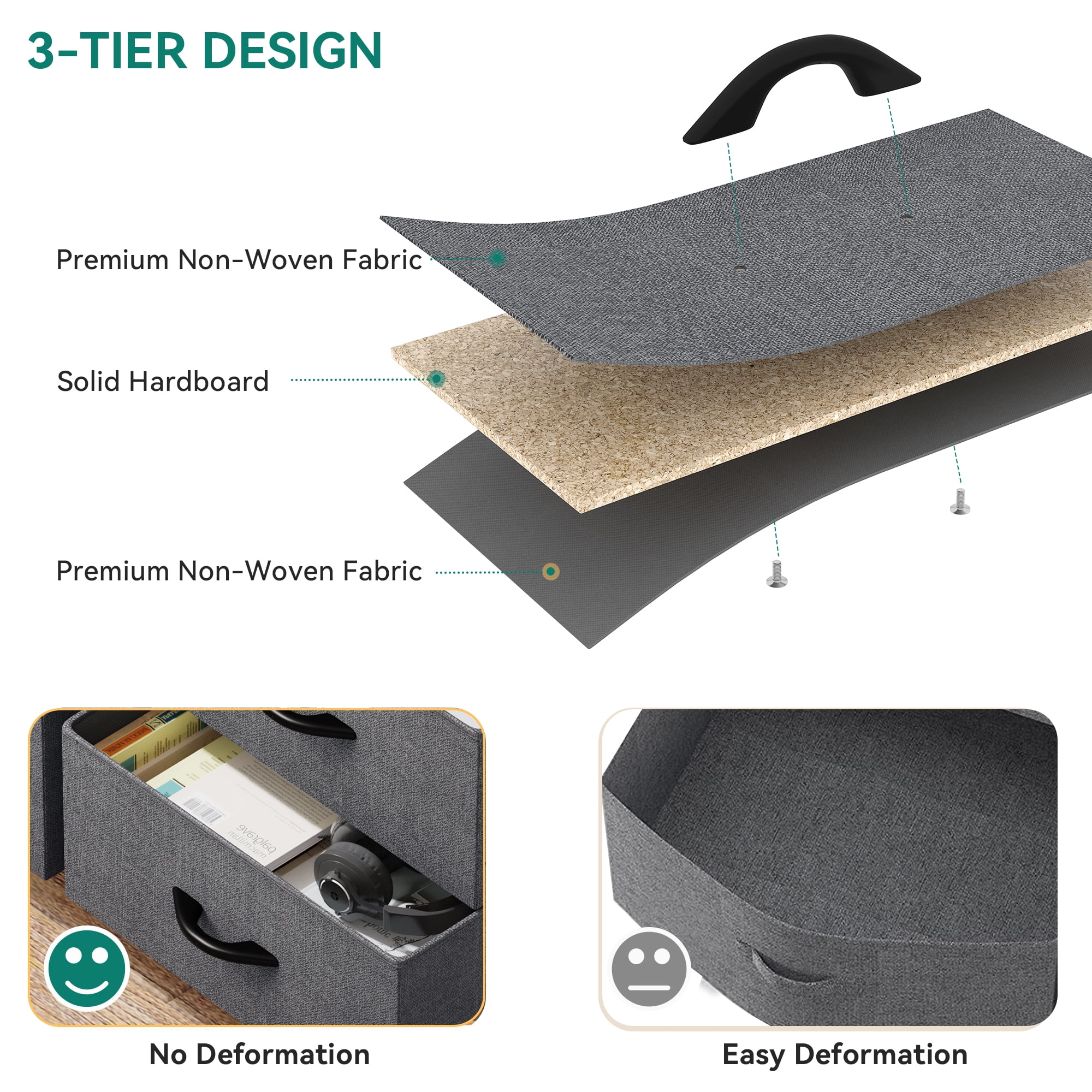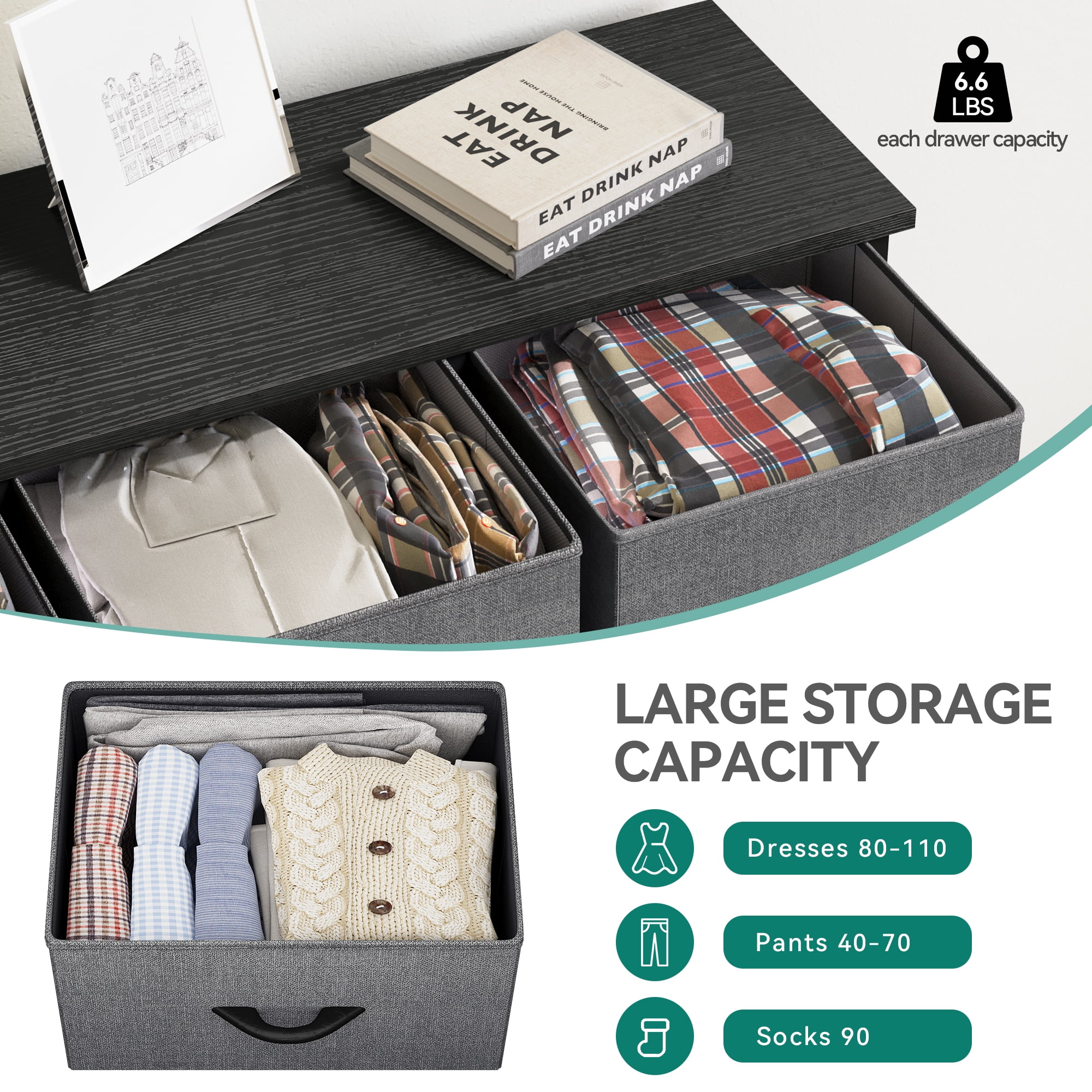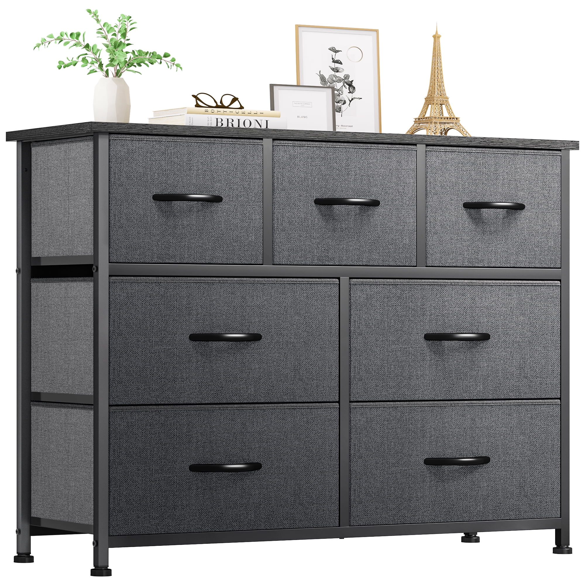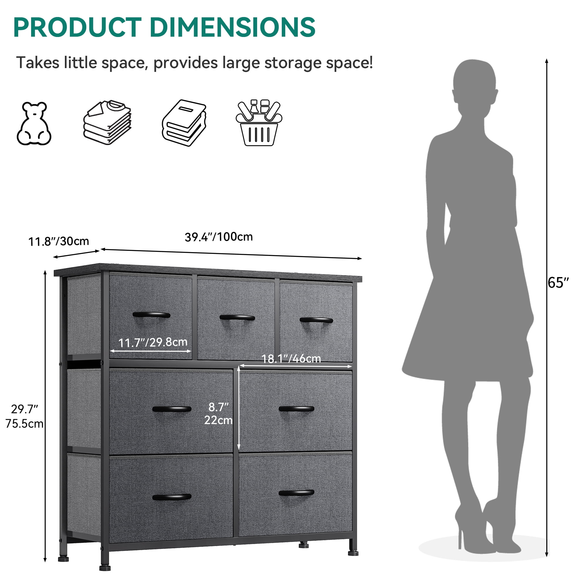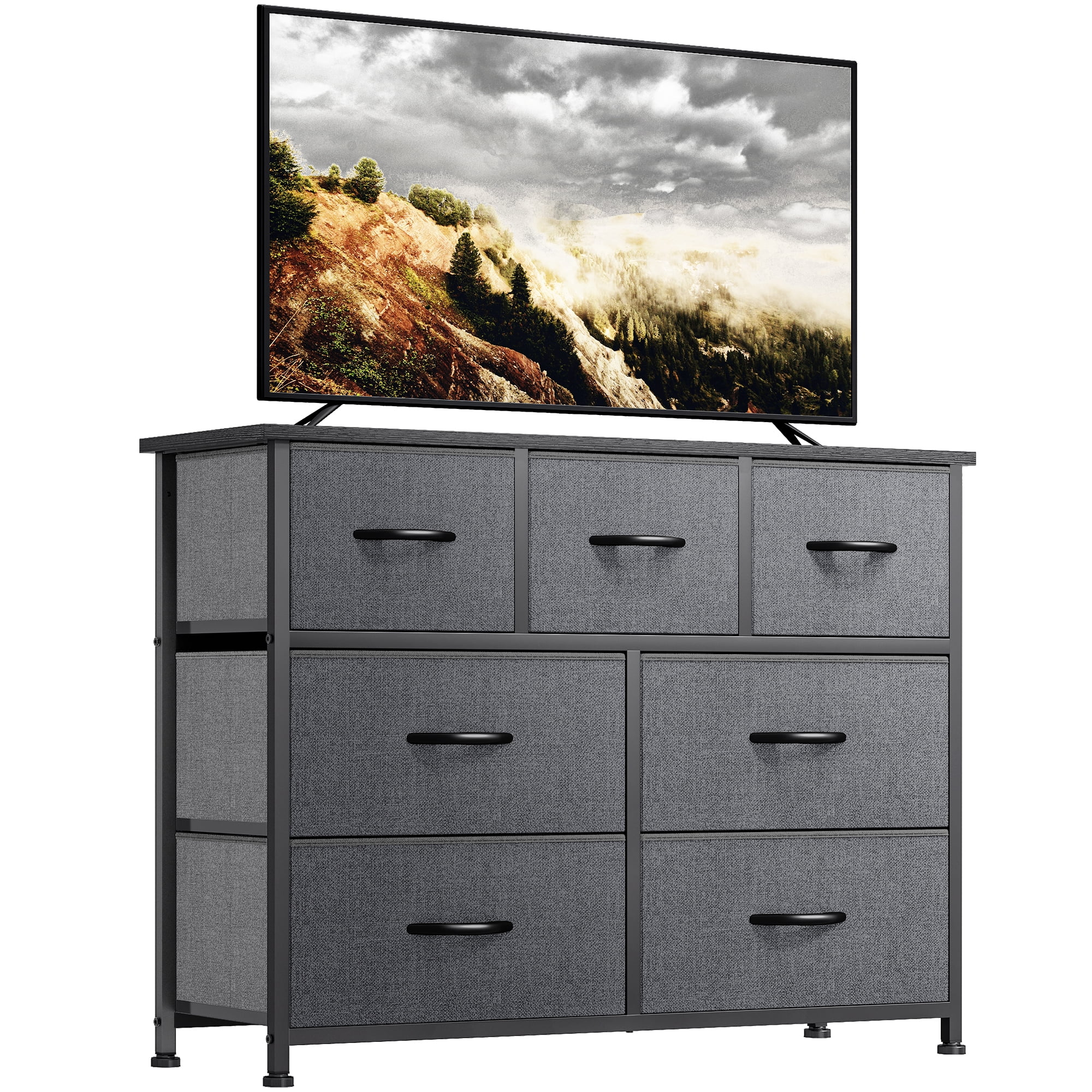 VERSATILE BEDROOM DRESSER- Dresser represents a clean expression that fits right into your bedroom, living room, hallway, entryway, closet, nursery, playrooms; Perfect as an entertainment center, console table or storage chest ALTERNATE TV STAND- Measuring 39.4″L x 11.8″W x 29.7″H, this chest of drawers doubles as a TV stand for televisions up to 45’’; Its large storage space and sizeable top surface allows you to freely store or display dresses, socks, pants, shirts, CDs, framed photos, lamps, and potted plants STURDY DRAWER ORGANIZER- Premium MDF wooden top and reliable metal frame lend immense support & extend shelf life; 4 adjustable plastic legs are for scratch protection and stability on uneven ground 7-DRAWER DRESSER- The TV stand for bedroom features 7 foldable deep drawers and easy-to-pull plastic handles; The non-woven synthetic fabric is easy to care SAFE & EASY USE- The storage drawer unit features drawers sized 18.1″L x 11″W x 8.7″H/11.7″L x 11″W x 8.7″H; It’s a breeze to assemble the drawers with instructions included; Recommended to anchor the fabric dresser to the wall for anti-tipping safety