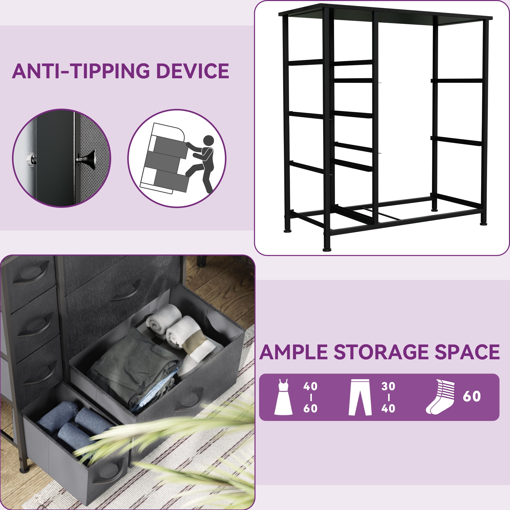 Specifications: Color: Black Gray Overall dimensions: Overall dimensions: 25″ L X 11.8″ W X 28.5″ H Drawer dimensions: 15.6″ L X 11.2″ W X 8.5″ H / 5.9″ L X 11.2″ W X 6.3″ H One drawer holds 8-15 rolled up T-shirts or 4-6 pairs of jeans Dresser chest is designed with 10 drawers to offer ample storage Great for bedroom, laundry room, living room, hallway, entryway, or closet Linen storage drawers can be folded when not in use Steel frame and MDF top offer reliable strength and stability Keep control of clutter & create a spacious, tidy home Fixing the fabric dresser to the wall is well recommended. Please follow the instructions