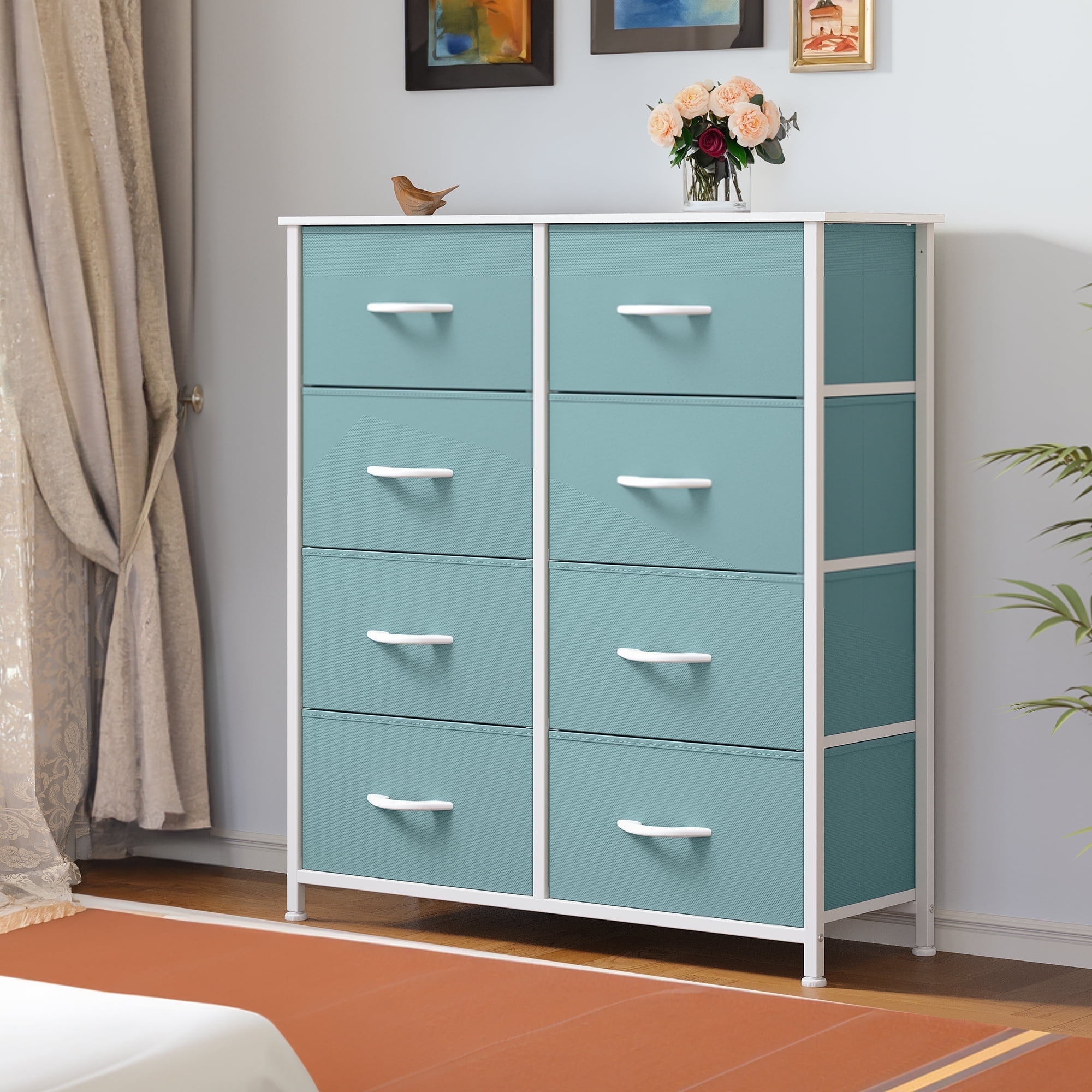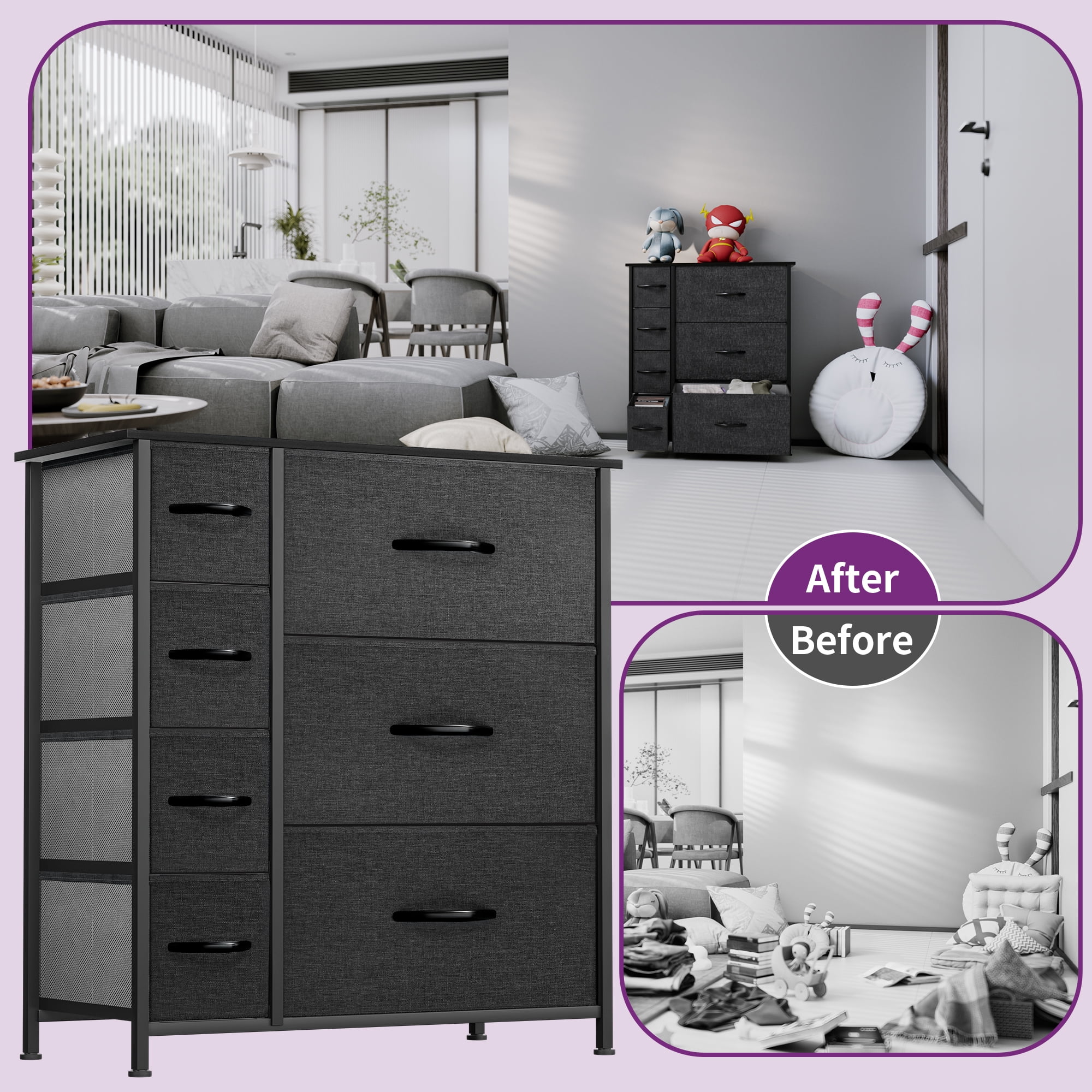 The 7-drawer fabric dresser combines efficient storage function with a modern simple appearance, which is super suitable for family use. The organizer separates and stores all of your wardrobe and linen essentials, and makes it easy to find and grab what you need right away. Seven removable drawers separate and organize clothing and accessories like hats, socks, shoes, scarves, blankets and more in one convenient place. They offer roomy space for storing out of season clothing, shoes, purses, scarves, bedding, linens and more. Besides, the MDF tabletop could be an eye-catching place to display the flower vase, family photo, and other adornments. The storage chest organizer is compact and lightweight, making it suitable for small spaces and transportation a breeze.
