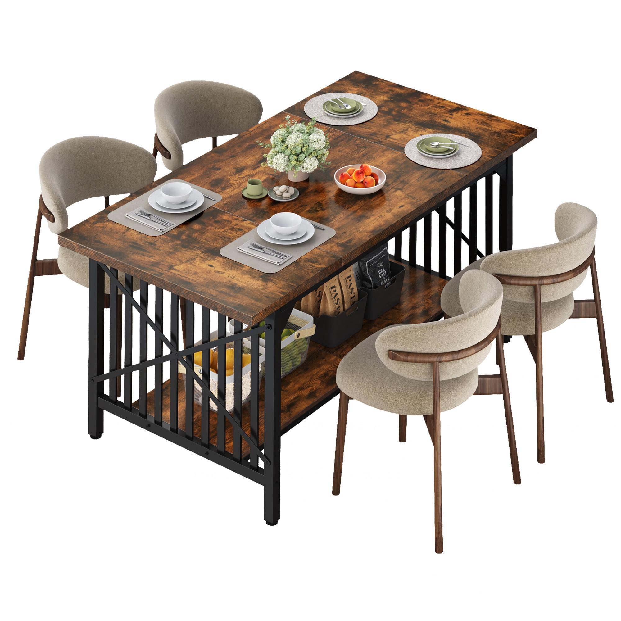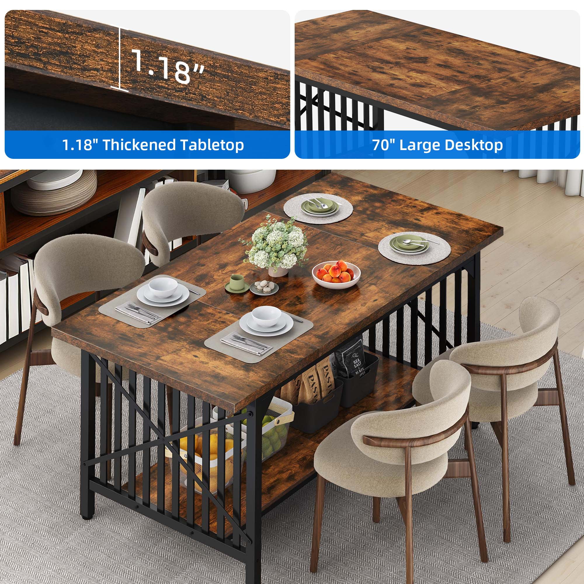 Dextrus 70″ Dining Table for 4-8 People, Industrial Rectangular Wood Kitchen Table with Storage for Dining Room,Kitchen, Home & Office – Rustic Brown