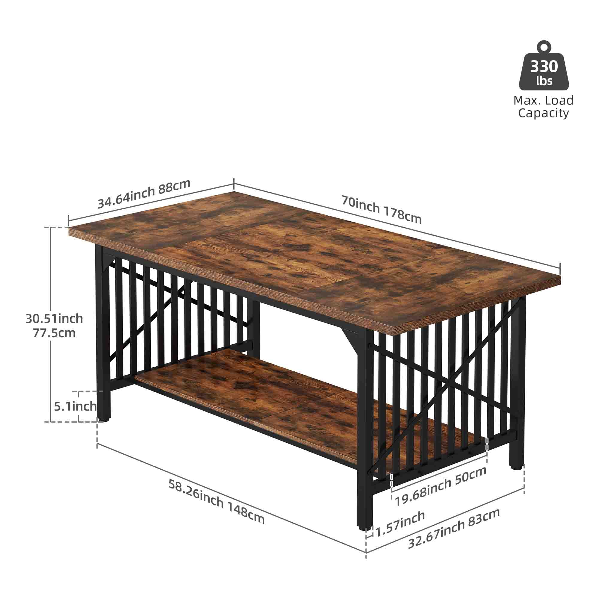 Introducing our Rustic Brown Dining Table, a versatile and spacious option for your kitchen or dining room. This 70″ industrial-style table can comfortably accommodate 4-8 people, making it perfect for gatherings and family meals. The rectangular wood design adds a touch of warmth and rustic charm to your space. The table also features built-in storage, allowing you to conveniently store tableware, placemats, or other dining essentials. Whether you’re hosting a dinner party or enjoying a casual meal with your family, this dining table provides ample space and functionality. Upgrade your dining area with our Industrial Dining Room Table and create a welcoming and stylish environment for your meals and conversations. Specifications: Color: Rustic Brown Material: Metal Tube + Engineered Wood Dining Table Dimension: 70″D x 36.64″W x 30.51″H Item Weightï¼ 84.43 lbs Max Load Capacity of the Table: 450 lbs Styleï¼Modern, Simple, All-match, Retro Shape: Rectangular Room Typeï¼ Kitchen, Bedroom, Home Office, Playroom, Dining Room,Living Room Package Included: 1 x Rectangular Dining Table 1 x Instruction Manual