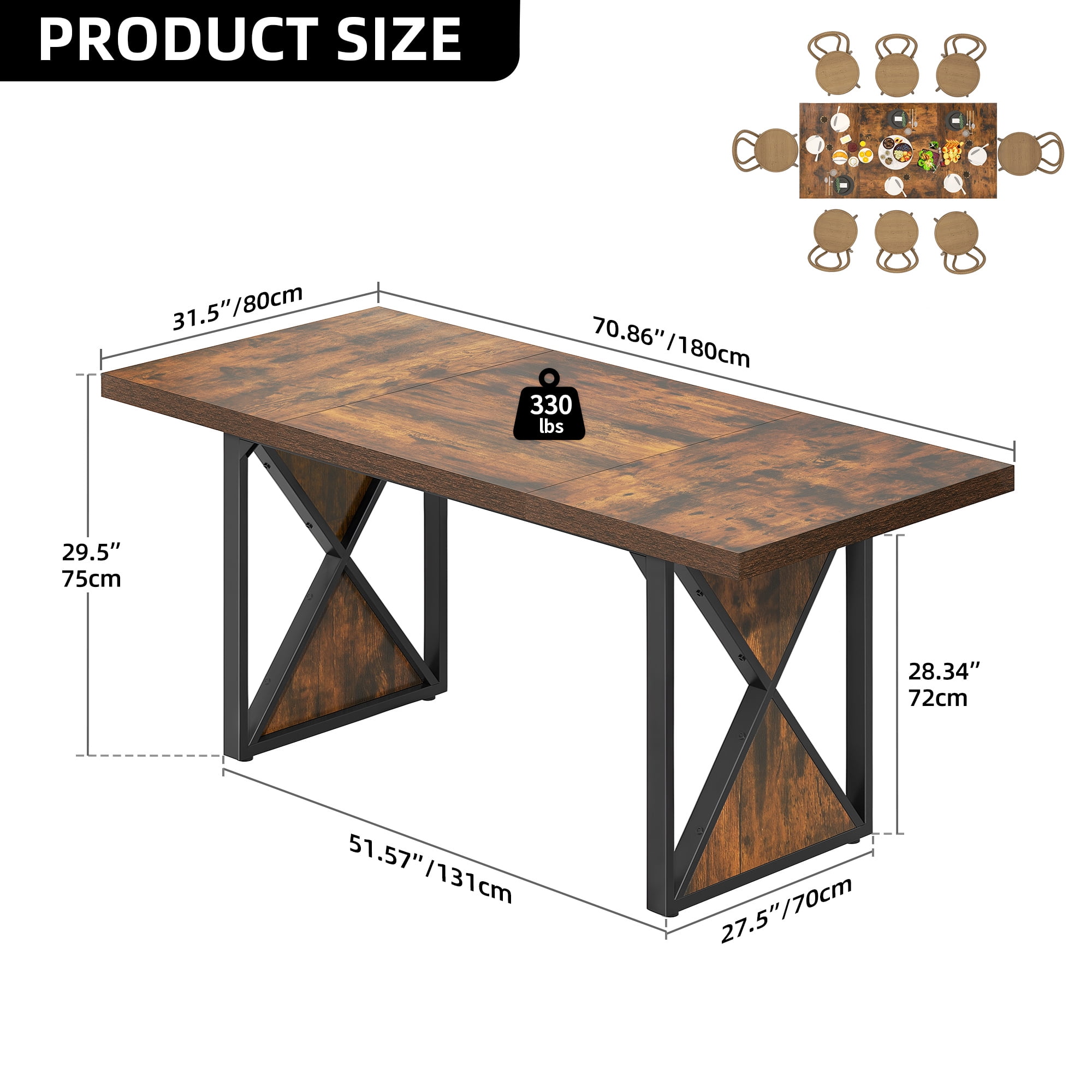 Generous Gathering Space: Indulge in the spacious and practical design of our elongated dining table, perfect for entertaining guests or accommodating a bustling family. Sized at 70.86”x31.5”x29.5”, this table offers abundant room for communal dining experiences, fostering a welcoming atmosphere for shared meals and engaging conversations. Enchanting Farmhouse Charm: Immerse yourself in the captivating allure of our kitchen dining table exuding a delightful farmhouse aesthetic. Intricate textures adorn this piece, enhancing the visual appeal of your home and elevating every dining occasion into a cozy and stylish affair. Robust Reliability: Constructed from thickened engineered wood and sturdy metal, our table epitomizes durability and dependability. Enhanced with X-shaped accents for a touch of vintage elegance and reinforced stability, it stands as a reliable centerpiece. Equipped with adjustable foot pads for steadfast support on any surface. Versatile Utility: Embrace the multifunctional essence of this kitchen table—a versatile companion suitable for hosting grand gatherings or professional meetings alike. From intimate dining experiences to productive brainstorming sessions, this table effortlessly adapts to every occasion, ensuring seamless transitions between different settings. Effortless Assembly: Simplify the assembly process with our user-friendly package, featuring clear and detailed instructions alongside numbered parts for a straightforward setup. Enjoy a hassle-free experience from start to finish, guaranteeing a smooth and efficient construction of your new dining centerpiece.