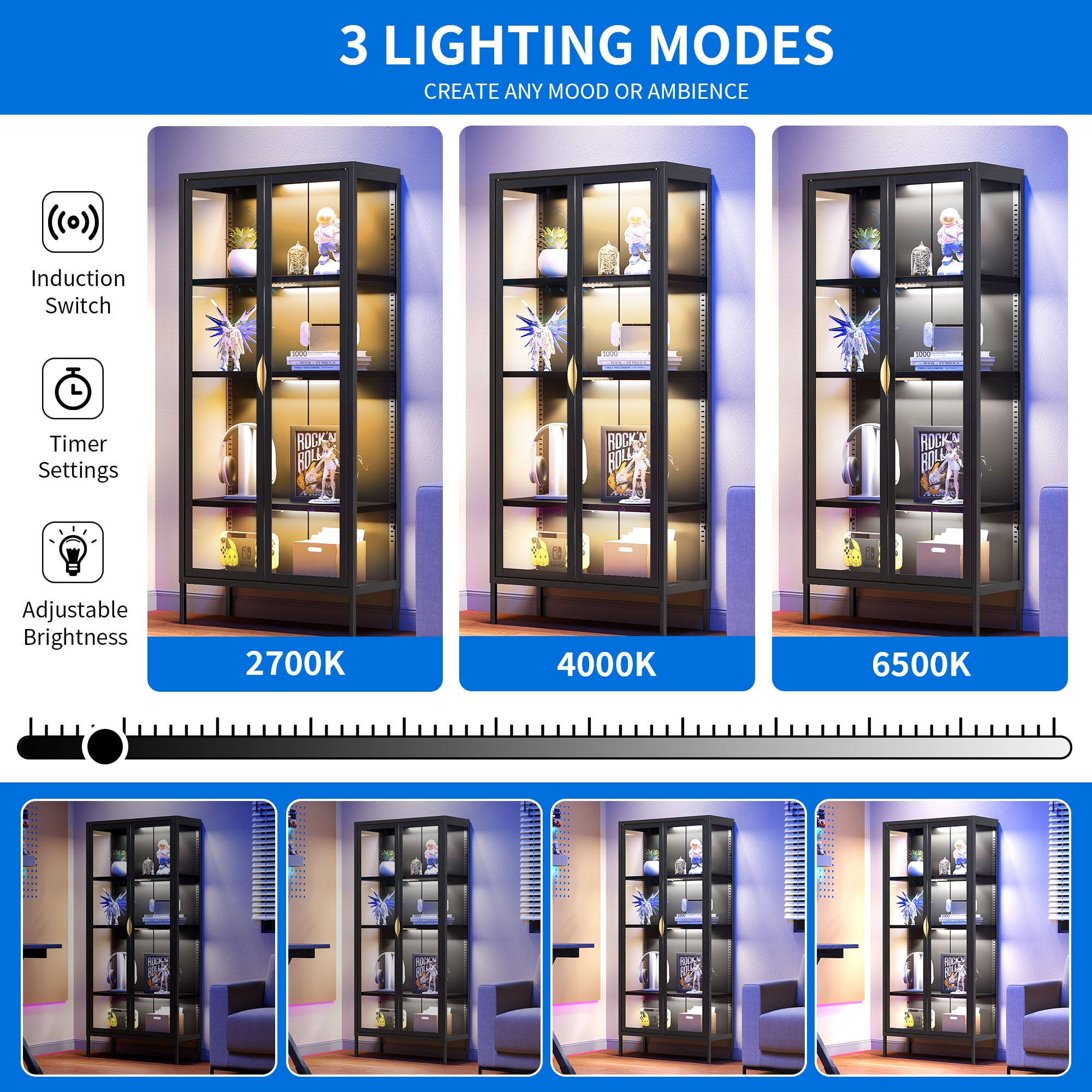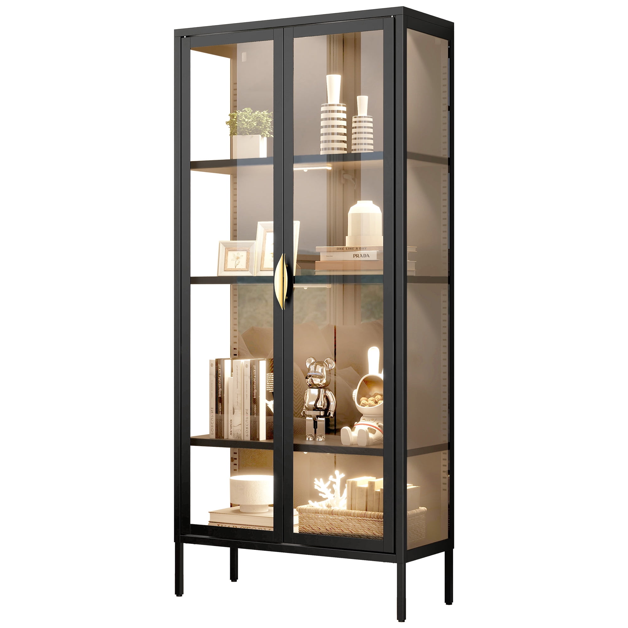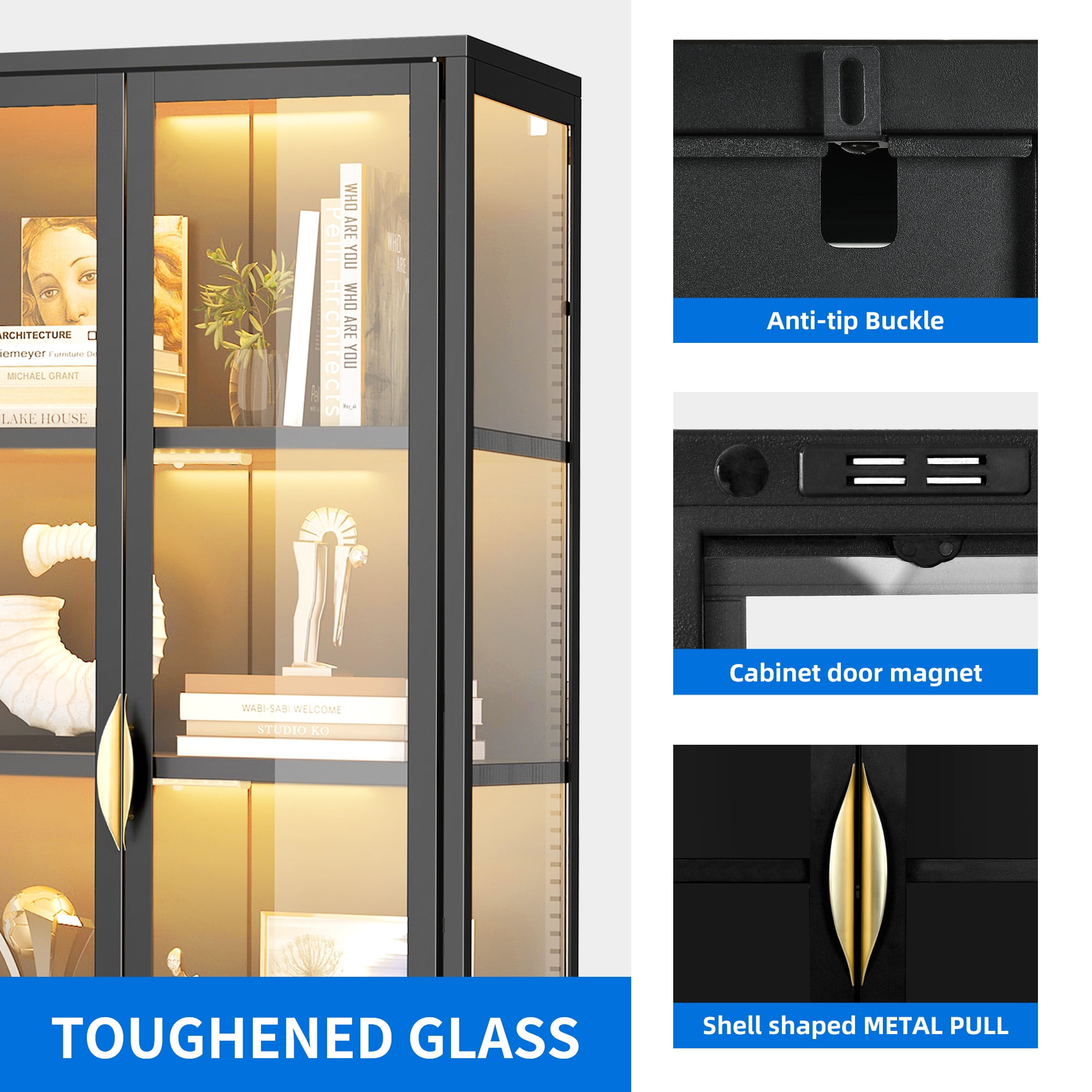 Unyielding Reliability: Crafted from robust steel and fortified with shatter-resistant tempered glass, this display case cabinet guarantees unwavering durability. Enhanced with a secure metal anti-tip buckle, it confidently stands guard, safeguarding your precious possessions against accidental toppling. Captivating Showcase: Embark on a journey of marvel within our storage cabinets! Flaunting three sides adorned with crystal-clear tempered glass panels, they transcend mere storage units, becoming enchanting portals to exhibit your treasured artifacts. Immerse yourself in the magnificence of your cherished collections. Versatile Shelf Adjustability: Escape the confines of traditional storage solutions! Our expansive display cabinet features adjustable shelves, effortlessly conforming to accommodate items of diverse sizes and shapes. From delicate trinkets to majestic heirlooms, there’s ample space for every precious piece. Illuminate Your Treasures: Bid farewell to fumbling in dimness! Embrace the convenience of automatic induction lights gracing our display cabinet, guiding your path to treasures with ease. Designed with magnetic installation for swift repositioning, these lights offer adjustable brightness levels and modes, allowing you to curate the perfect ambiance. Effortless Assembly: Say goodbye to complex setups and embrace simplicity! Assembling this capacious storage cabinet is a breeze, thanks to clear instructions and labeled components. Even novices in the realm of DIY can effortlessly master the assembly process, opening the doors to organizational bliss.