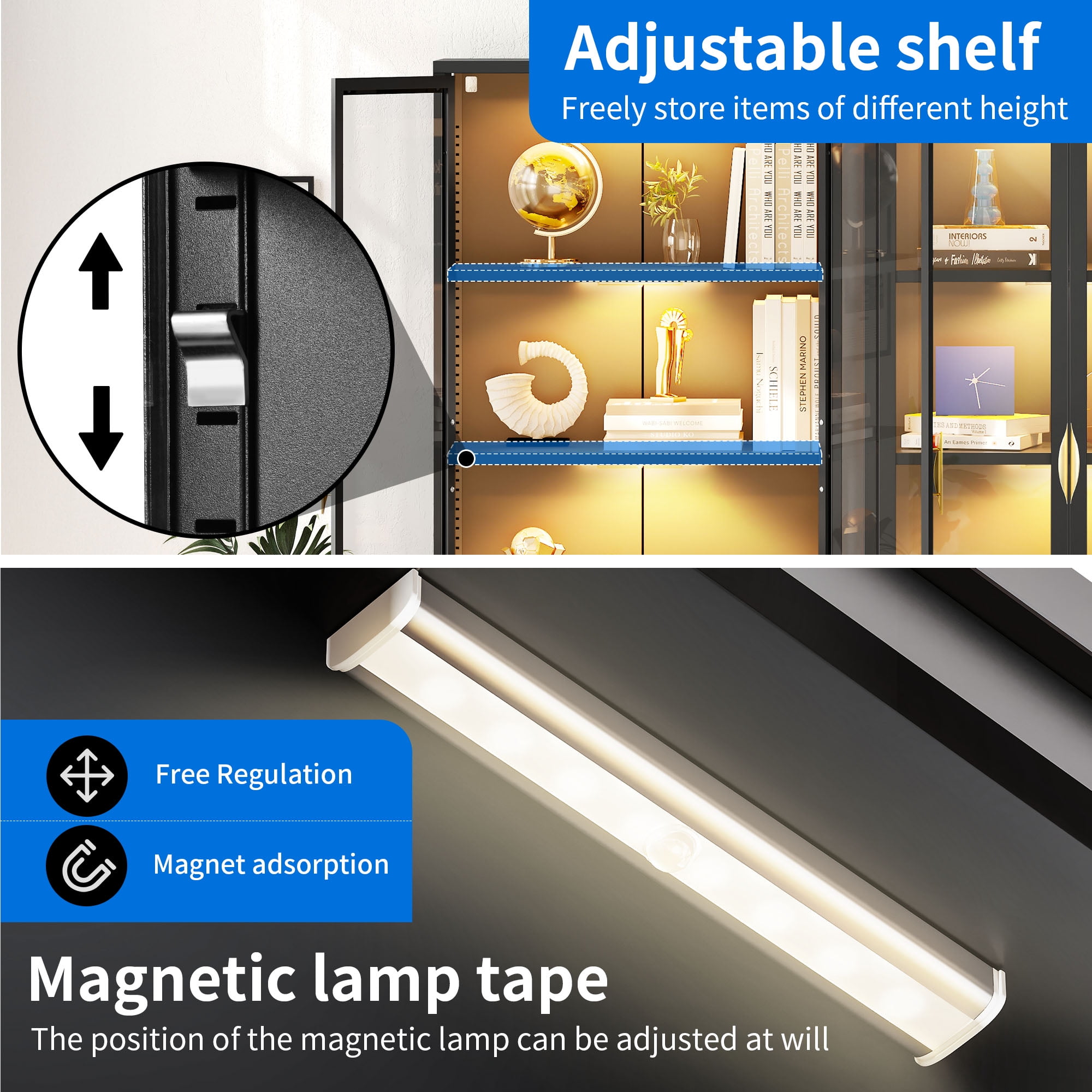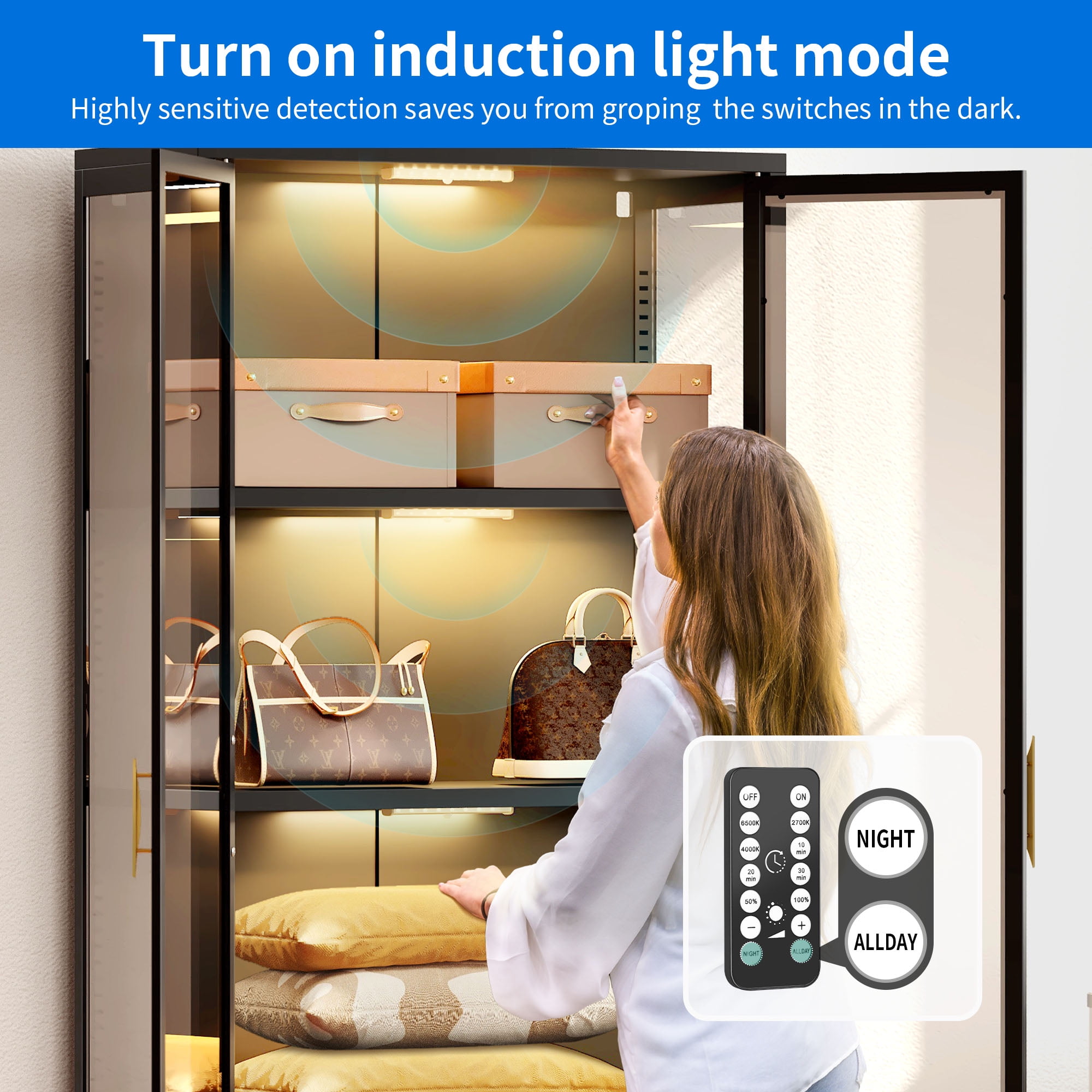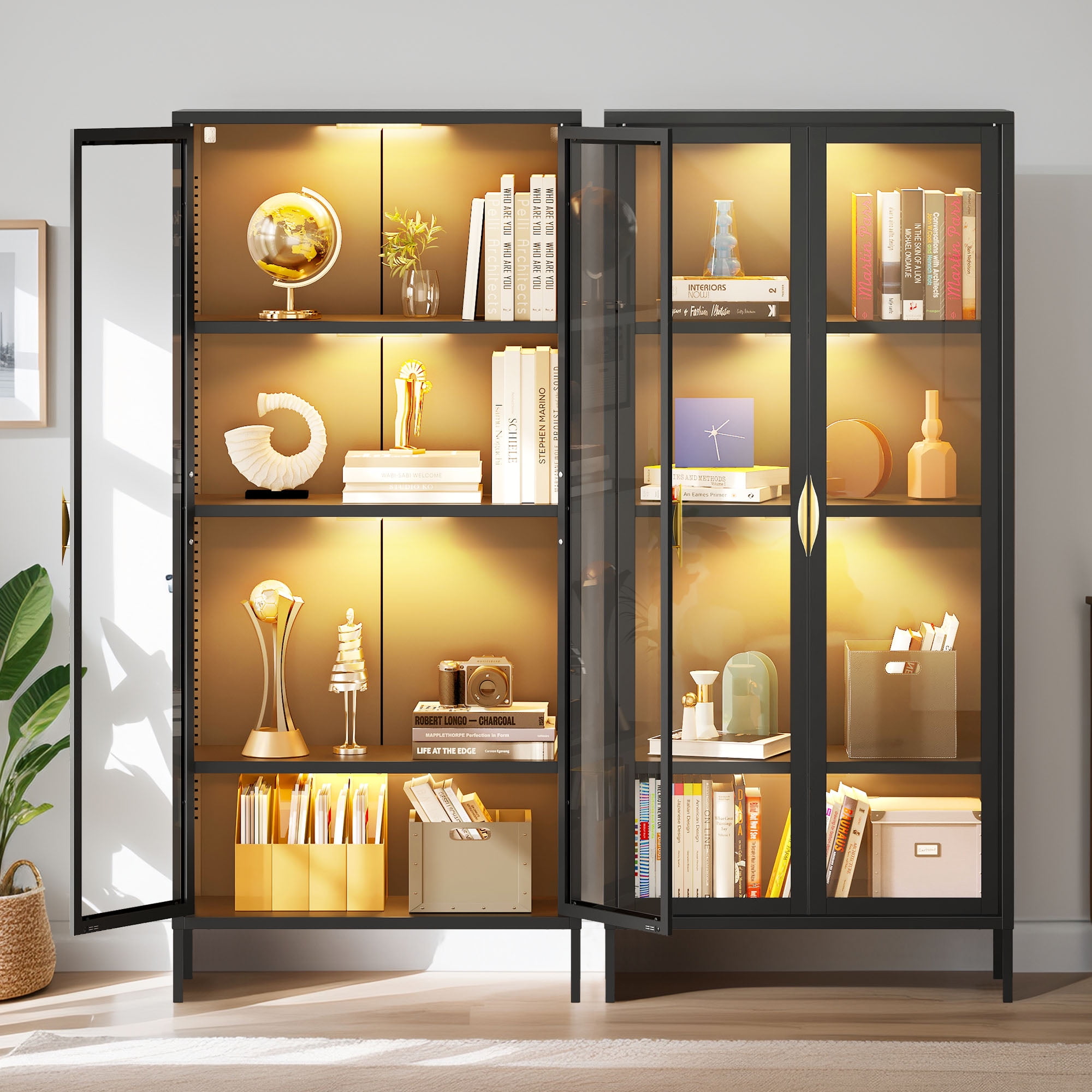 Unyielding Reliability: Crafted from robust steel and fortified with shatter-resistant tempered glass, this display case cabinet guarantees unwavering durability. Enhanced with a secure metal anti-tip buckle, it confidently stands guard, safeguarding your precious possessions against accidental toppling. Captivating Showcase: Embark on a journey of marvel within our storage cabinets! Flaunting three sides adorned with crystal-clear tempered glass panels, they transcend mere storage units, becoming enchanting portals to exhibit your treasured artifacts. Immerse yourself in the magnificence of your cherished collections. Versatile Shelf Adjustability: Escape the confines of traditional storage solutions! Our expansive display cabinet features adjustable shelves, effortlessly conforming to accommodate items of diverse sizes and shapes. From delicate trinkets to majestic heirlooms, there’s ample space for every precious piece. Illuminate Your Treasures: Bid farewell to fumbling in dimness! Embrace the convenience of automatic induction lights gracing our display cabinet, guiding your path to treasures with ease. Designed with magnetic installation for swift repositioning, these lights offer adjustable brightness levels and modes, allowing you to curate the perfect ambiance. Effortless Assembly: Say goodbye to complex setups and embrace simplicity! Assembling this capacious storage cabinet is a breeze, thanks to clear instructions and labeled components. Even novices in the realm of DIY can effortlessly master the assembly process, opening the doors to organizational bliss.