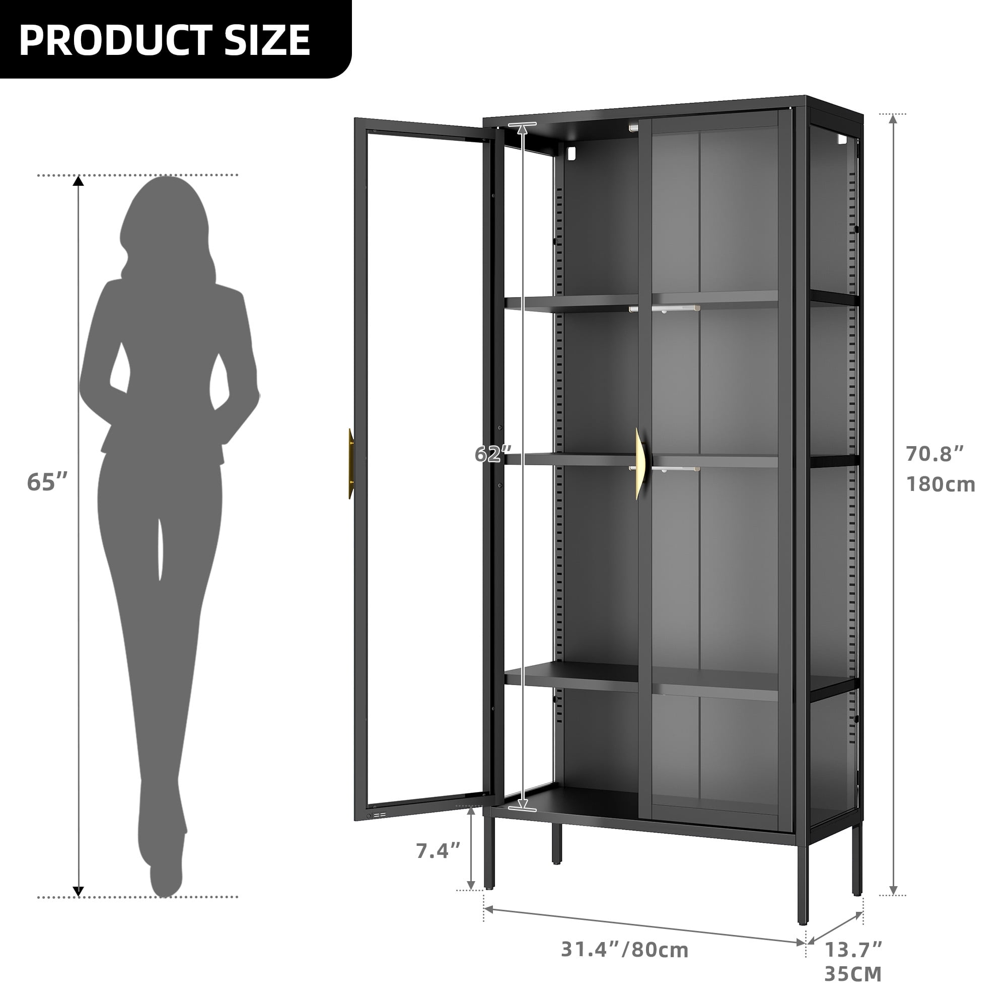 A premium cabinet destined for your living room, office, game room, or bedroom, primed to elegantly showcase and organize your literary treasures, collectibles, multimedia, CDs/DVDs, games, and more. This delightful curio cabinet boasts four adjustable glass shelves, ensuring effortless and practical organization—a must-have for any discerning homeowner. Standing tall at a graceful 72 inches, its ideal stature is accentuated by anti-tipping straps, prioritizing safety without compromising on aesthetics. Embrace the spacious elegance of your home with this glass display cabinet, instantly transforming any room into a haven of order and beauty. Tailor the tempered glass shelves to your liking, affording you the freedom to curate displays that reflect your personal style. Our Curio Cabinet is a superior choice, poised to grace your home with sophistication and functionality.