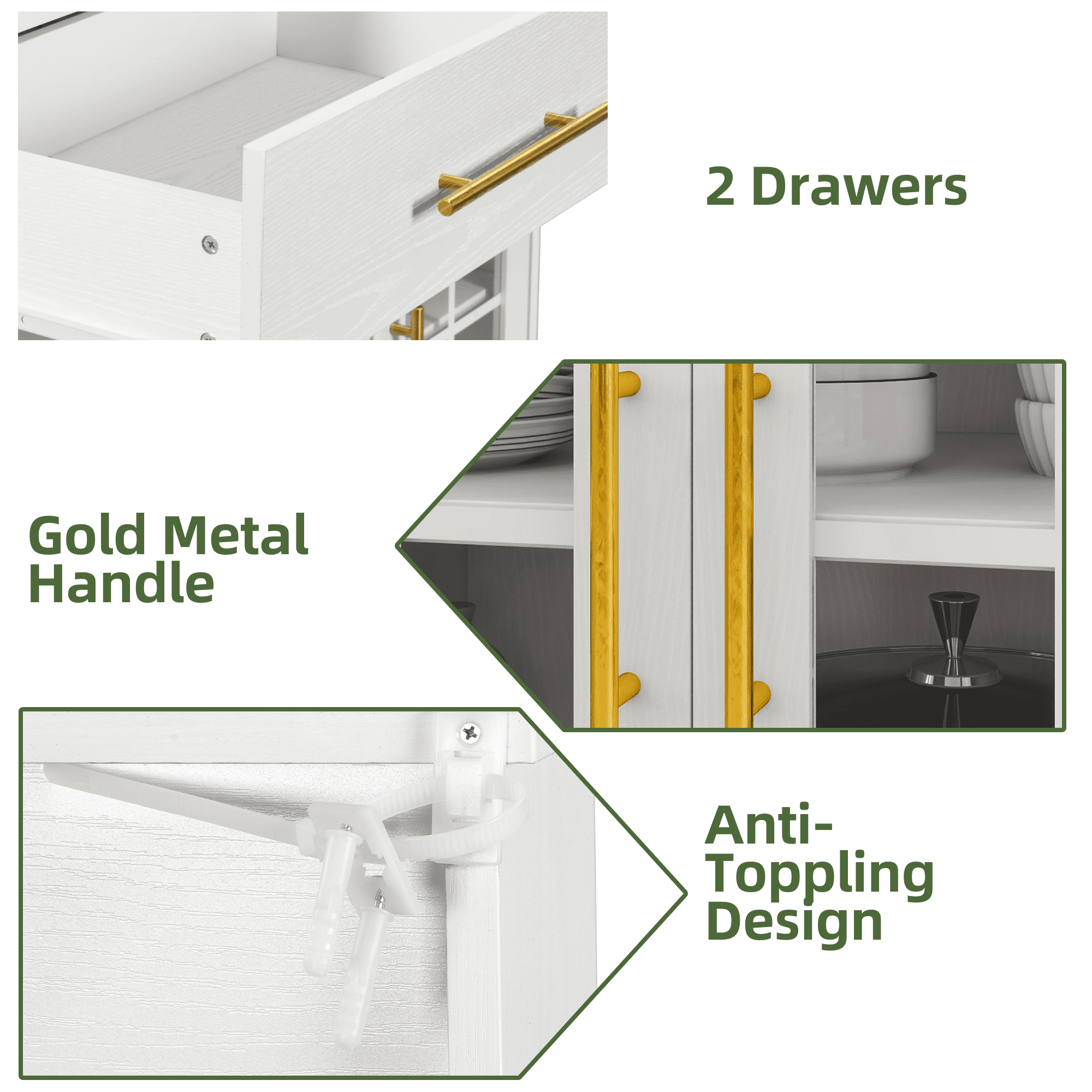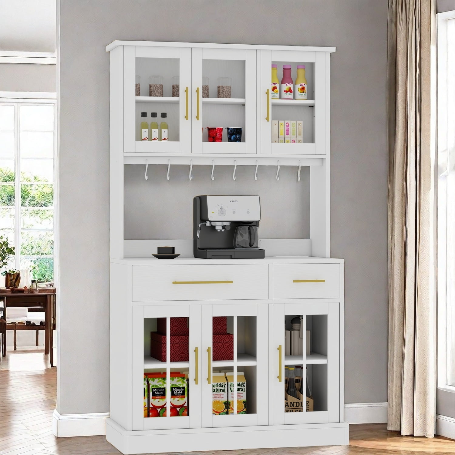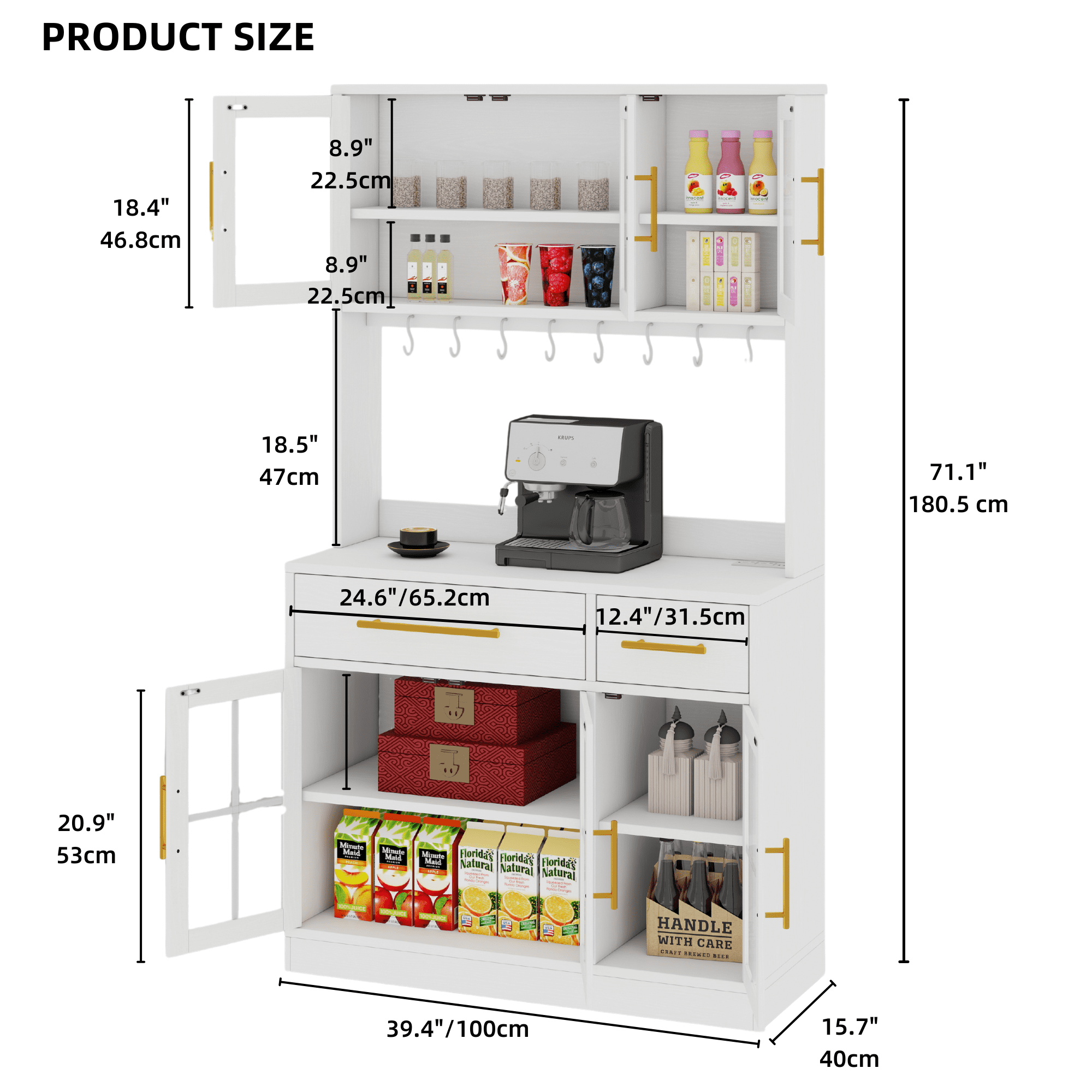 Versatile Storage Solution: This multipurpose pantry cabinet can be used in various settings, such as a dining room, kitchen, living room, or home bar. It offers flexible storage for tools, toys, glasses, bottles, coffee makers, and more, meeting your diverse needs. Convenient Power Outlets: With 2 USB ports and Two 3-hole sockets, this Kitchen Pantry Cupboard Cabinet allows you to easily charge your devices while using appliances like toasters, microwaves, or coffee makers. Stay connected and powered up effortlessly. Ample Storage Capacity: This Cupboard Storage Cabinet provides generous storage space. It features enclosed cupboards for small bottles and jars, a spacious open countertop for appliances, drawers for utensils and napkins, and large cupboards for bigger items. The additional hooks offer a practical solution for hanging cups and lightweight items. Enhanced Safety and Stability: Our Storage Cabinet prioritizes safety with its unique Anti-Dumping design on the top and reinforced bottom. The fully enclosed edge design enhances stability, while the heightened bottom effectively prevents moisture. Enjoy peace of mind while using this reliable storage solution. Easy Assembly and Maintenance: Clear instructions and numbered parts make assembly a breeze. The Cabinet’s overall size is 39.3”W*15.7”D* 70.8”H, and it can be easily cleaned with a damp cloth.