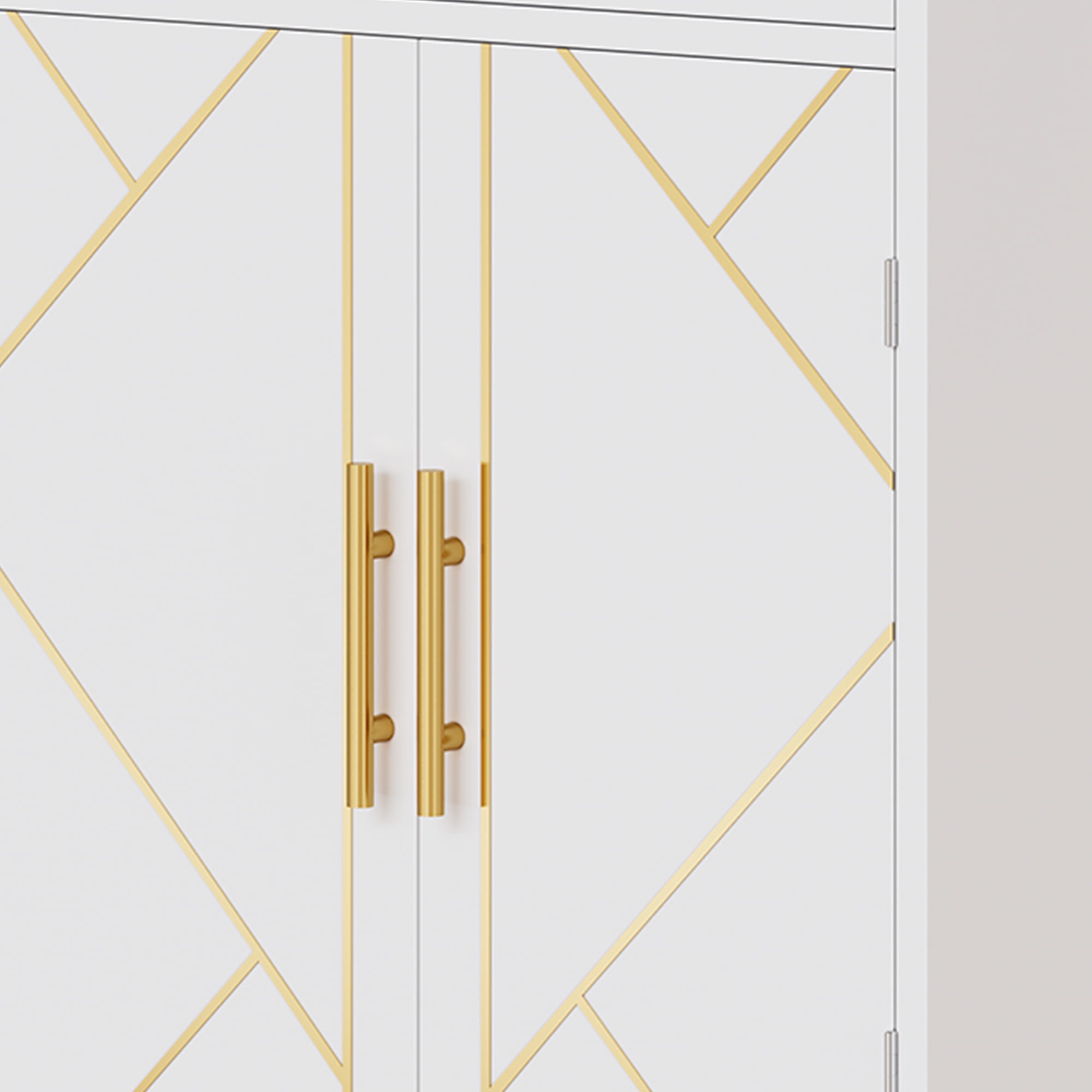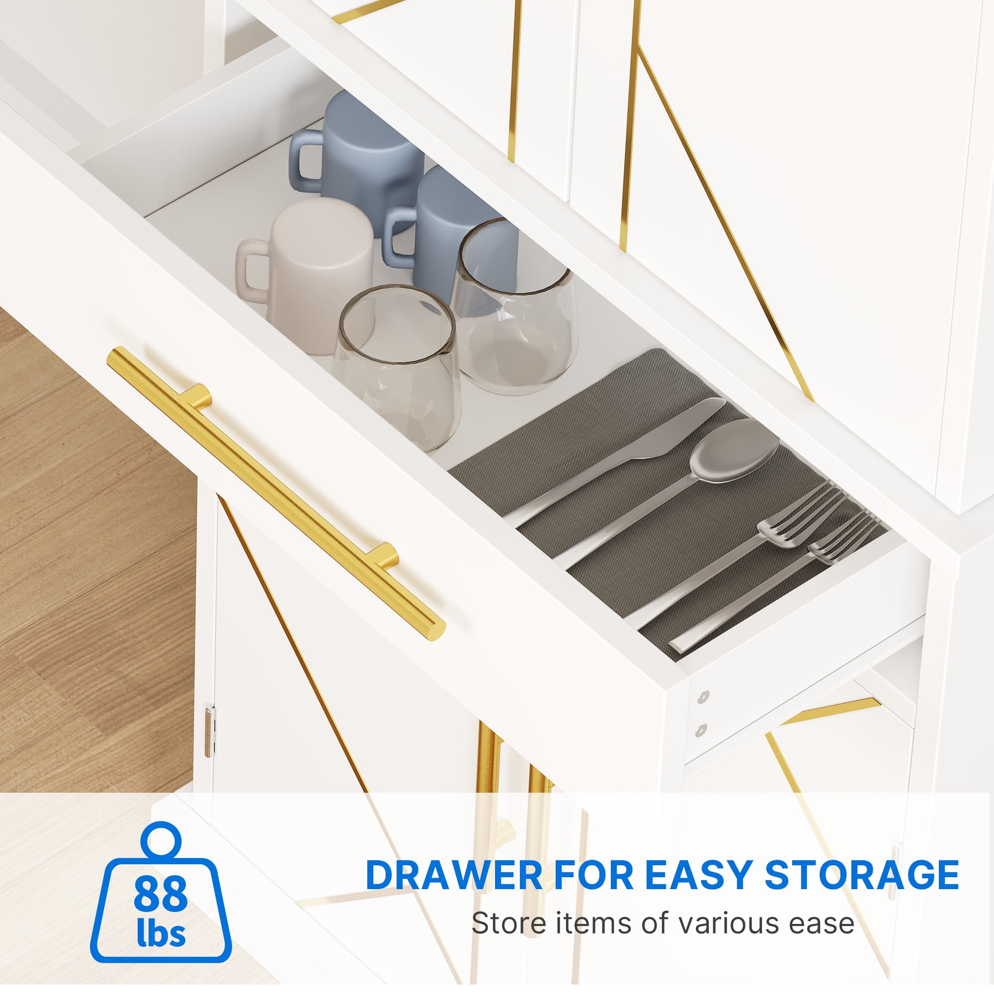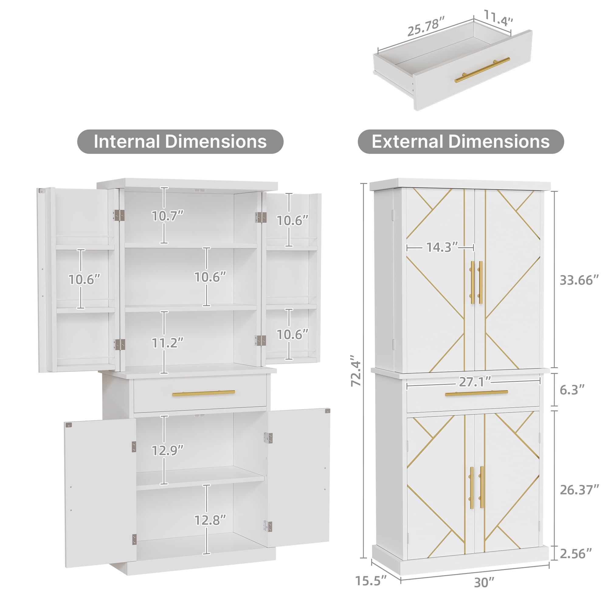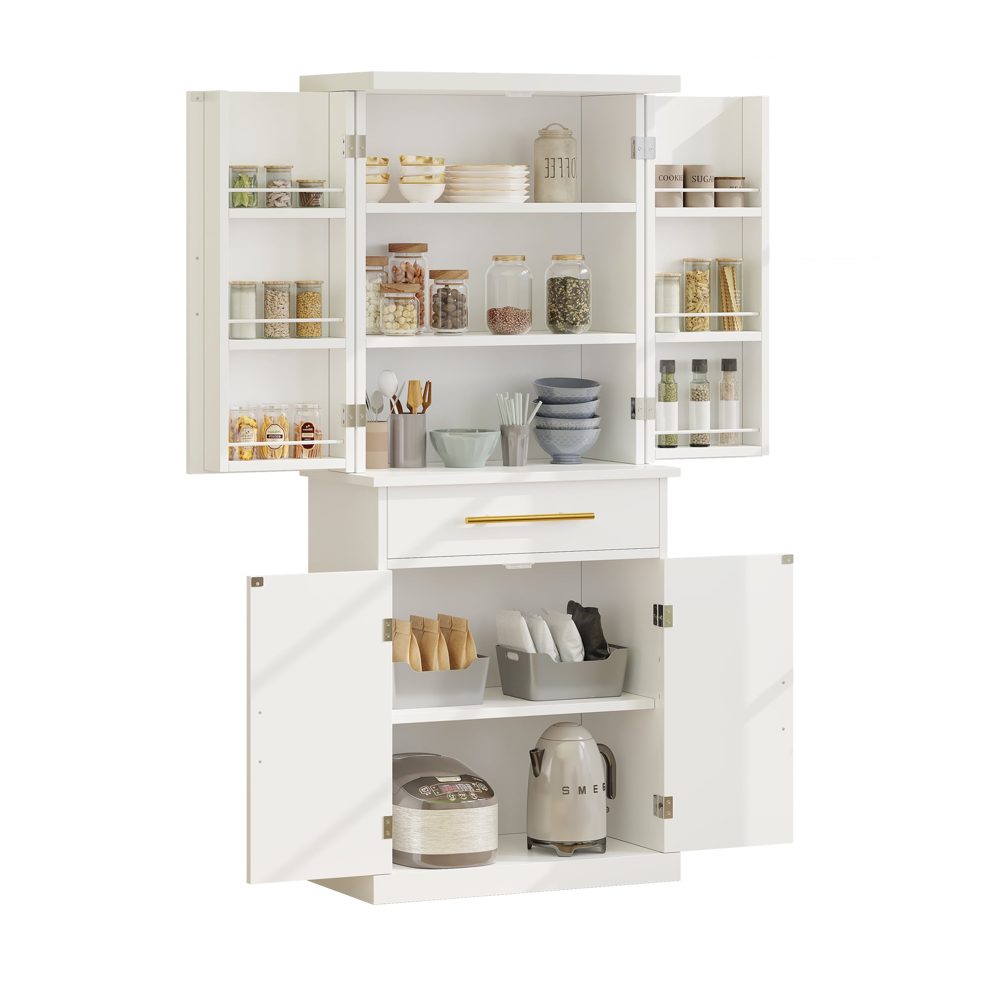 [Premium Material]: Crafted from high-quality medium-density particle board and coated with waterproof paint, this floor cabinet withstands moisture in damp environments while ensuring long-lasting durability and dust-free storage. [Spacious Storage Cabinet]: This tall kitchen storage cabinet offers you additional storage capacity. The base consists of a double-door cabinet with 6 storage compartments behind the side doors and 3 shelves, 1 large drawer providing both concealed space and better organization for your essentials. [User-Friendly Design]: The storage compartments on the sides are equipped with guardrails to prevent items from falling off, and the spacious shelves in the middle allow you to arrange kitchen essentials of different sizes, such as utensils, tools, spice jars, and snacks. Magnetic door catches offer cushioned closing and the selected metal handles ensure easy opening and closing of the doors. [Versatile Storage Cabinet]: This storage cabinet features intricately carved facades and a modern elegant appearance, making it a seamless addition to any furniture style while providing extra storage space to any room. It can serve as a kitchen pantry, bedroom wardrobe, or laundry storage cabinet.