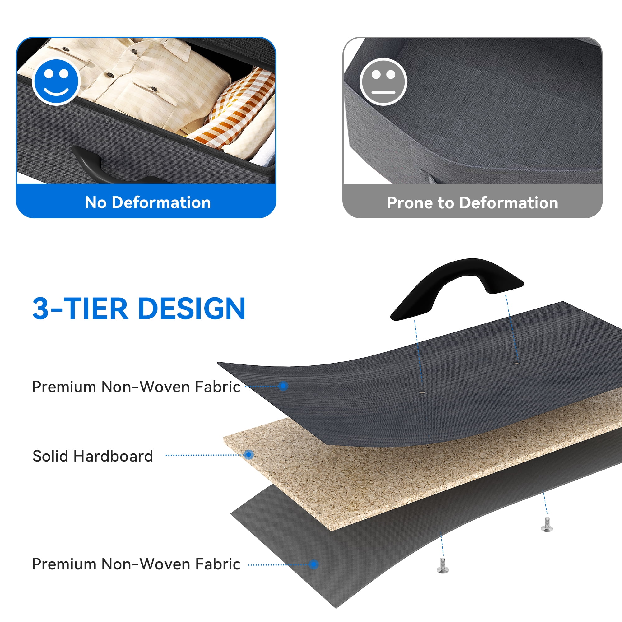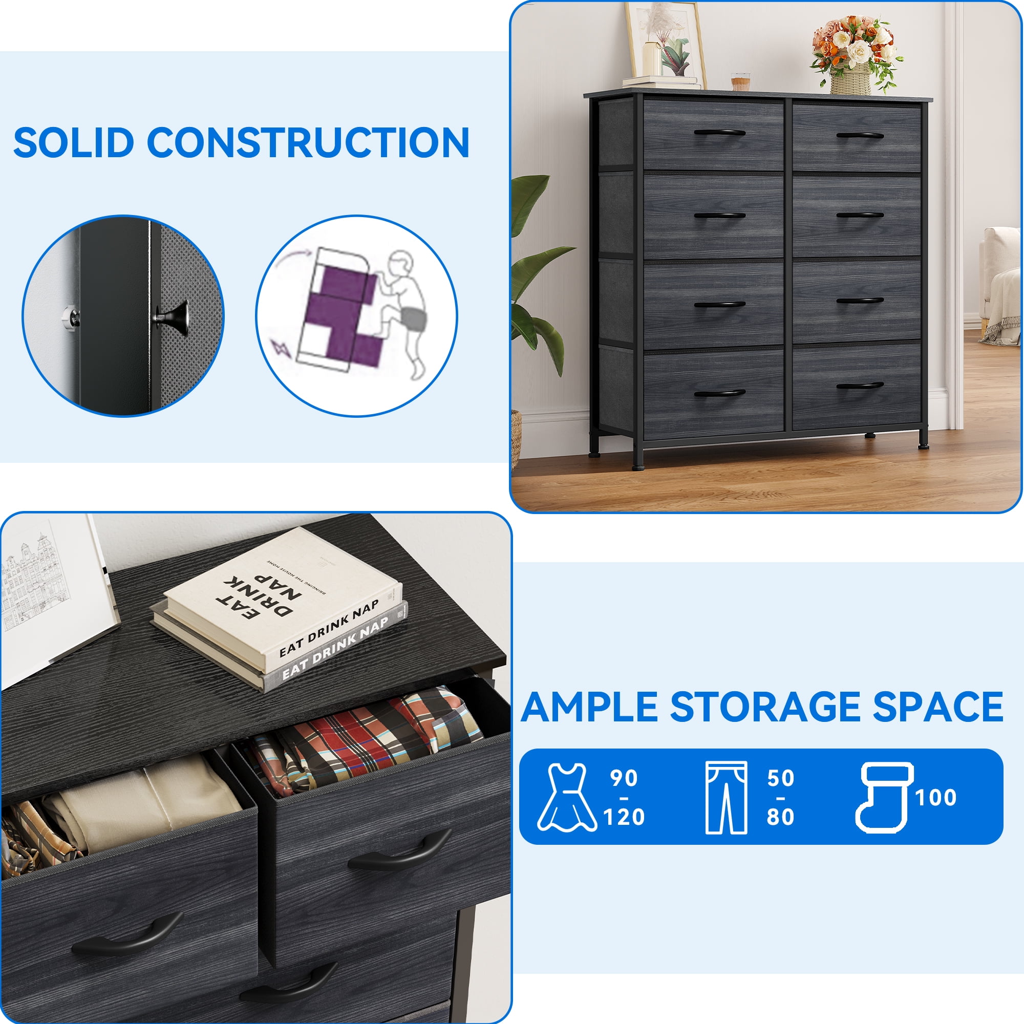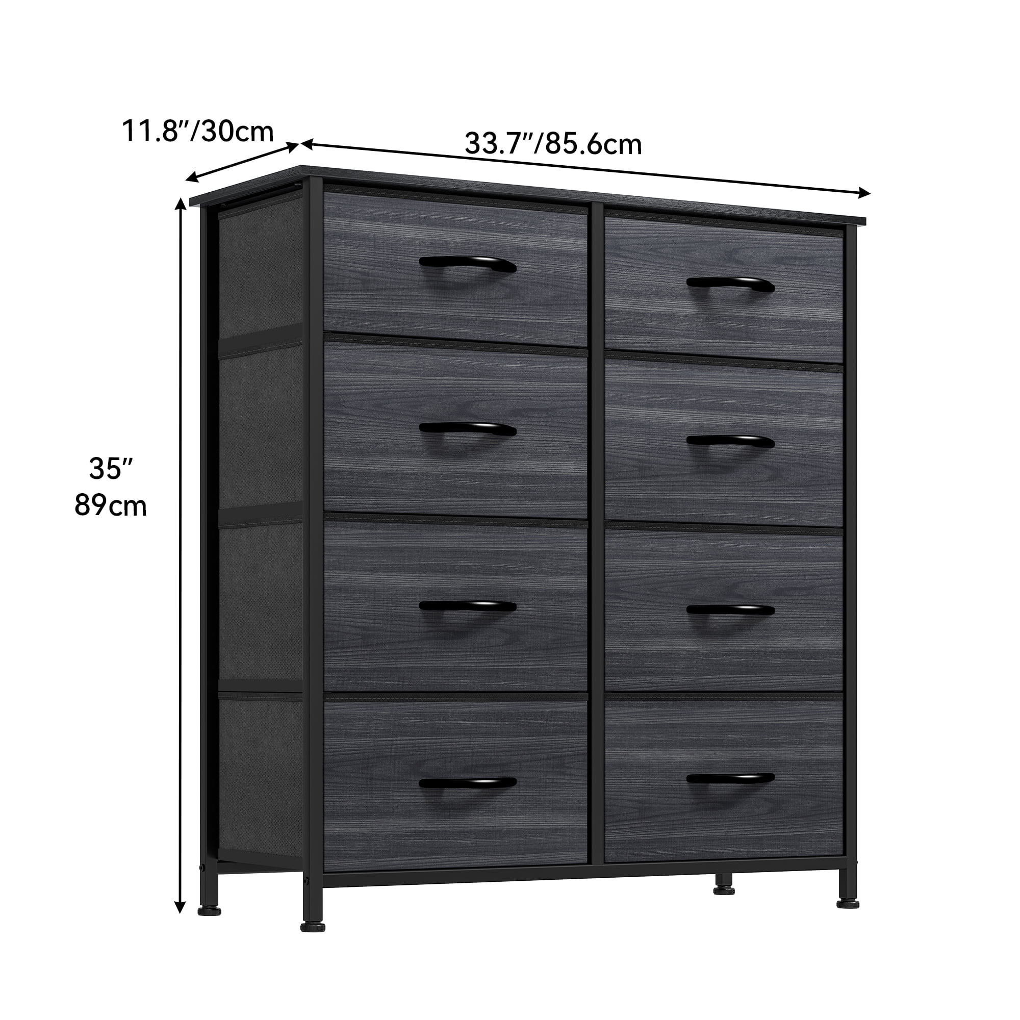 Versatile Storage Solution – The Dextrus 8-Drawer Fabric Dresser is designed for bedrooms, living rooms, hallways, nurseries, closets, and entryways, offering both functionality and style to any space. Spacious & Functional – Features 8 deep drawers for organizing clothes, socks, toys, and household essentials. The wooden top provides extra space for lamps, framed photos, and décor. Durable & Stable – Crafted with a strong metal frame and a premium MDF wooden top, ensuring long-lasting use. 4 adjustable legs protect floors and enhance stability on uneven surfaces. Easy-to-Use Drawers – The removable and foldable fabric drawers feature smooth pull handles and are made of high-quality, breathable non-woven fabric for easy maintenance. Safe & Easy Assembly – Measures 33.7″ L x 11.7″ W x 35″ H with drawer sizes of 15.6″ L x 11″ W x 5.5″ H / 15.6″ L x 11″ W x 8.7″ H. Includes step-by-step instructions for quick assembly. Wall anchor kit recommended for safety. Perfect for All Ages: Designed for adults, teens, and children, this storage dresser is great for great addition for your small apartments.