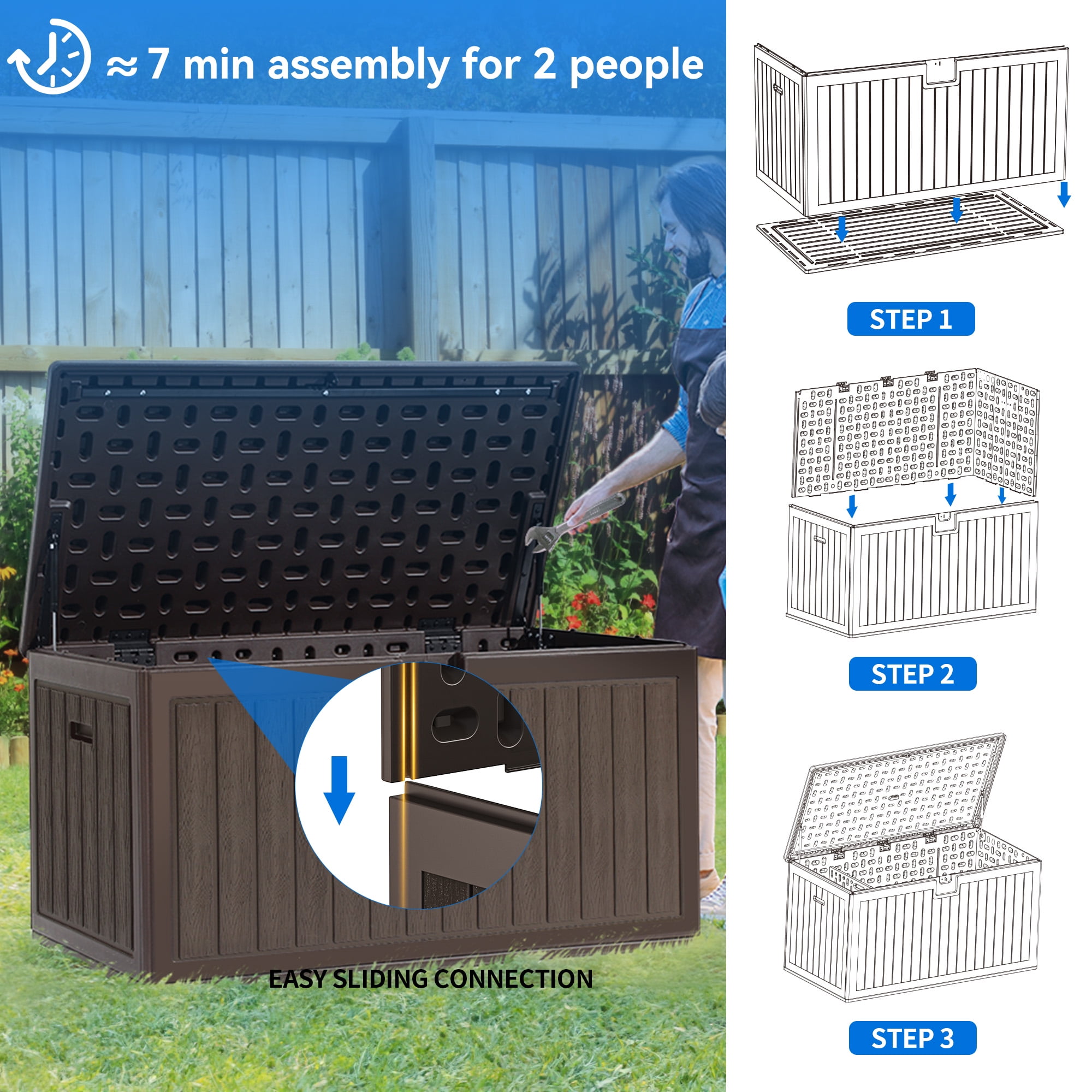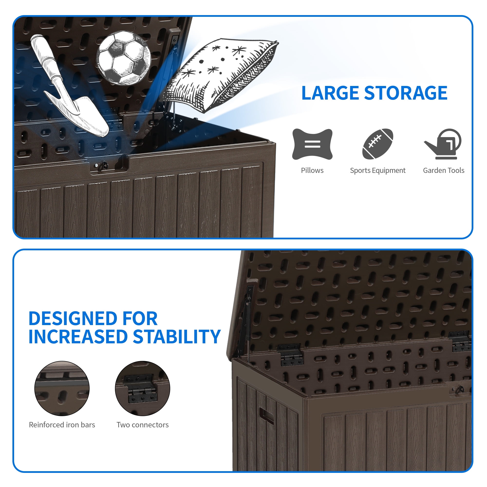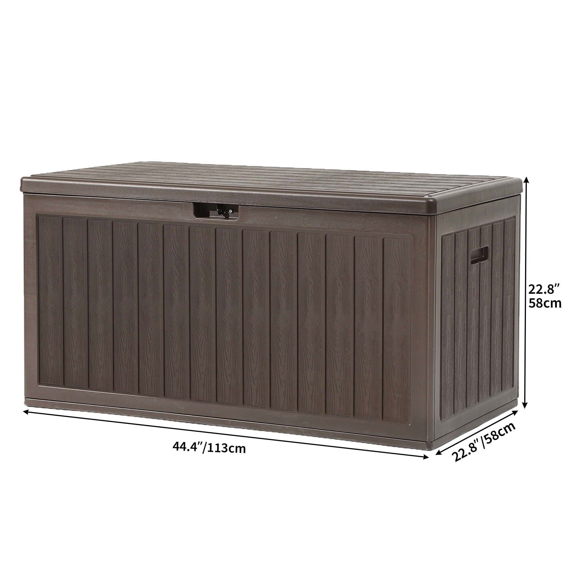 LARGE DECK STORAGE BOX- 86 gallon capacity features outer dimensions of 44.49”L x 22.83”W x 22.83”H; Distinct wooden texture provides more than just storage to your indoor and outdoor environments. DOUBLE-WALL CONSTRUCTION- Unique dual wall structure raises sturdiness & durability to the next level; All-weather guard resin pairs with wooden texture to imbue a natural touch for lasting outdoor use. MULTIPURPOSE GARDEN STORAGE- Doubles as an extra table or bench to accommodate two adults of up to 800lbs., this deck box blends into any yard or patio while storing patio furniture, outdoor cushions, gardening tools, pool supplies, etc. ATTENTION TO DETAIL- Hydraulic hinge provides smooth and anti-slam closing for increased safety; Built-in handles facilitate easy relocation while lockable lid allows for secure storage. HASSLE-FREE ASSEMBLY- Getting in trouble with laborious snap-on installation? Our improved slide connections remove this hassle; Assembly only requires two people to align and slide 4 panels into each other; You’ll be good to go within only 7 mins. EASY SLIDING CONNECTION,â 7 min assembly for 2 people|EXTRA MIGHTY CONSTRUCTION,-,selshistele,Gİlsıssisis,-,A,A,-,A,T,A,T,DOUBLE-WALL STRUCTURE,â,4,EGHERO,â¼,-,1,T,STO,ADVANCED BLOW MOLDING|SIDE HANDLES,Lightweight yet portable, easily mobile,with just yourself or with a friend,MED,tur,HYDRAULIC HINGE DESIGN,Fixed lid opening angle provides,user-friendliness and safety.,LOCKABLE LID,Lockable design bestows outdoor,storage box with safety protection