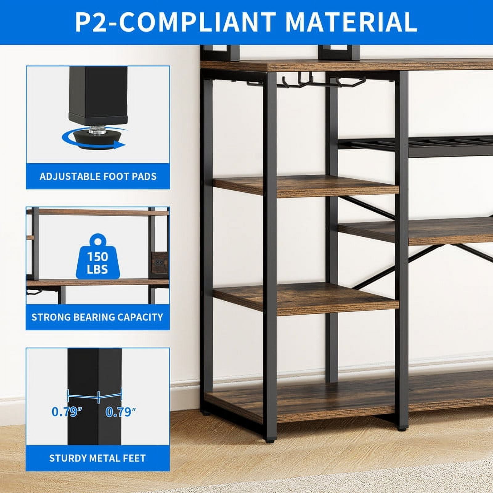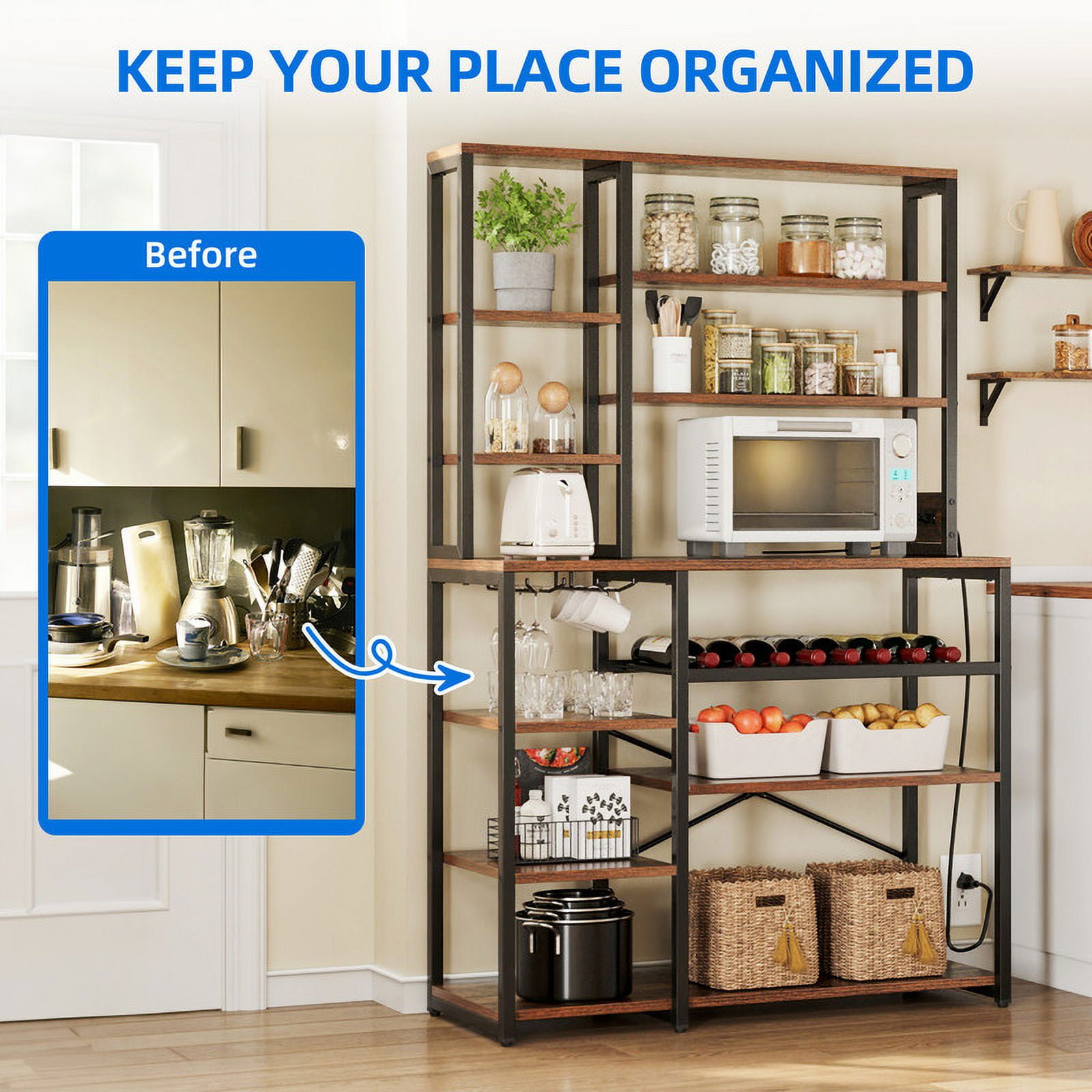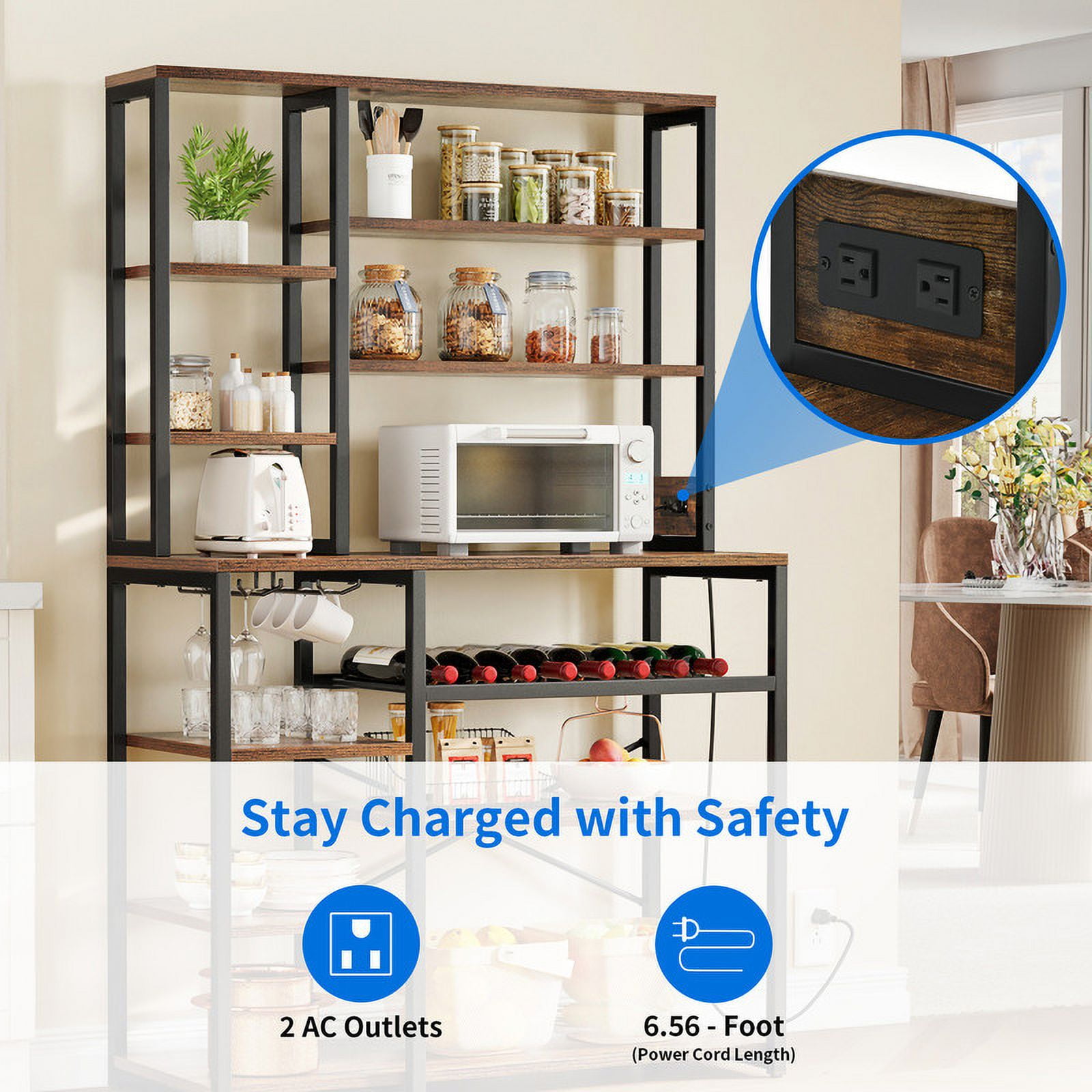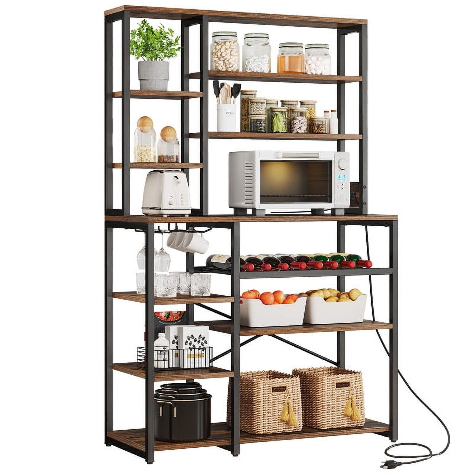 [Bakers Rack with Power Outlets] Equipped with 2 AC power outlets and a 6.56ft power cord to provide power for up to 2 devices simultaneously. Easily charge your devices without the hassle of relocating. [Large Storage Space with Wine Rack & Goblet Holder] The Dextrus kitchen baker rack comes with 8 spacious shelves that provide ample space for storing a variety of kitchen essentials, keeping your vegetables, microwave, and other kitchen accessories at a glance. In addition, it features 8 rows of wine rack and 2 rows of goblet holder to efficiently store the precious red wine and wine glass for daily organize . [Stable Frame with X-shaped Protective Rod ] Made of a premium metal frame and P2 particleboard. The X-shaped protective rod improves the stability of the microwave stand and prevents wobbling or swaying. [Easy Assemble] No need to an expert on the assembly of this baker rack, as it comes with numbered parts and step-by-step instructions to easy install.