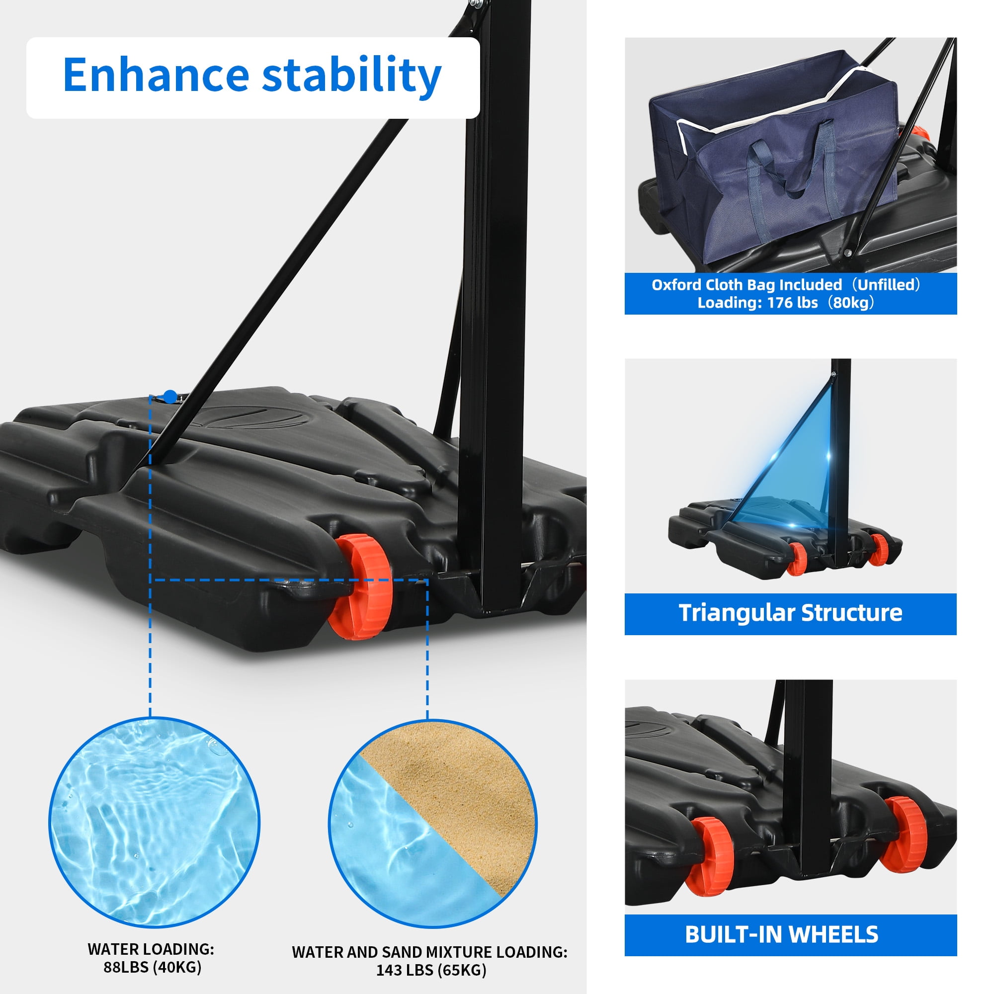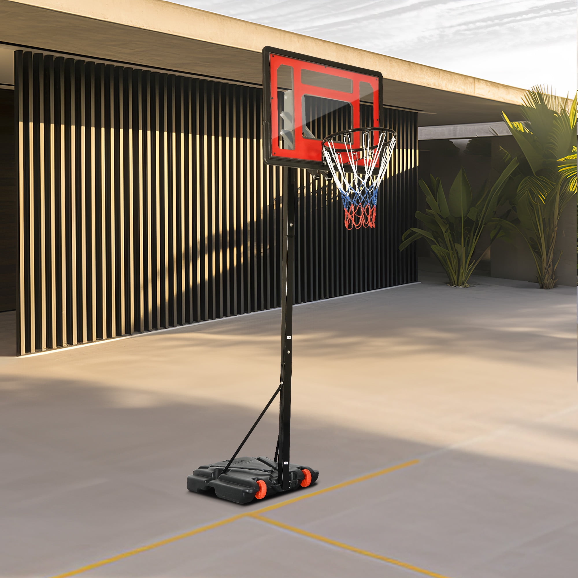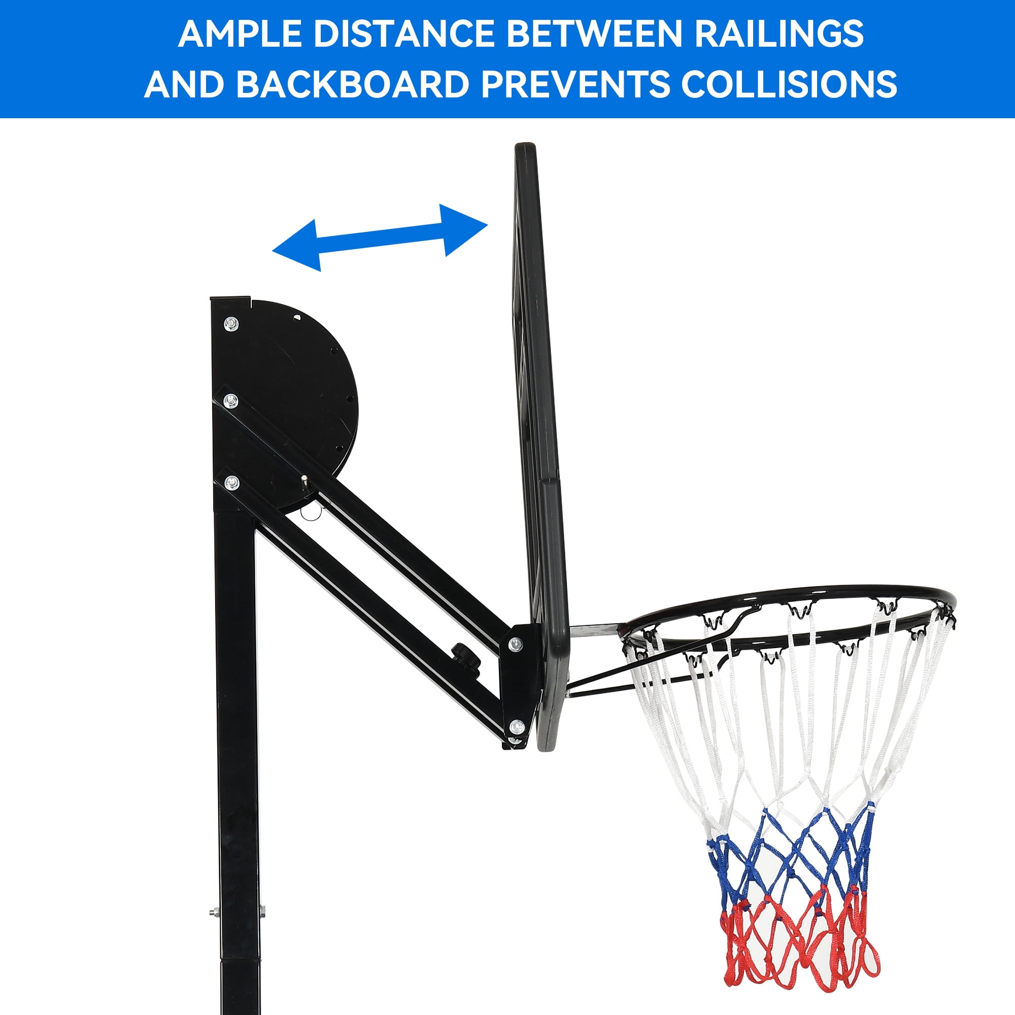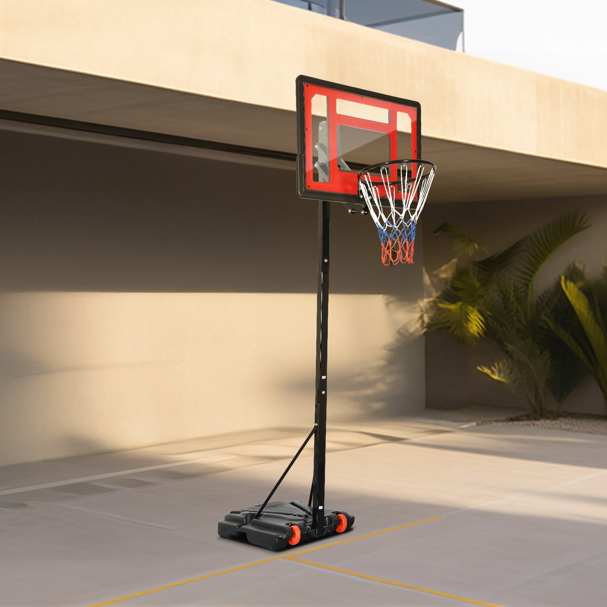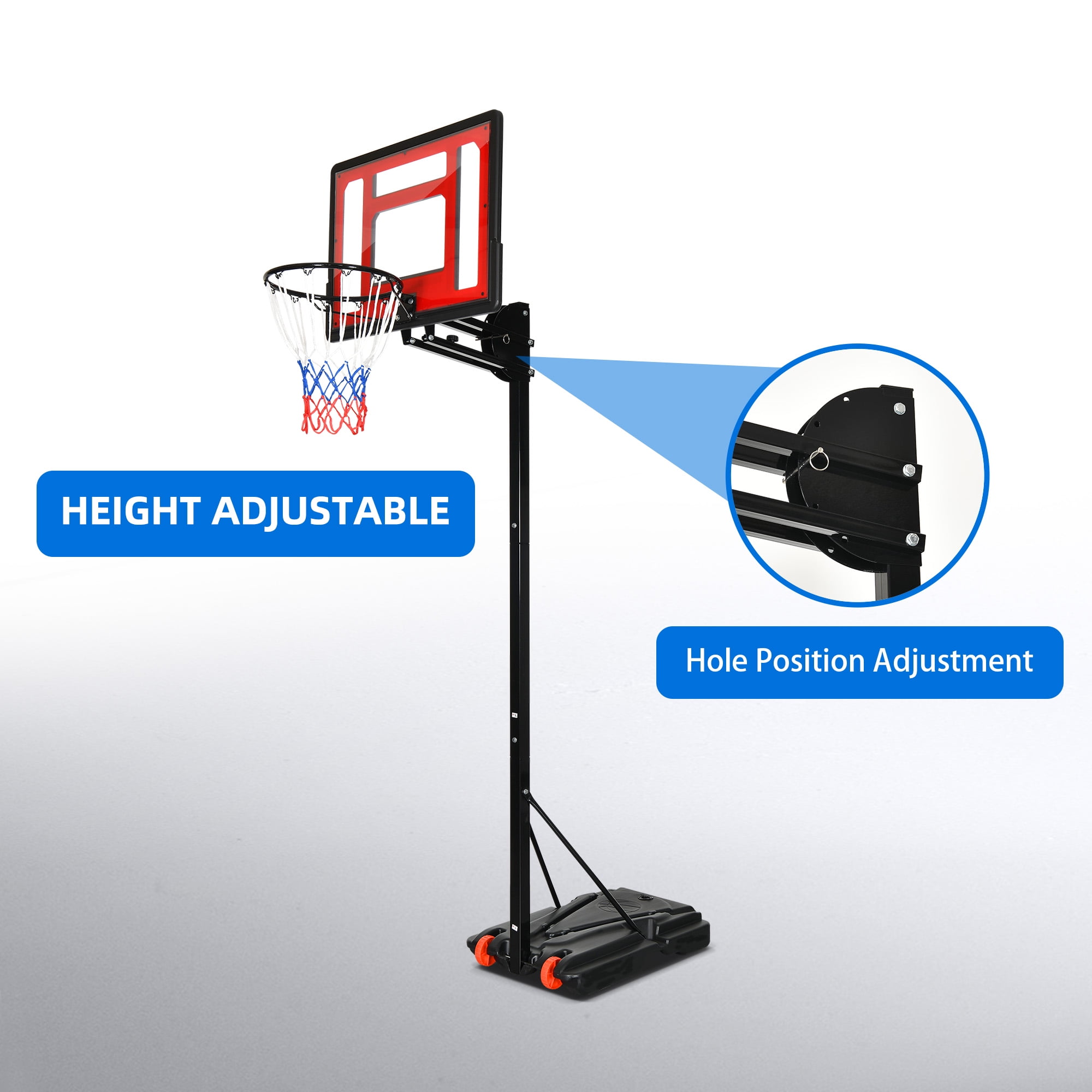 【Safty Design】- We has taken into consideration user safety by ensuring there is sufficient distance between the backboard and the main pole. This prevents any potential injuries from accidentally kicking the main pole while jumping up to shoot. 【Height Adjustable】- This basketball hoop features a hole and rotate adjustment mechanism, allowing for easy height adjustment from 3.4 to 8.5 feet (from the basket to the ground). With 10 gear height adjustments, it is easier to operate and can cater to the needs of different family members in various venues. 【Stable Structure】- The main pole of the basketball portable hoop is constructed with 50×50mm, 1.4mm thick steel pipes, providing a stable and sturdy structure. The base measures 31×22×6 inches and can be filled with water or sand, reaching a weight of 143 pounds. You can enjoy playing without worrying about the hoop tipping over. 【Premium Materials】- This basketball hoop features a shatterproof and highly durable PE backboard, allowing for unrestricted shooting. The main pole is coated with a spray painting technique, effectively preventing rusting and corrosion on the metal surface, ensuring long-lasting use. 【Easy to Set Up】- The packaging box includes everything you need to set up the basketball hoop, along with easy-to-follow instructions. The base is equipped with two wheels, making it convenient to move and set up the hoop anywhere you prefer.