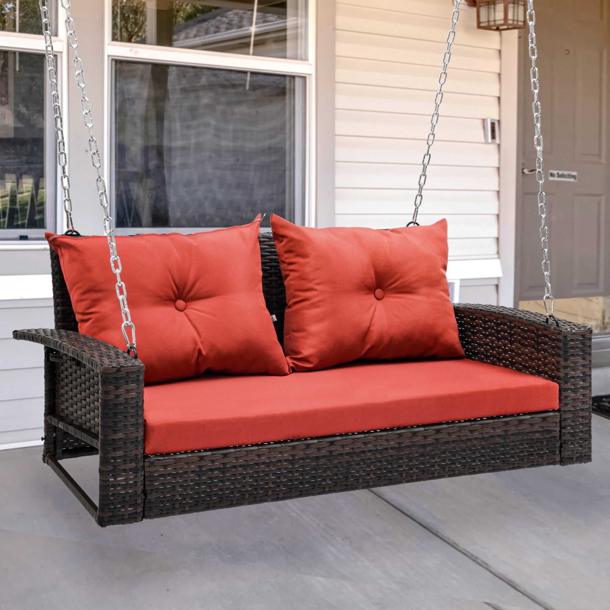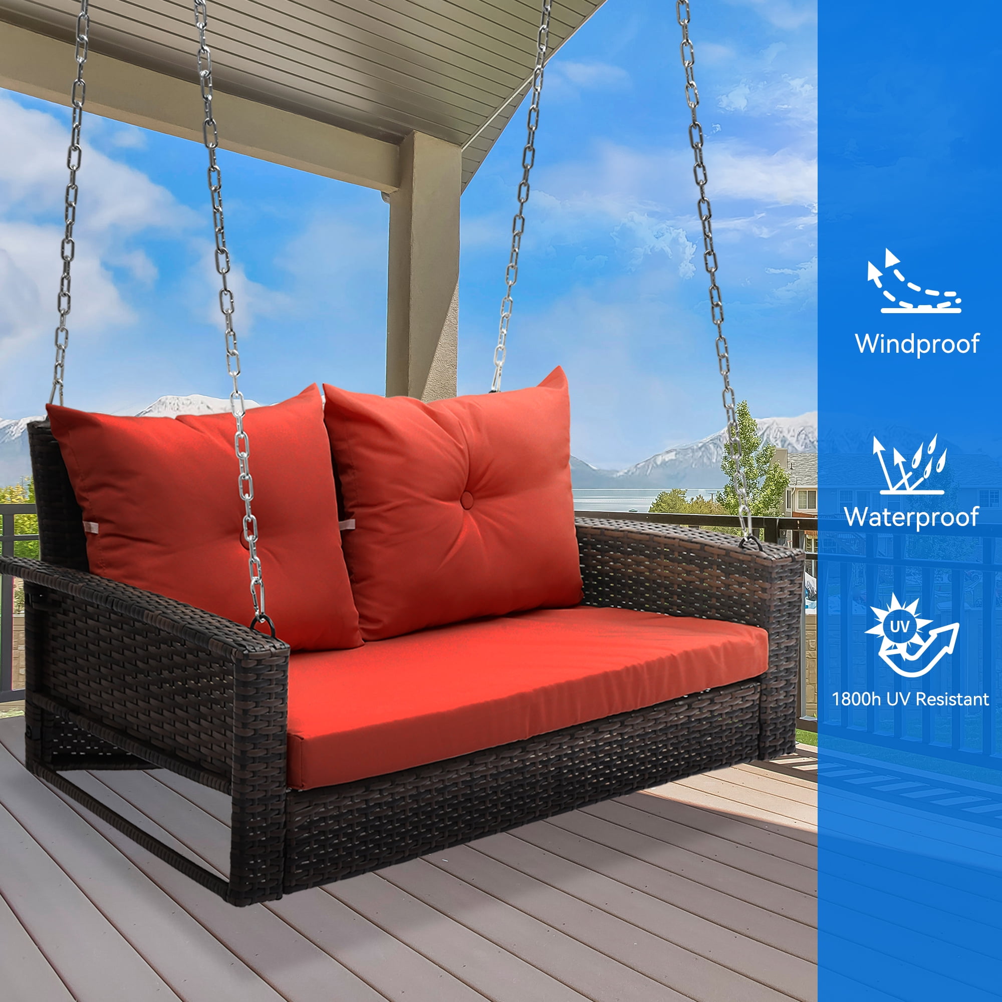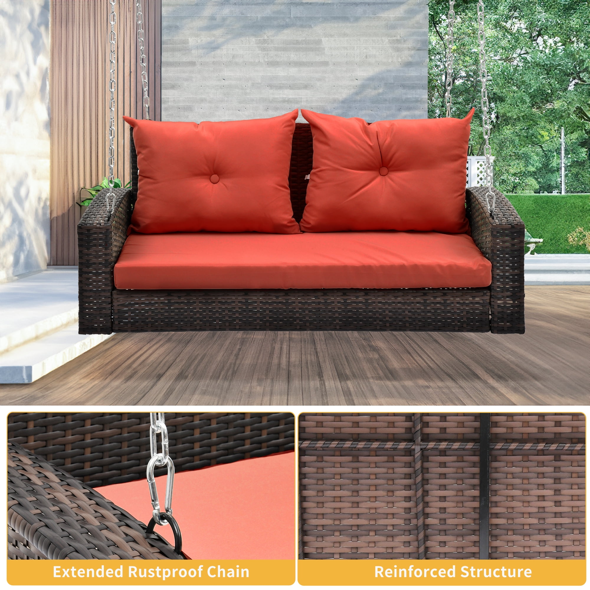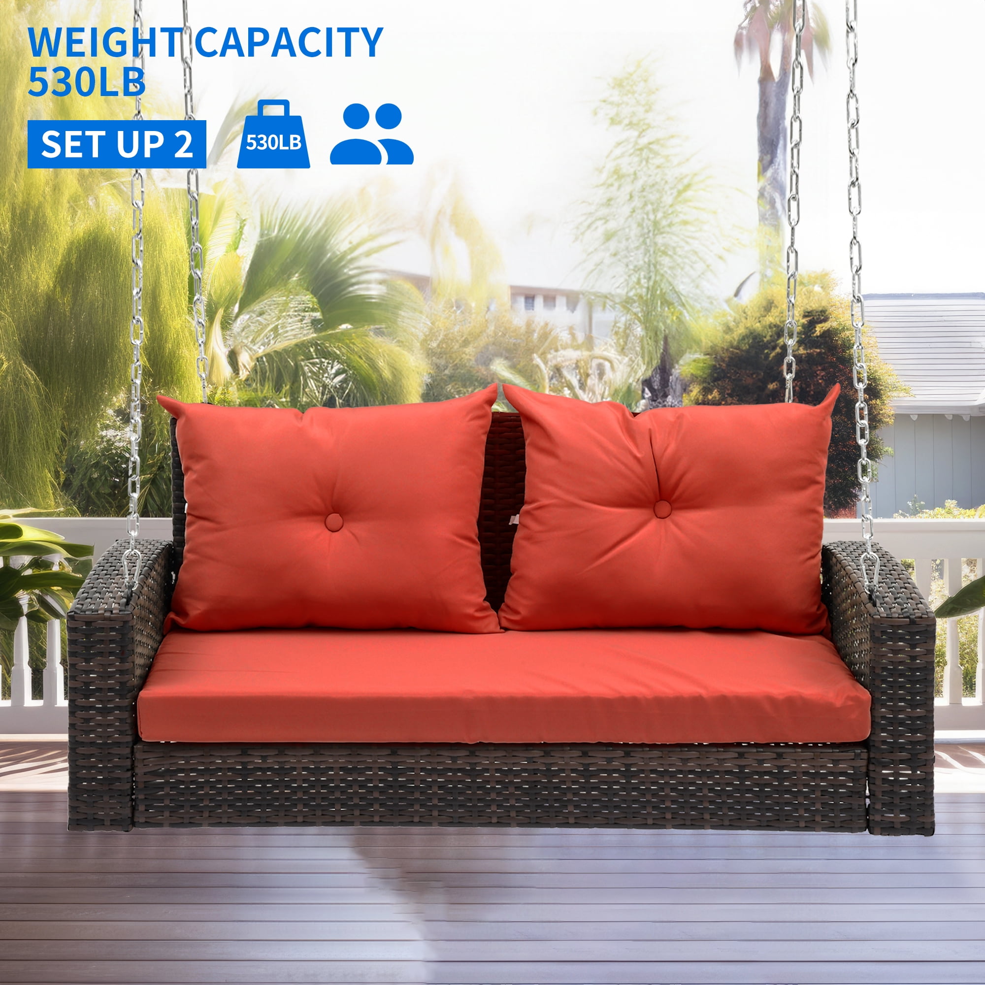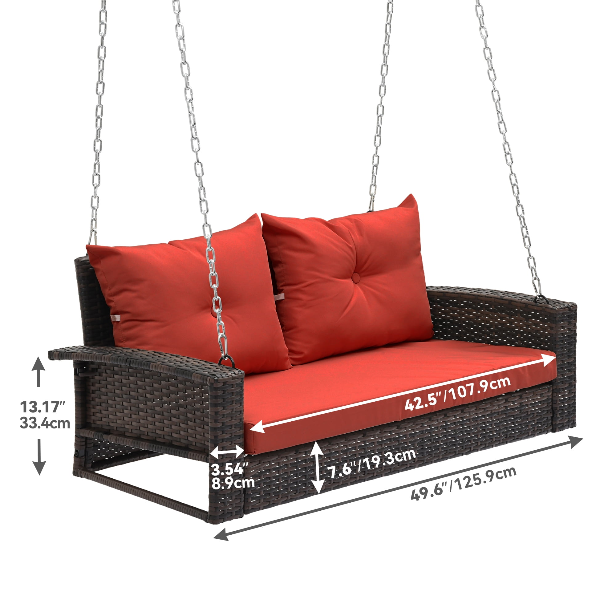 High-Quality Rattan: Made from durable 8MM flat brown rattan, resistant to UV rays for up to 1800 hours, ensuring longevity Extended Chain: Comes with two 118-inch hanging chains, allowing for adjustable height using climbing buckles for optimal comfort Soft Red Cushion: Features a 180g polyester cloth covering with two soft pillows filled with 2.6 pounds of upright cotton for enhanced comfort Strong Capacity: Supports up to 770 pounds, accommodating two adults or three children for shared leisure time Easy to Assemble: Installation can be completed in approximately 30 minutes following the provided instructions; professional installation is recommended for safety