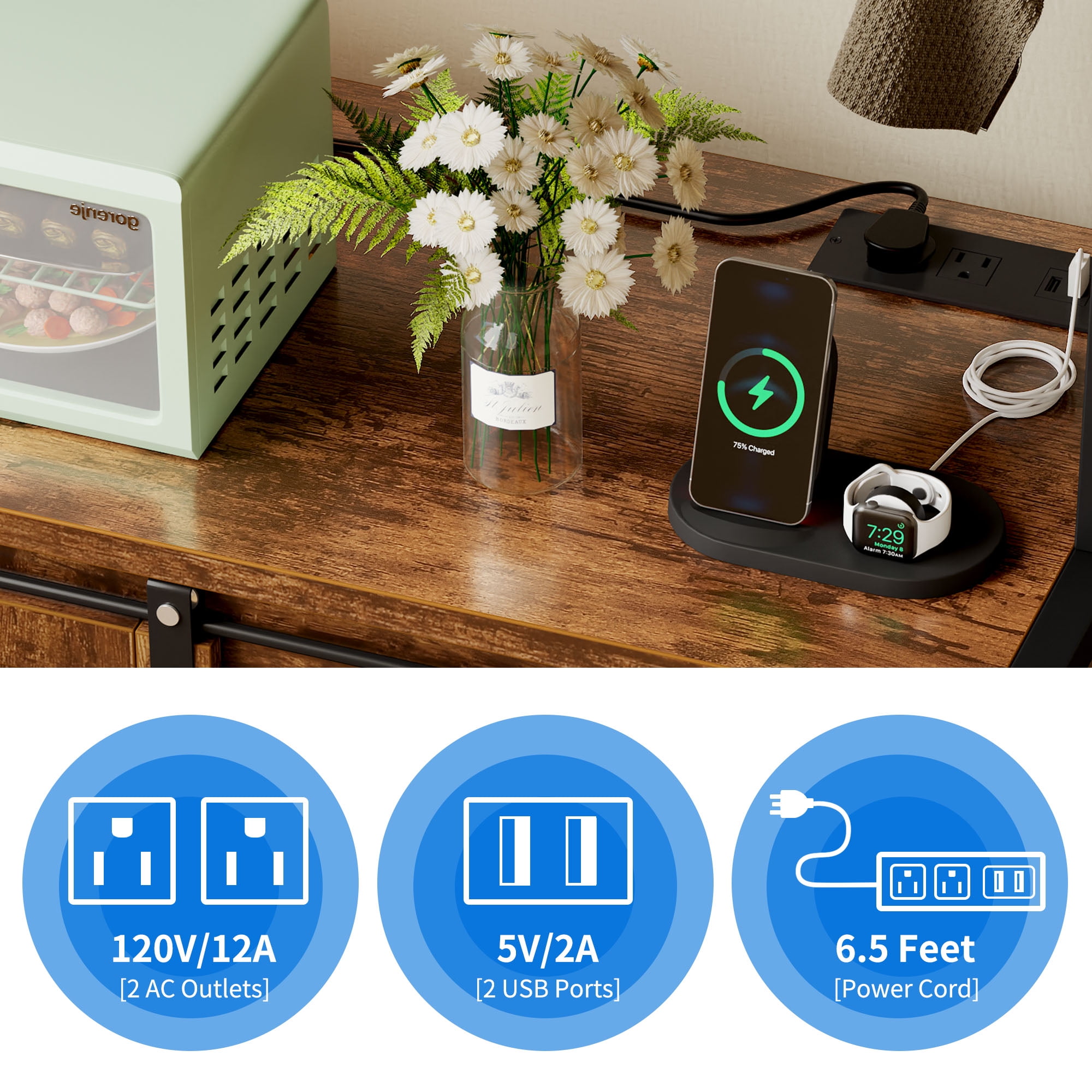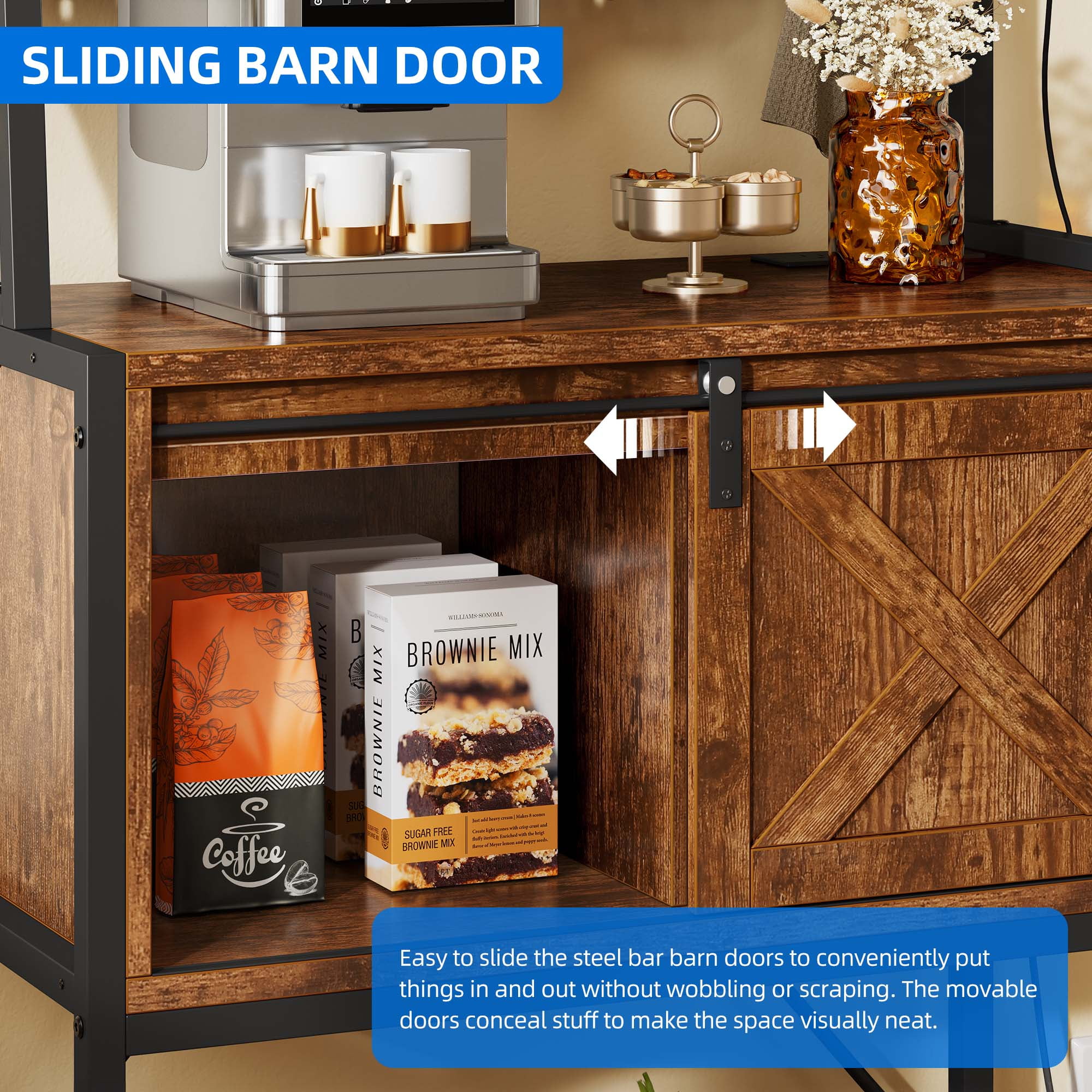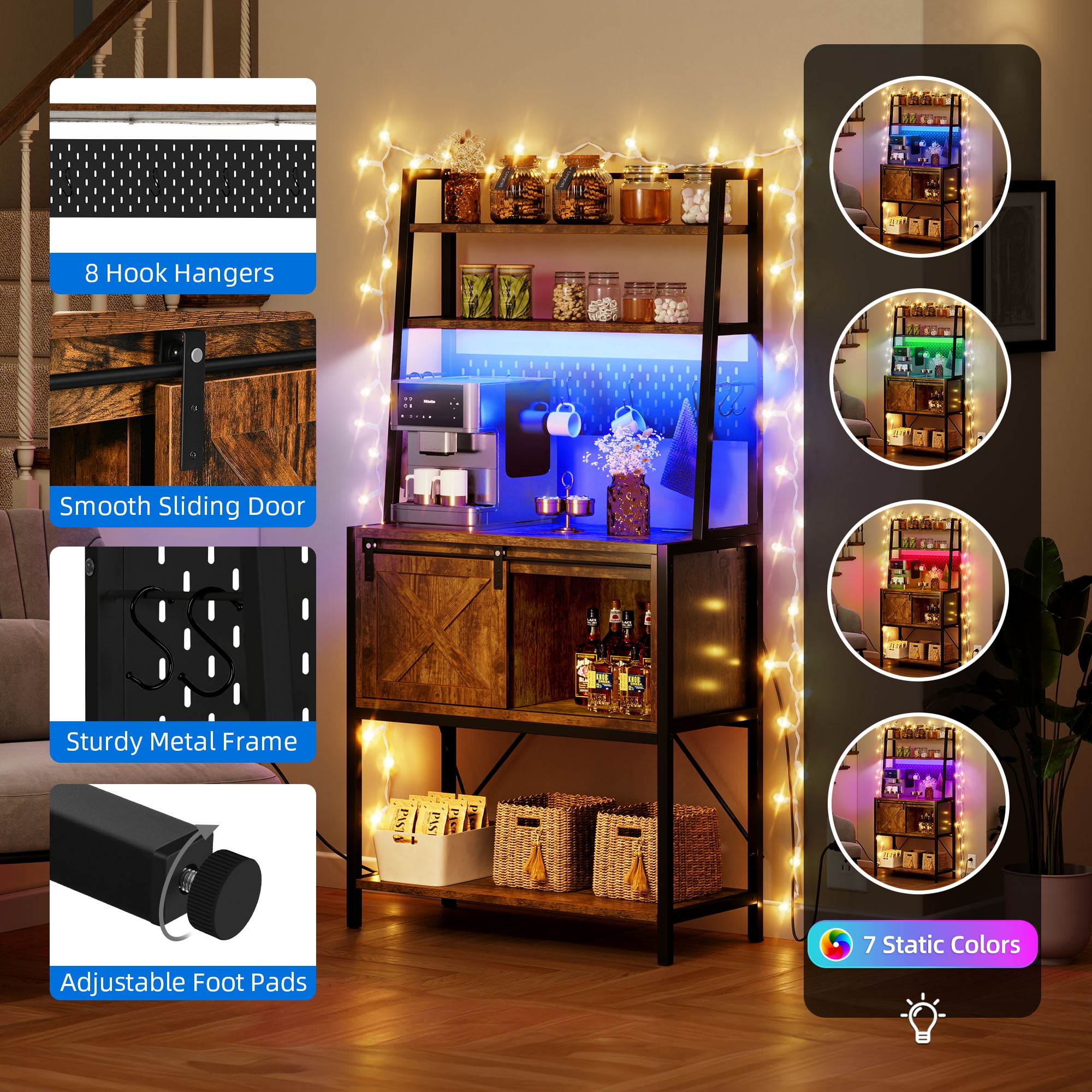 Dextrus Bakers Rack with Power Outlet and Storage Shelf, Bakers Rack Microwave Stand with LED Lights and Sliding Door, Brown