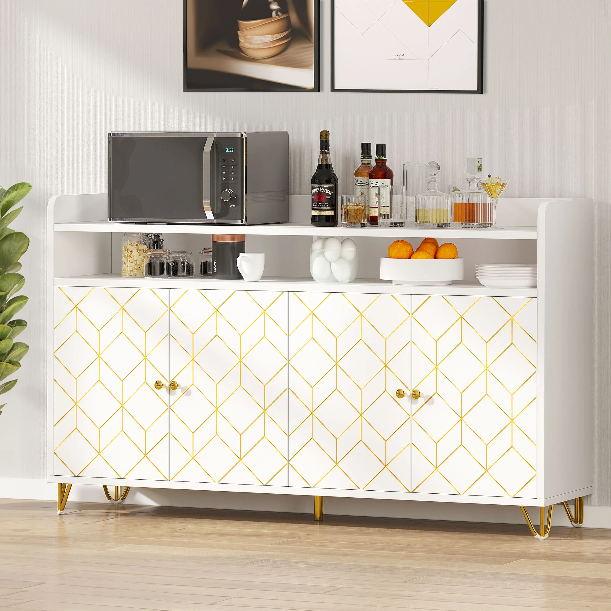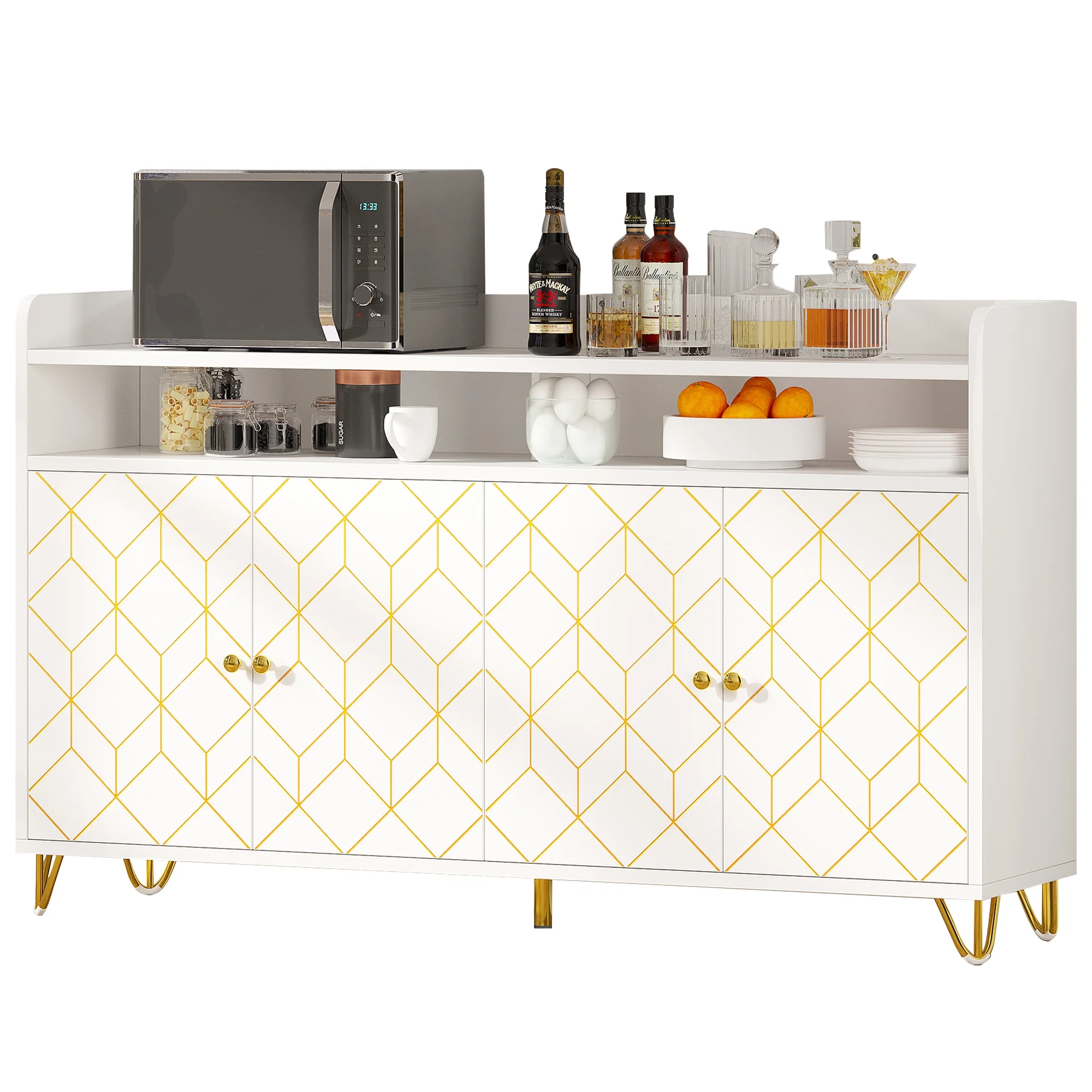 Dextrus Buffet Sideboard Cabinet, 59″ Modern Kitchen Cabinet with Doors & Shelves, White & Gold