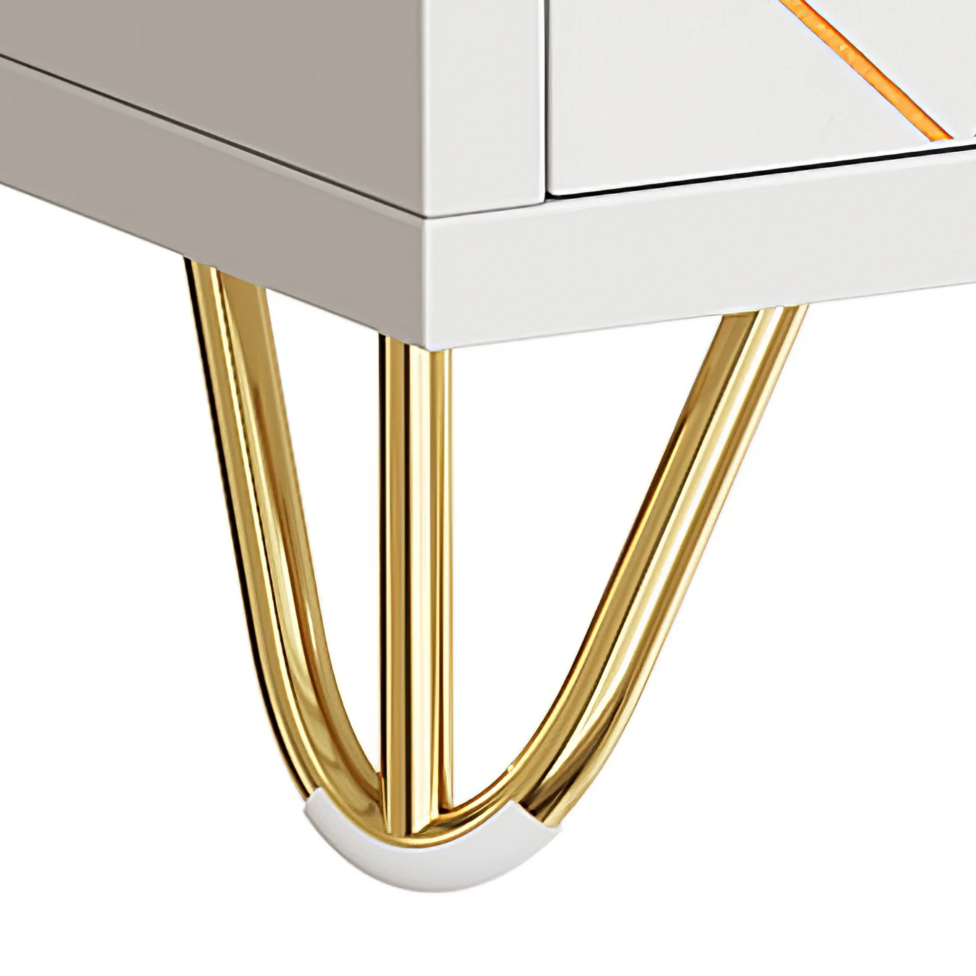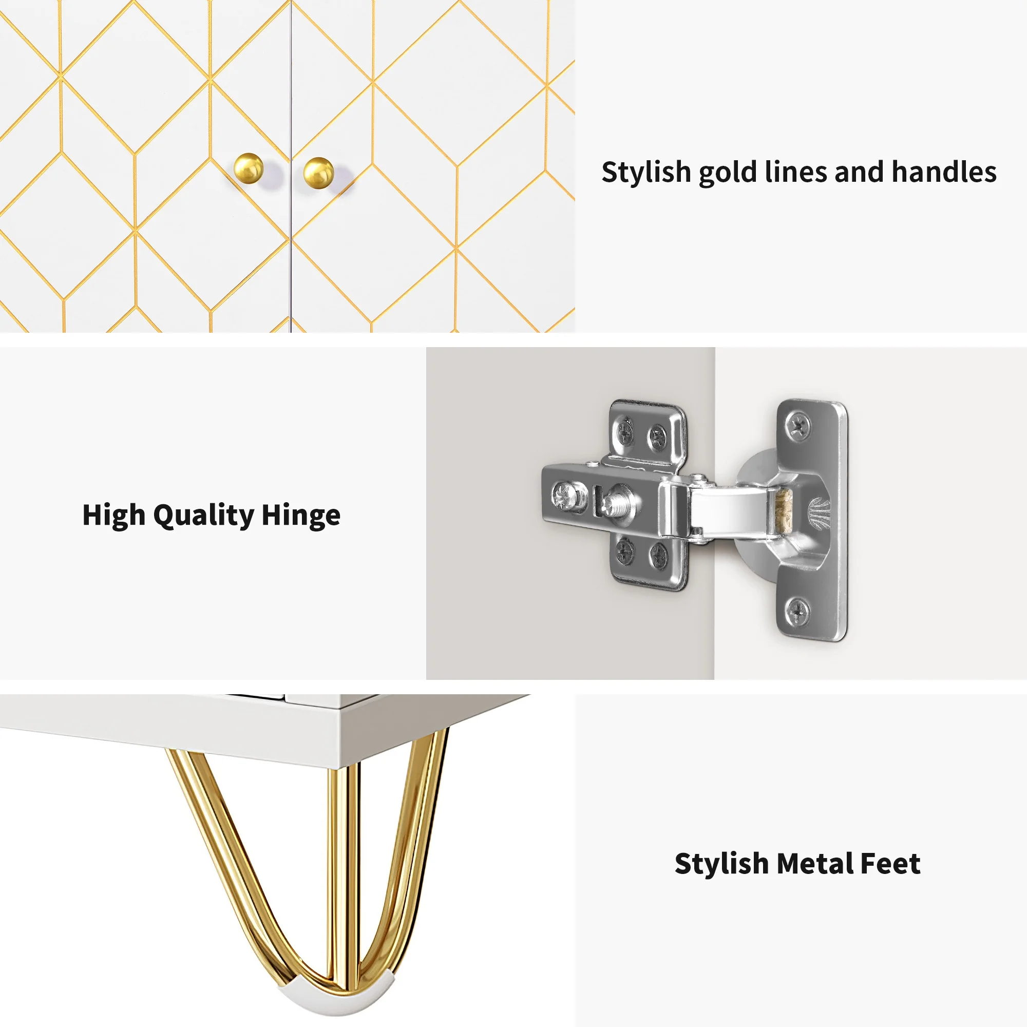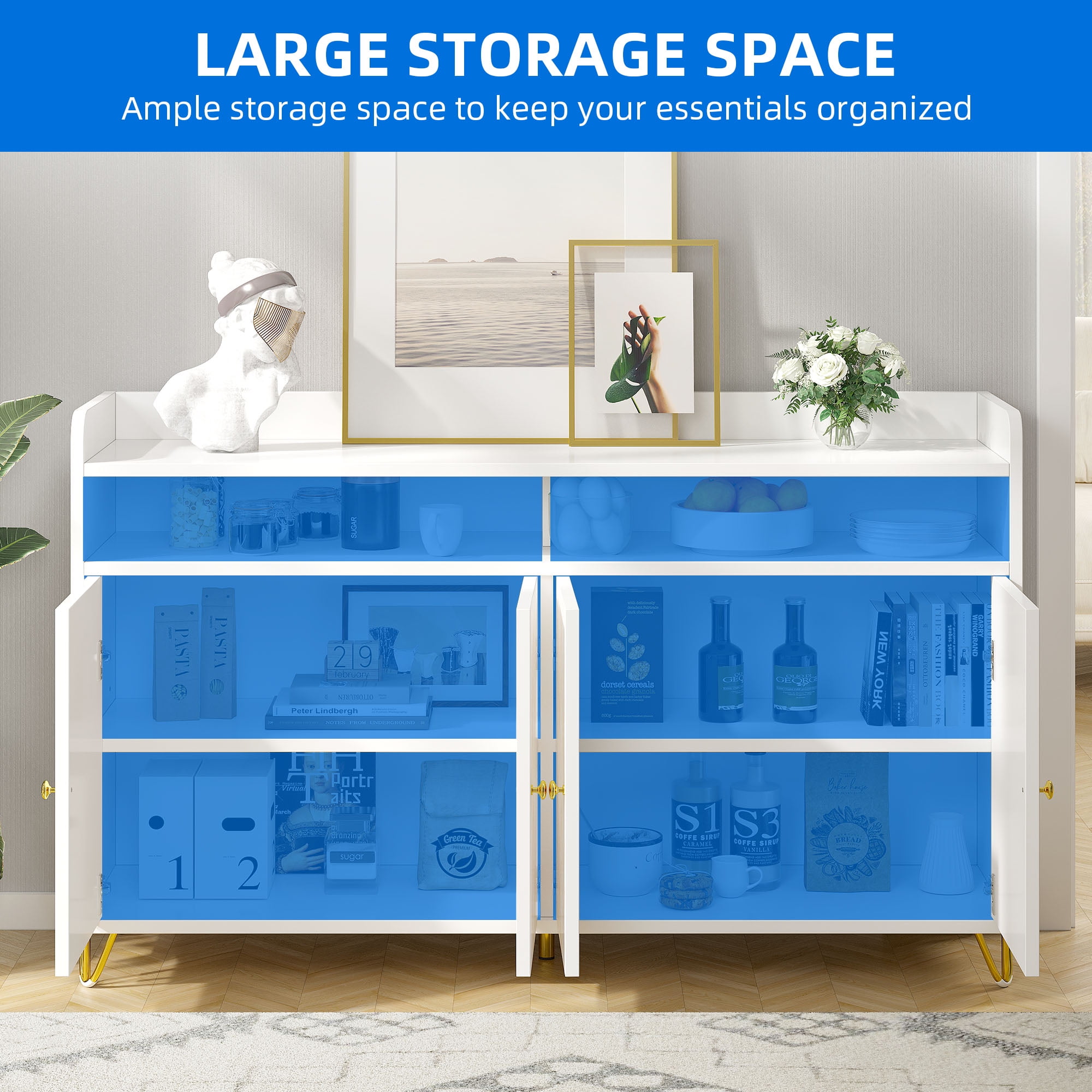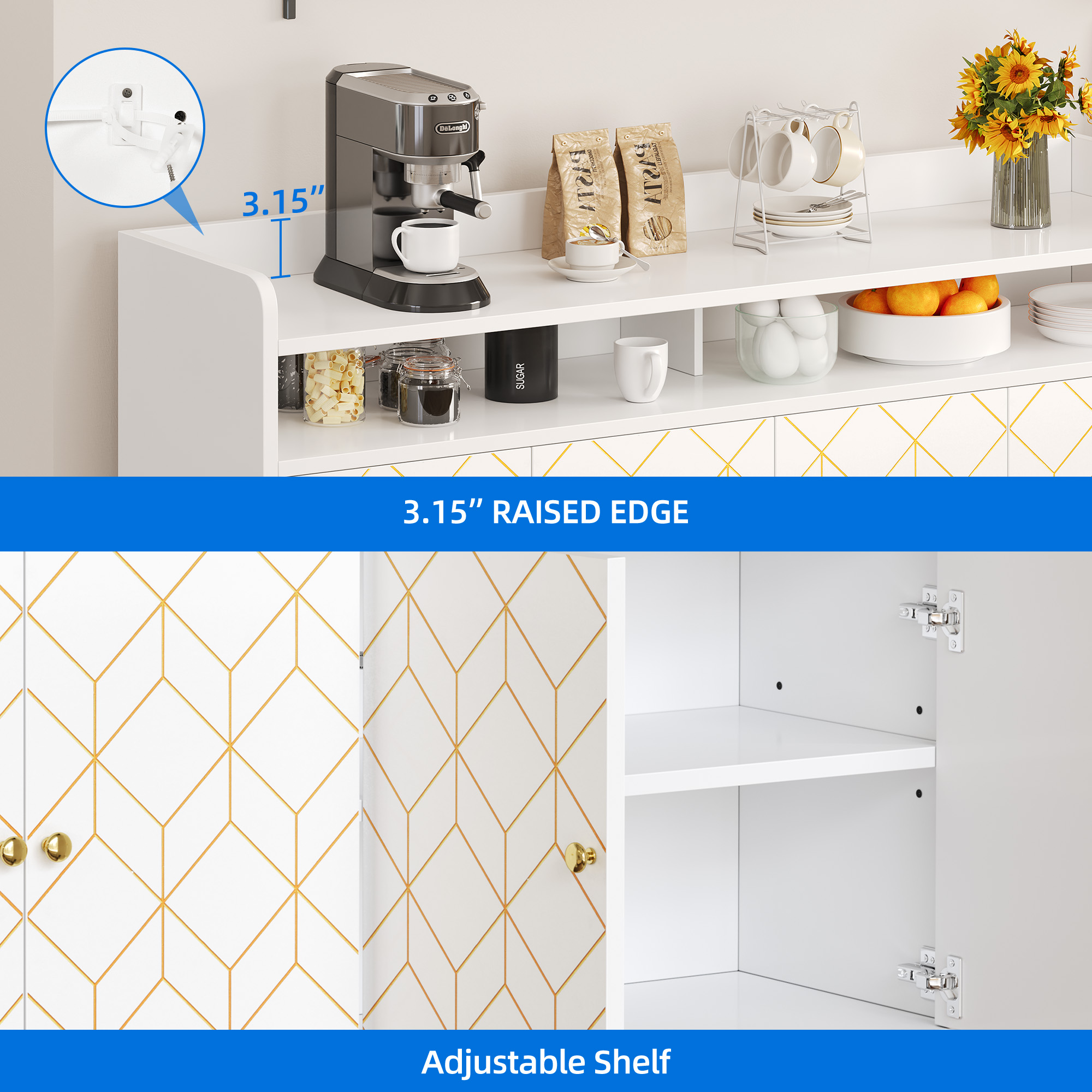 Unique and Chic Gold Trim Design: Our coffee bar cabinet features a hand-drawn gold trim design that adds an extra touch of sophistication and luxury to this stylishly modern piece. This feature would effortlessly complement any home décor style, and be sure to impress in your dining room, living room or kitchen. Generous Storage Capacity: Our cabinet comes with 6 spacious compartments and a large, wide top, providing ample space to store all your belongings. It can hold your coffee machine, plants, kitchen utensils, bathroom supplies, and books. The shelves can also be removed for larger items according to your needs. Practical Multifunctionality: Our multifunctional storage cabinet maximizes your home space while adding a classic touch to any room. It can serve as a coffee bar, kitchen buffet sideboard, bathroom floor cabinet, entryway cabinet, and bedroom storage, matching perfectly with your existing furniture. Enhanced Stability and Safety: Our sideboard cabinet is made with high-quality wood frames and P2 MDF. We also provide four sturdy golden iron legs to ensure stability and support for heavy loads. Plus, anti-tip kits are included, just attach them securely to the wall for added safety and stability, choosing to avoid the unexpected. Effortless Assembly and Maintenance: Our modern white cabinet is straightforward to put together, and cleaning it is a breeze. The components are numbered and easy to identify, ensuring simple assembly. The cabinet is designed with a smooth, flat surface that is easy to maintain, making it an effortless addition to your home.