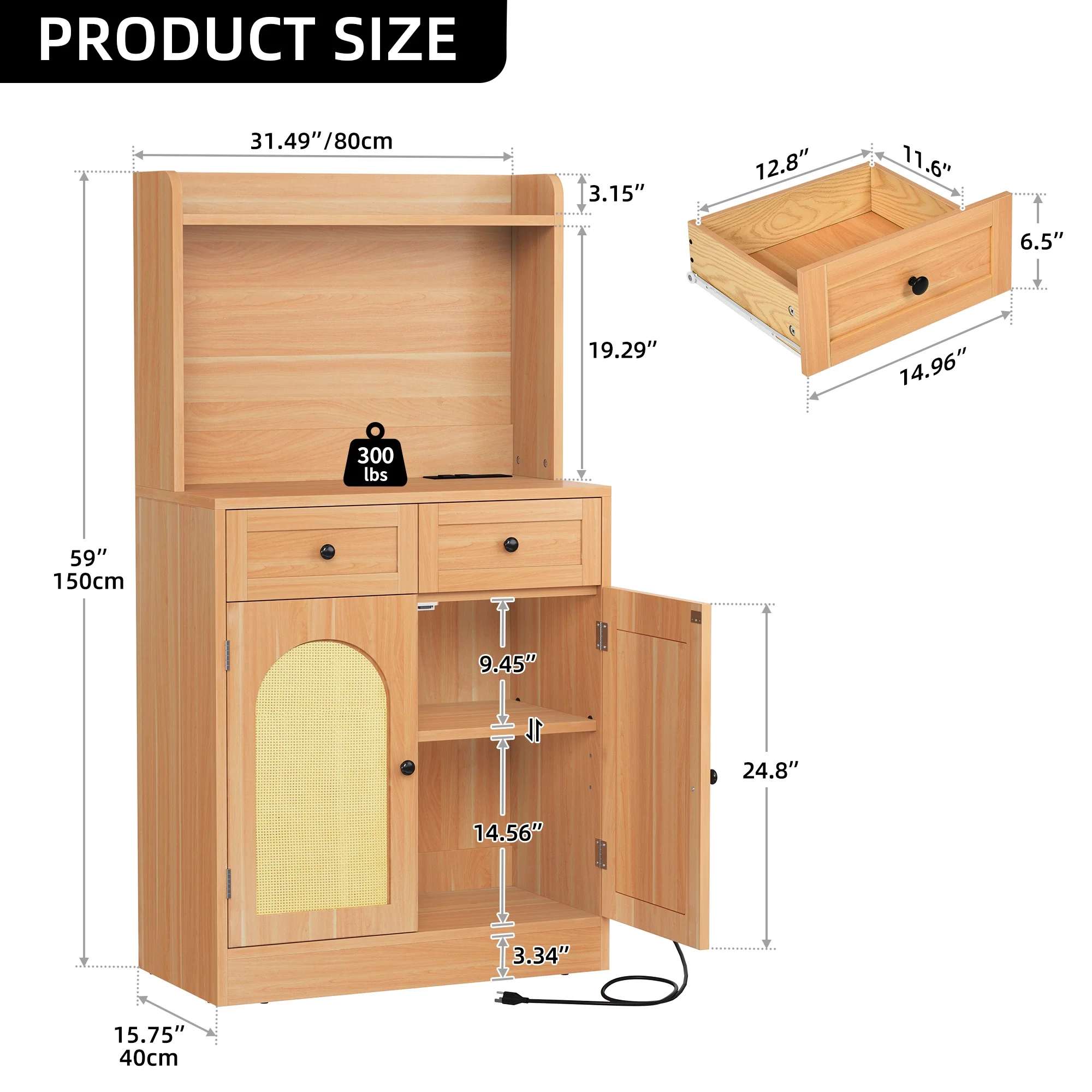 Introducing our Dextrus Sideboard Buffet Storage Cabinet with Power Outlet, a versatile and stylish addition to your living and dining room. This cabinet features a convenient power outlet, allowing you to easily plug in and use small appliances or charge your devices. With two spacious drawers, you can store utensils, linens, or other essentials. The cabinet also includes two rattan decorated doors, adding a touch of texture and elegance to the design. Whether you need a coffee bar cabinet or an accent cupboard, this storage cabinet serves multiple purposes. The natural finish adds warmth and charm to your space, complementing various decor styles. Upgrade your storage options with our Sideboard Buffet Storage Cabinet and enjoy a functional and visually appealing piece for your home. Specifications: Color: Natural Material: Engineered Wood,Rattan Item Dimensions: 15.7″L x 15.7″W x 15.7″H Item Weight: 87.08 Pounds Shape: Rectangle Number of Doors: 2 Number of Drawers: 2 Style: Farmhouse, Modern Recommended Uses For Product: Tea & Coffee Bar, Home Bar, Tools, Art & Crafts Feature: Adjustable Shelf Package Included: 1 x Sideboard Buffet Storage Cabinet 1 x Instruction Manual