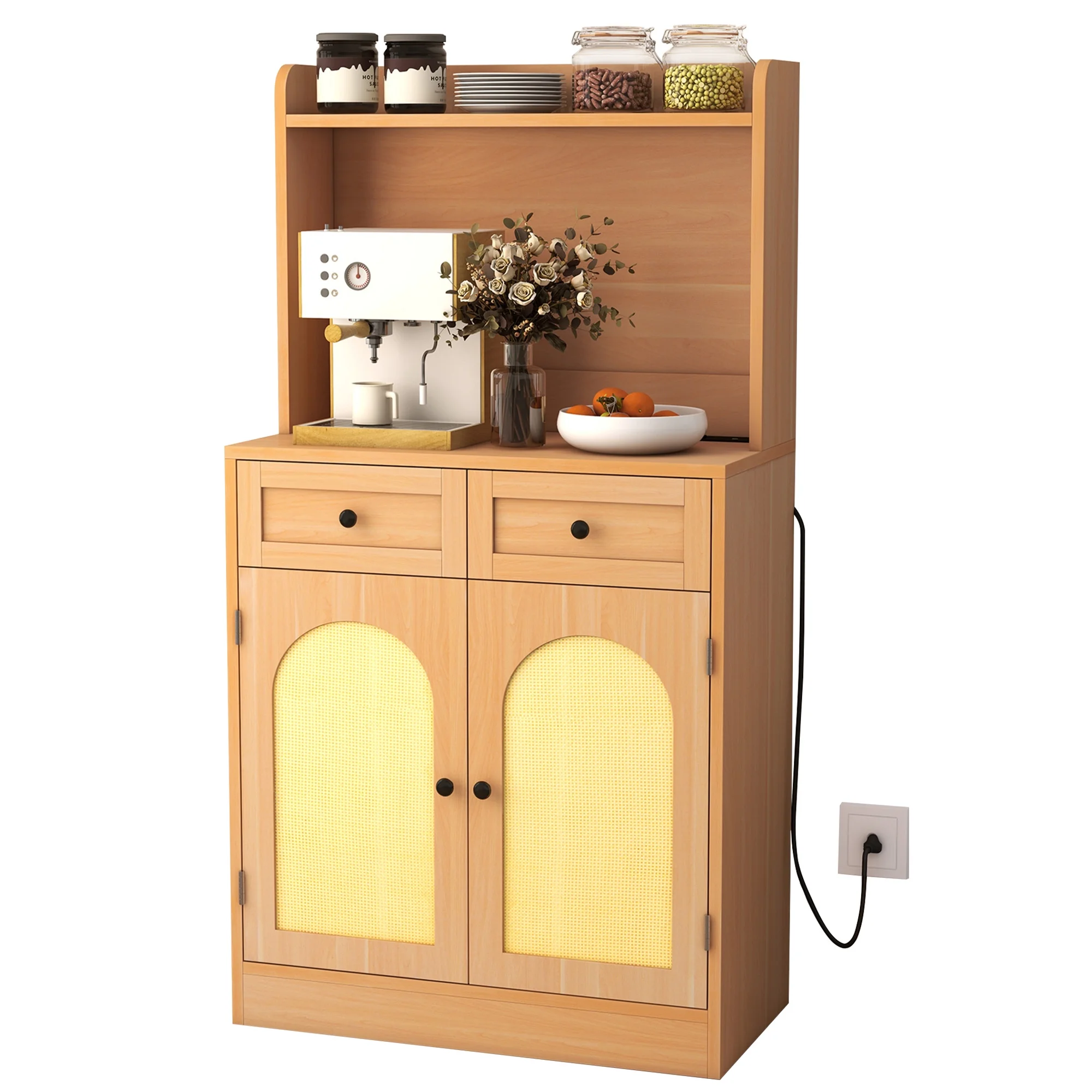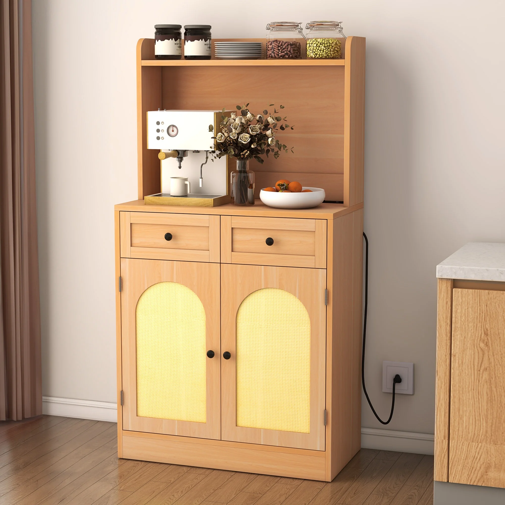 DEXTRUS Buffet Cabinet with Drawers & Power Outlet, Rattan Kitchen Pantry Cabinet, Natural