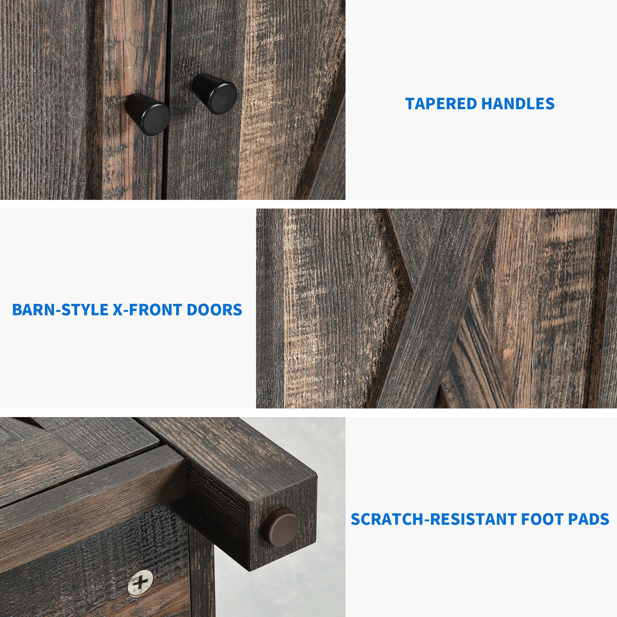 Spacious Storage Capacity: The kitchen storage cabinet features four doors with an adjustable shelf, providing ample space for storing coffee beans, spices, and other essentials. The wide tabletop offers a convenient area for displaying your microwave, toaster, and coffee makers. Charming Farmhouse Style: Combining exquisite wood grain and antique metal accents, this sideboard cabinet exudes a rustic charm that complements cottage, coastal, and modern farmhouse styles. The X-design barn-inspired silhouettes add a touch of glamour to your home decor. Versatile Functionality: This storage cabinet serves multiple purposes. Besides being a buffet cabinet, it can also be used as a coffee bar cabinet in your living room, a TV stand, or a console table in the hallway for showcasing family photos and decor. Reliable and Sturdy: Designed with safety in mind, this storage cabinet features an anti-toppling design. It is equipped with individual table legs at the bottom center and four metal corner protectors on the tabletop, ensuring exceptional stability and durability. Its sophisticated design adds elegance to any space while guaranteeing long-lasting quality. Easy Assembly and Cleaning: The buffet cabinet comes with clear and detailed instructions, numbered parts, and all the necessary tools for easy assembly. Cleaning is a breeze with just a wet rag. We are dedicated to providing the best products and services, so please don’t hesitate to reach out to us if you have any questions or concerns.