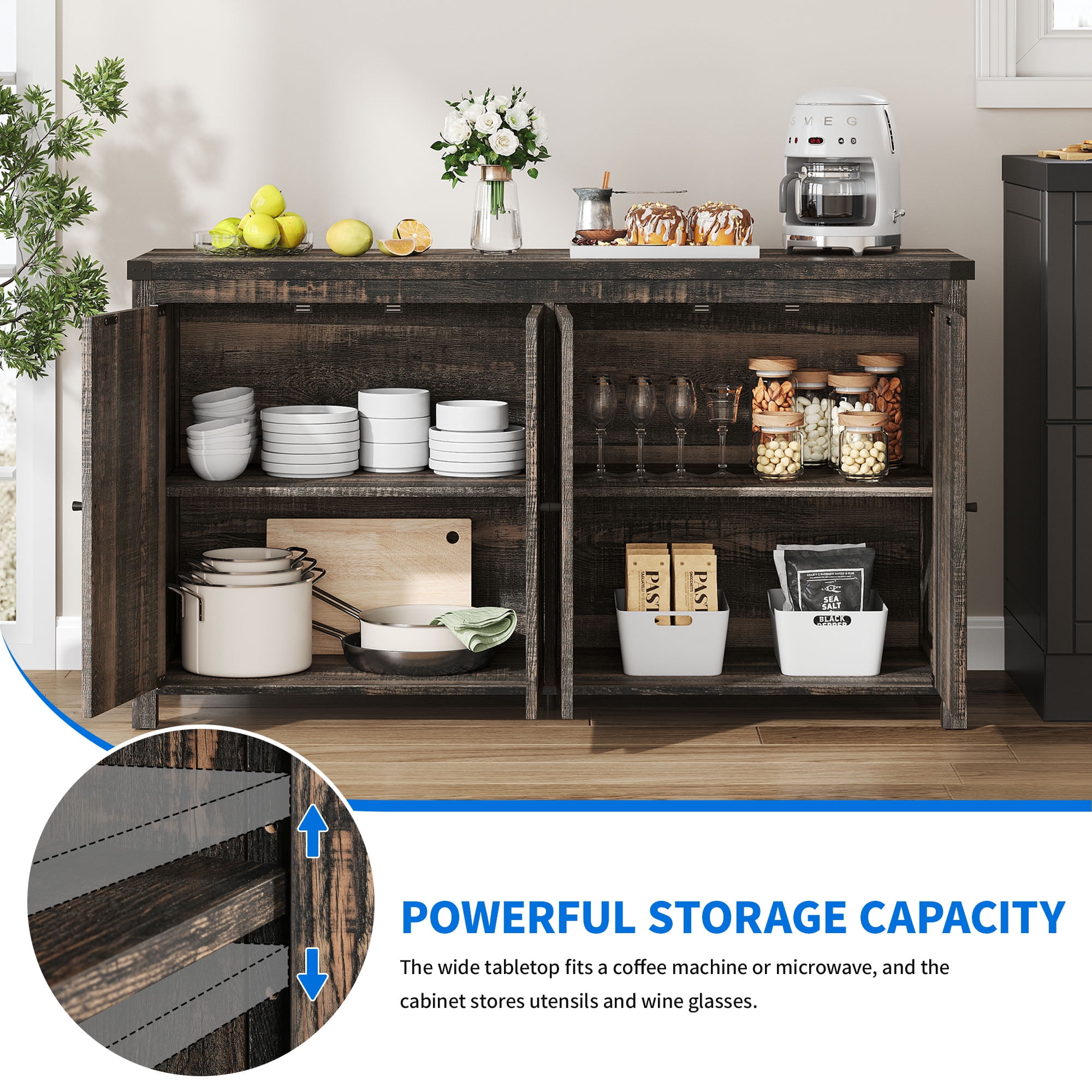 DEXTRUS 4-Door Farmhouse Coffee Bar Cabinet with Adjustable Shelf, Dark Gray