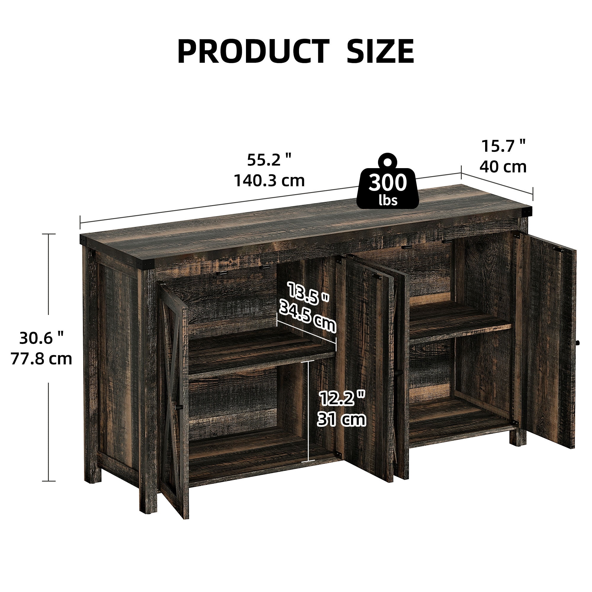 Introducing the Farmhouse Buffet Sideboard, a sophisticated and versatile storage cabinet designed to enhance the ambiance of your dining room, living room, or bedroom. Featuring four elegantly crafted doors, this storage cabinet offers ample space for all your organizational needs. Whether you envision it as a stylish coffee bar or a functional buffet sideboard, this piece seamlessly combines form and function. Constructed with durability in mind, it is built to withstand the test of time. Furthermore, its easy-to-clean surface ensures hassle-free maintenance. With its straightforward assembly process, you can effortlessly set up this sideboard cabinet and transform any space into a haven of organization and style. Adjustable Shelves:55″W Wood Storage Sideboard with 2 adjustable Shelves in 3 height adjust ways that you can store the different sizes things in the cabinet. The 55″W Wood Storage Sideboard with 4 X pattern Doors that are magnetic doors.And X pattern design add a retro farmhouse style.And now we has many color for your choose,such as natural wood color,retro wood color, modern farmhouse White/brown.There is always one that is your favorite. High-quality Materials:This Nightstand is made of MDF wood, which is moisture-proof, anti-corrosion, wear-resistant and high-temperature resistant.And the weight capacity of the sideboard is 300lbs that can store many things in there. Specification: Overall Size: 55.12″ L* 15.35″ W* 30.5″ H Base Material: Manufactured Wood Adult Assembly Required: Yes Number of Doors: 3 Packaging Includes: 1 x Buffet Sideboard 1 x Accessory Kit 1 x Manuals